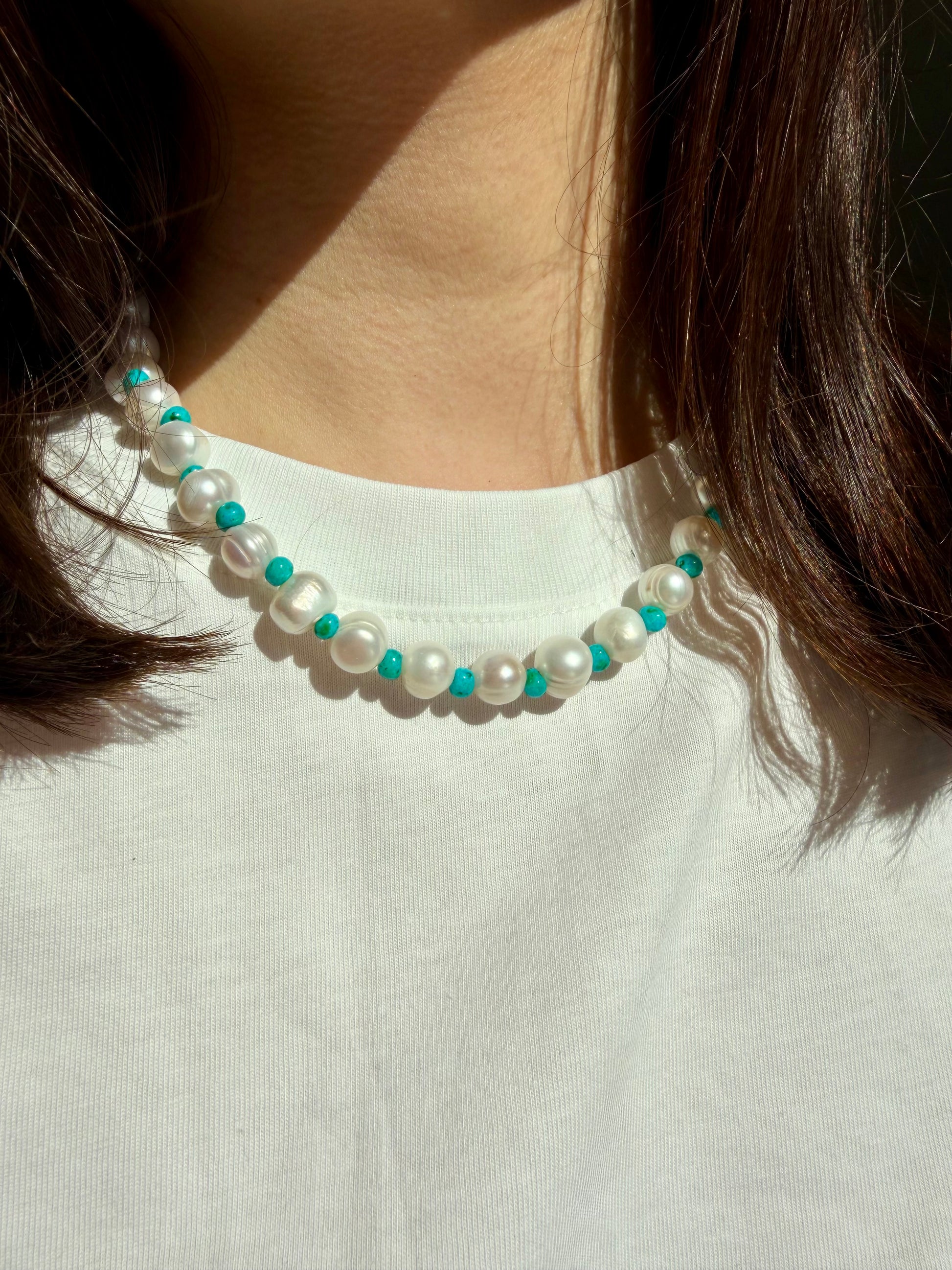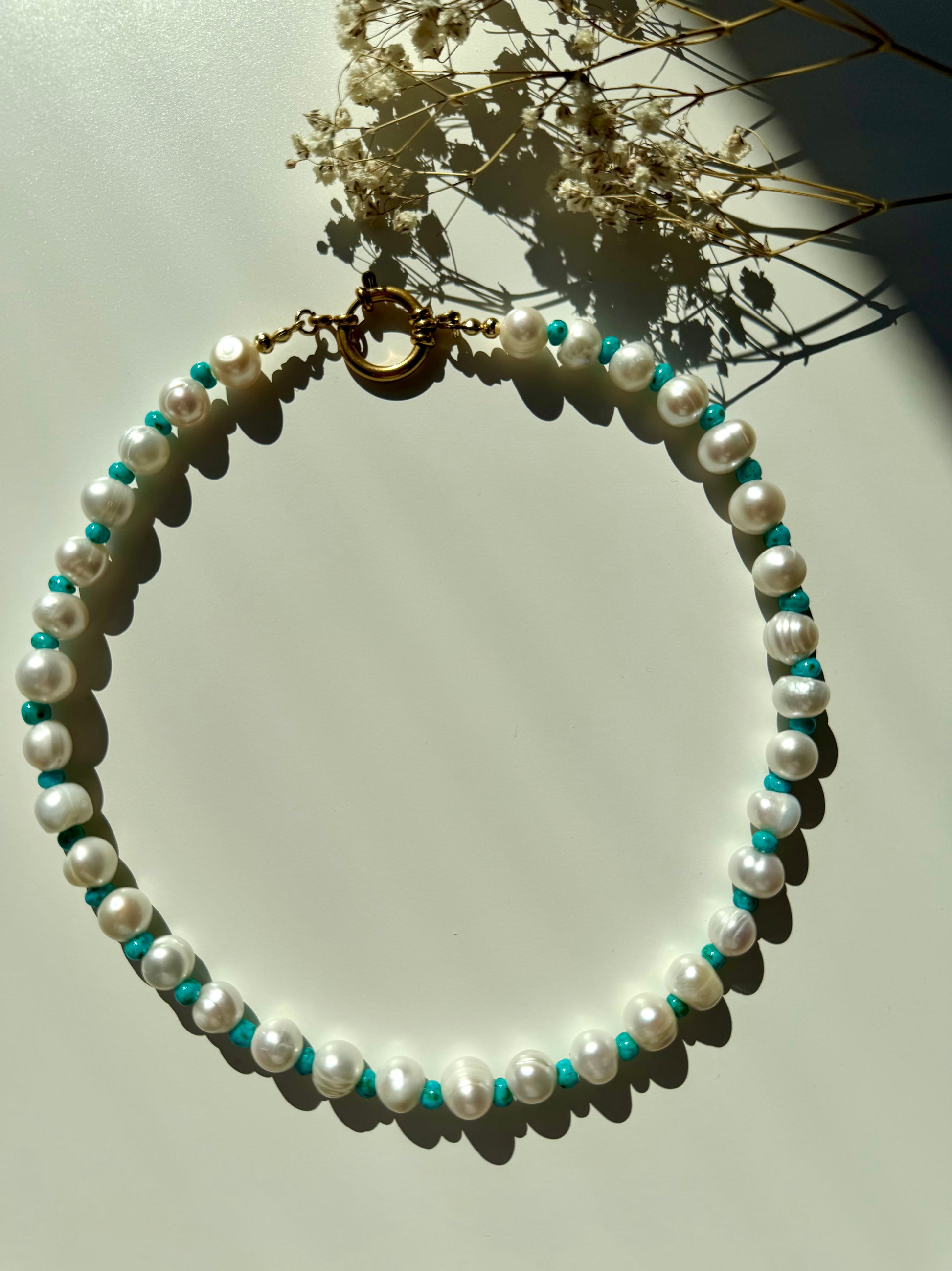 Die Halskette „Aqua Pearl“ verbindet klassische Süßwasserperlen mit frischen, lebendigen Farbakzenten. Die türkisfarbenen Glasperlen erinnern an klares Wasser und setzen einen modernen Kontrast zu den weichen, schimmernden Perlen. Das Zusammenspiel wirkt leicht, sommerlich und elegant – ein zeitloses Schmuckstück mit frischem Charakter.