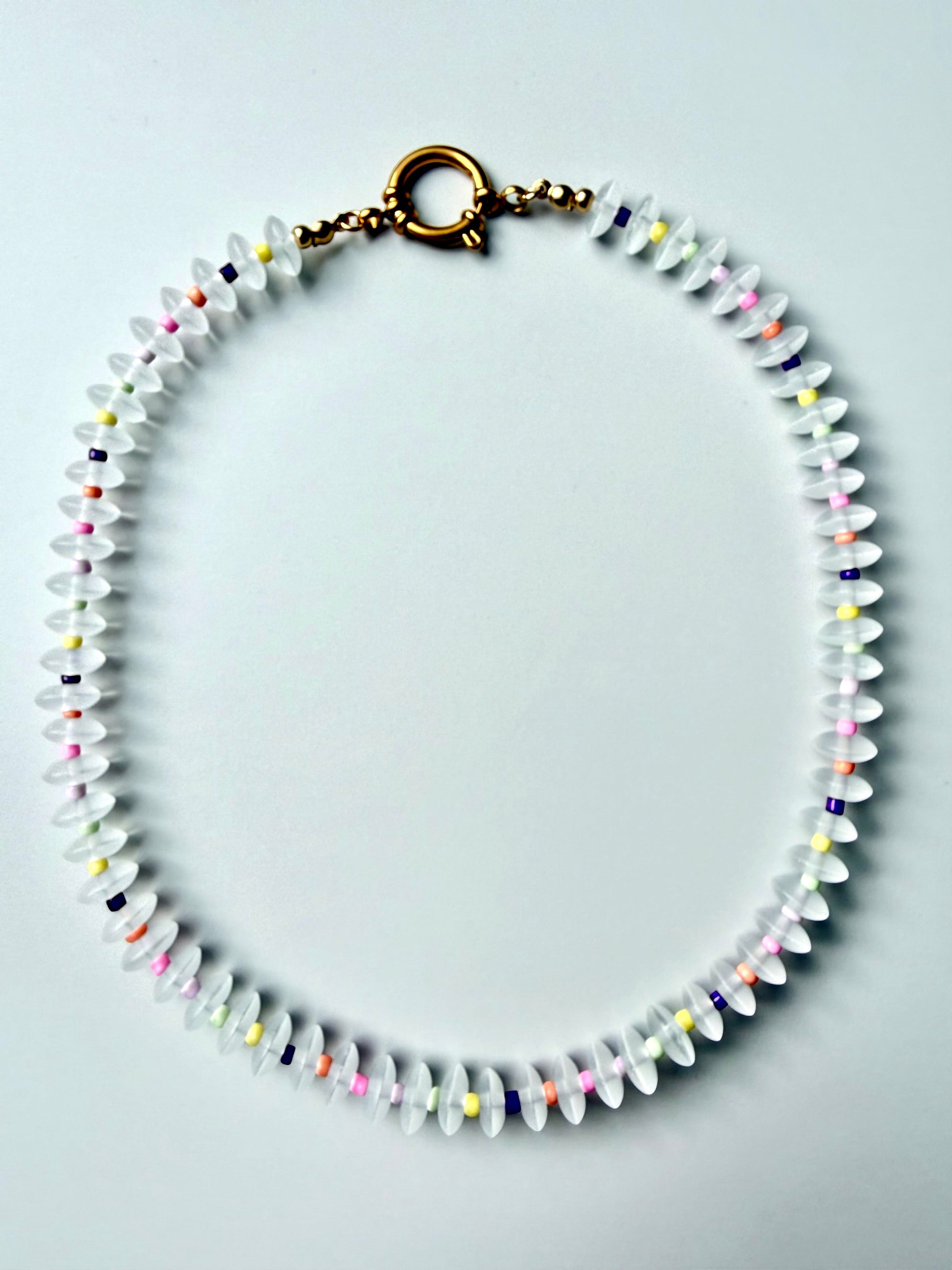 „Candy Frost“ kombiniert matte Quarz Rondell-Perlen in sanftem Frost-Look mit kleinen farbigen Glasakzenten in Pastell. Zarte Töne wie Flieder, Gelb, Mint, Rosa und Apricot setzen spielerische Highlights zwischen den weiß-matten Quarzperlen. Die Kette wirkt modern, leicht und frisch – perfekt für minimalistische Looks mit einem Hauch Farbe. Solo getragen ein dezentes Statement, im Layering ein softer Blickfang.