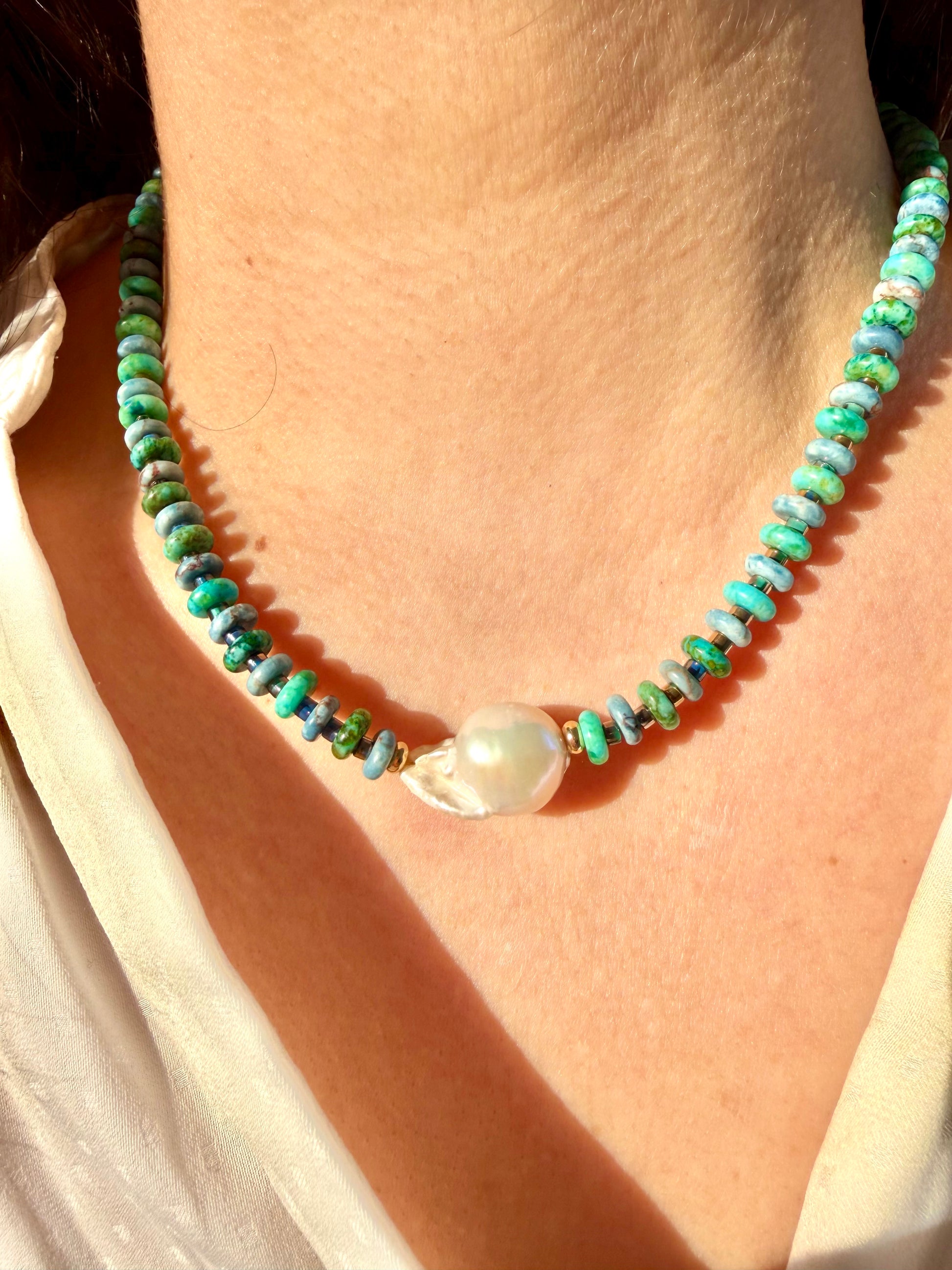 The "Lagoon Pearl" necklace combines cool, shimmering turquoise and green tones with a striking freshwater pearl at its center. The natural gemstone beads lend the necklace a light, summery feel, while the pearl adds a calm, elegant touch – perfect for everyday wear and special occasions.