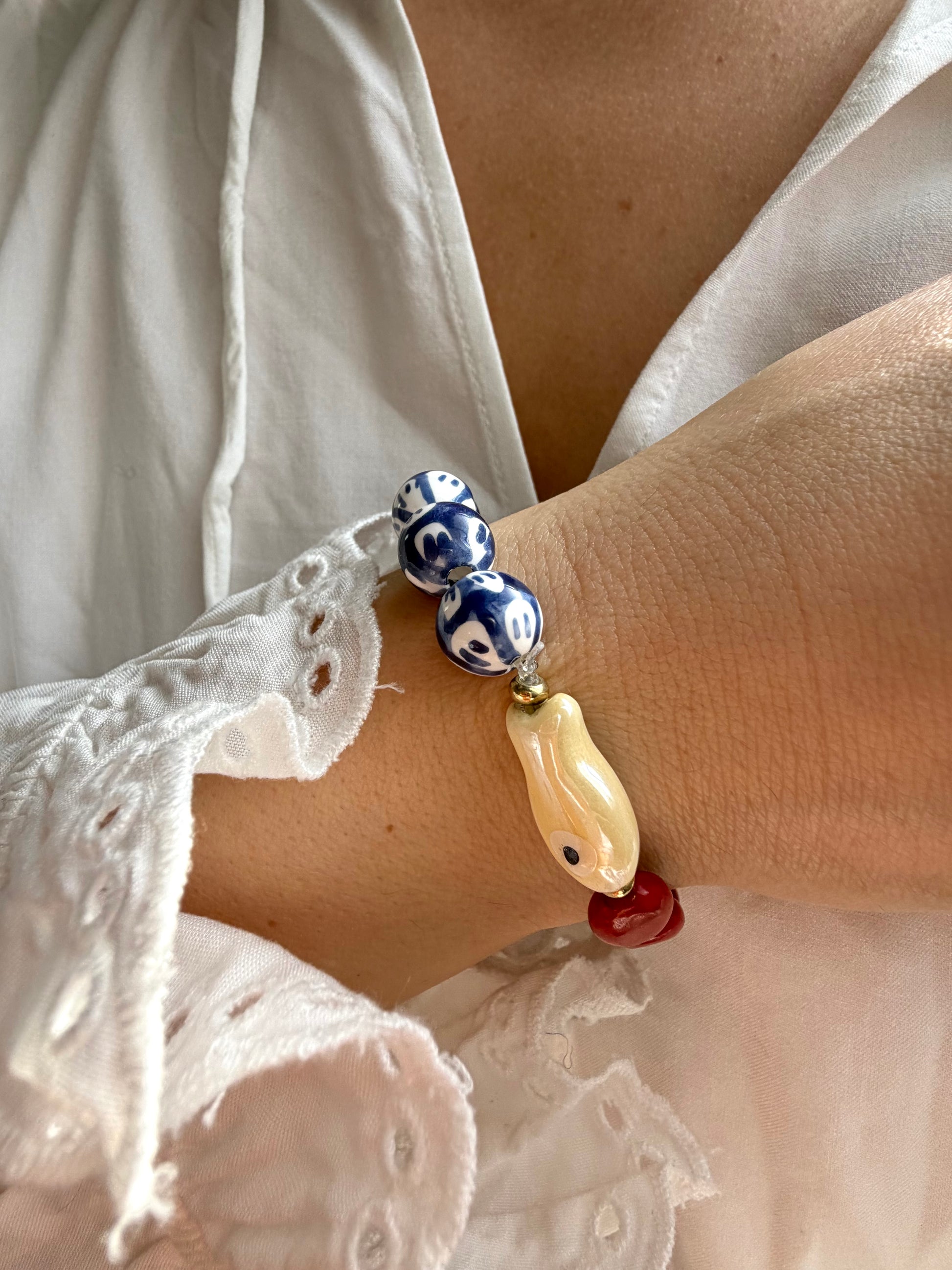 „Lucky Fish“ kombiniert kräftige rote Perlen mit blau-weißen Keramikperlen und einem kleinen Fischanhänger als zentrales Element. Die lebendige Farbkomposition aus Rot, Blau und Creme wirkt verspielt und modern zugleich. Der Fisch setzt einen besonderen Akzent und verleiht dem Armband einen charmanten, maritimen Charakter. Durch die Kombination aus verschiedenen Formen und Farben entsteht ein einzigartiges Design, das sofort ins Auge fällt und jedem Outfit eine kreative Note verleiht.