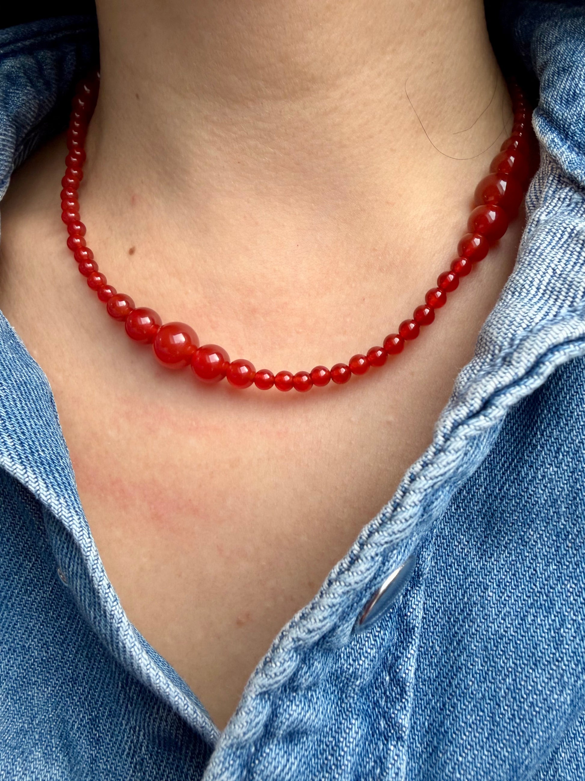 The "Red Agate" necklace is made of finely polished red agate beads and captivates with its intense, warm color. The vibrant red hue is both expressive and elegant, lending the piece a timeless appeal. Its clean, minimalist design makes it versatile and allows for stylish styling, adding a touch of elegance to both everyday wear and simple outfits.