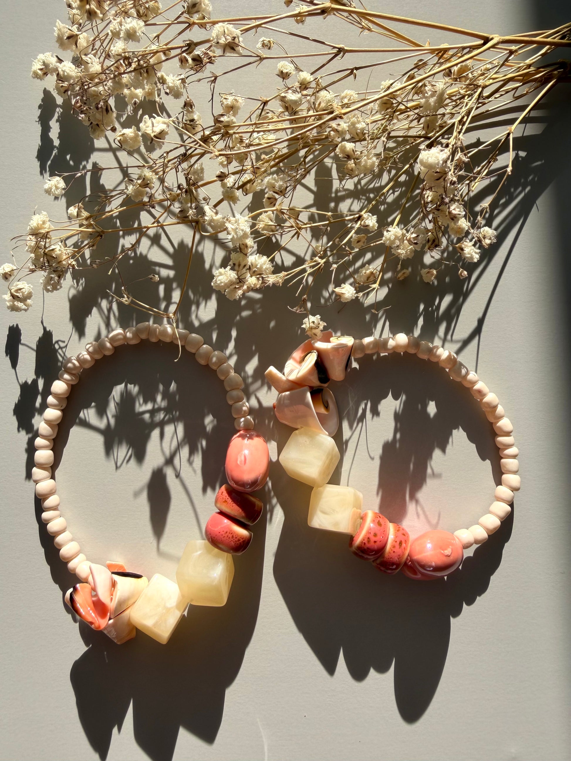 „Shell Whisper“ kombiniert zarte cremefarbene Perlen mit auffälligen Statement-Elementen in warmen Korallen- und Rosétönen. Organisch geformte Muschelstücke, schimmernde Würfelperlen und strukturierte Akzentperlen aus Keramik und Acryl schaffen eine spannende Mischung aus Formen und Materialien. Die harmonische Farbpalette erinnert an Muscheln, Korallen und warme Sommertage am Meer. Das Armband wirkt modern, künstlerisch und lebendig – ein besonderes Schmuckstück, das jedem Outfit sofort Charakter verleiht.