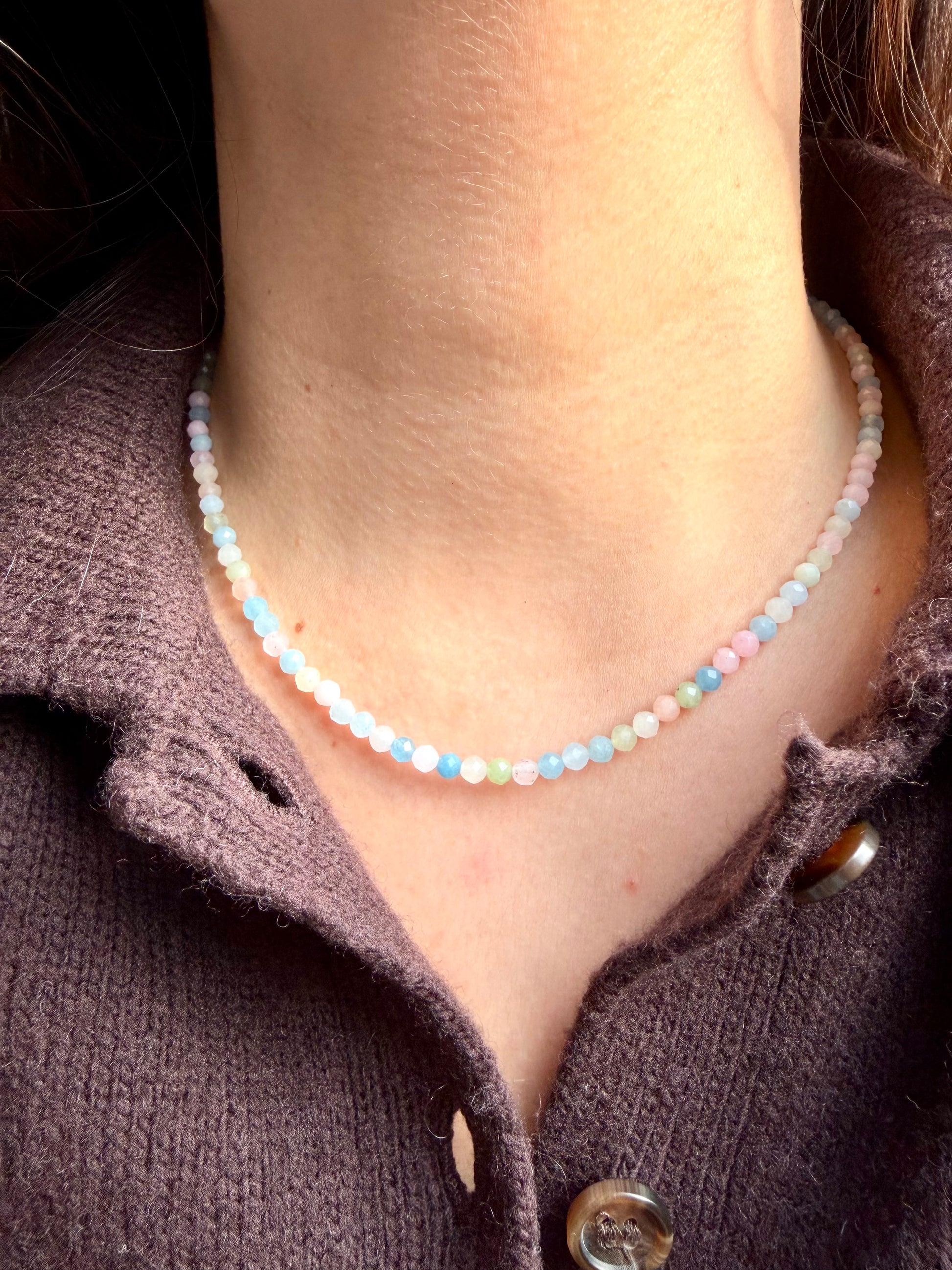 The "Soft Aura" necklace is made of finely faceted morganite stones in soft pastel colors. Delicate shades of rose, blue, green, and cream lend the piece a calm, harmonious aura. The small, faceted stones subtly reflect the light, creating a delicate sparkle. This dainty necklace combines lightness and elegance, making it ideal for everyday wear as well as for subtle layered looks.