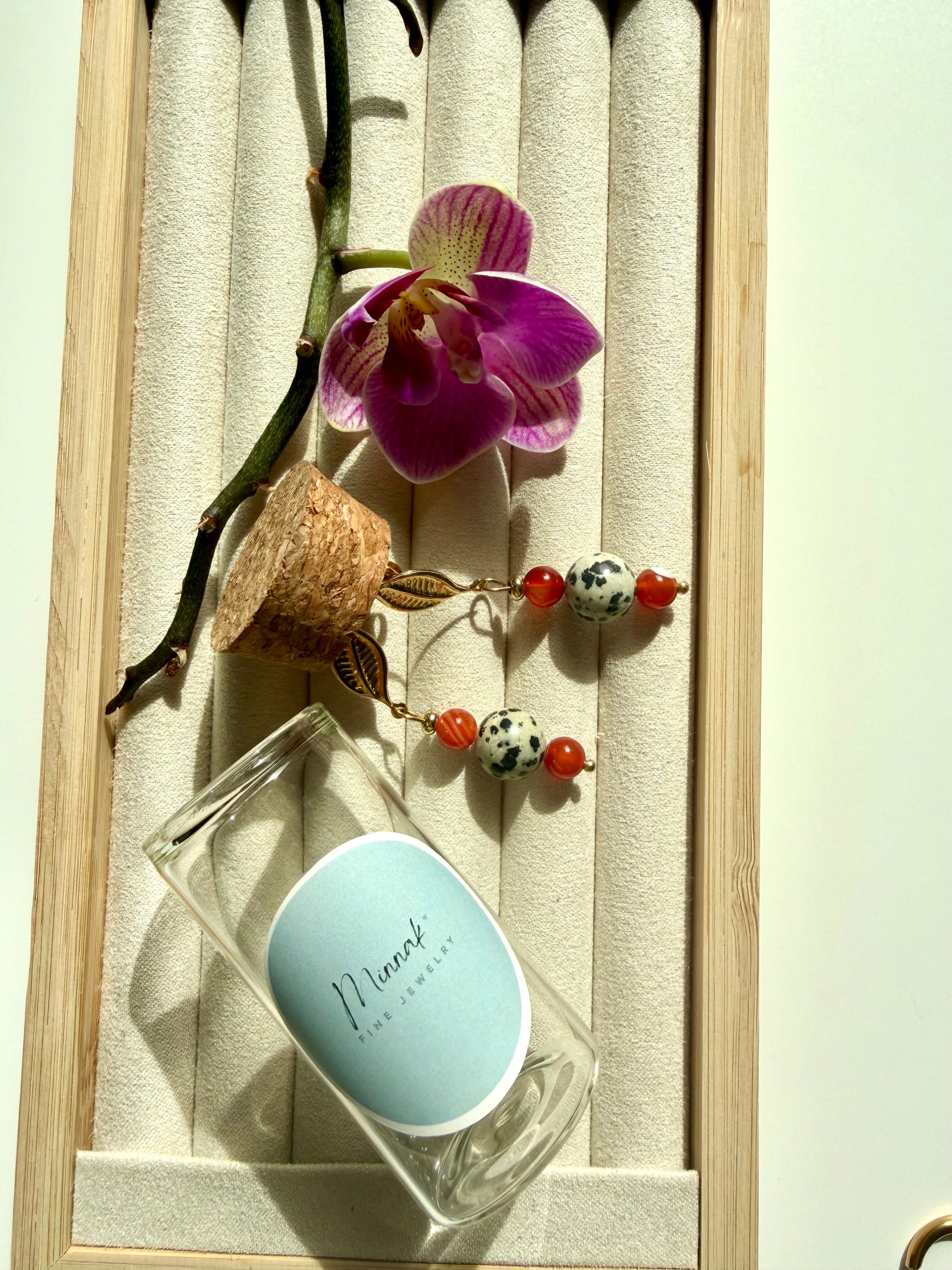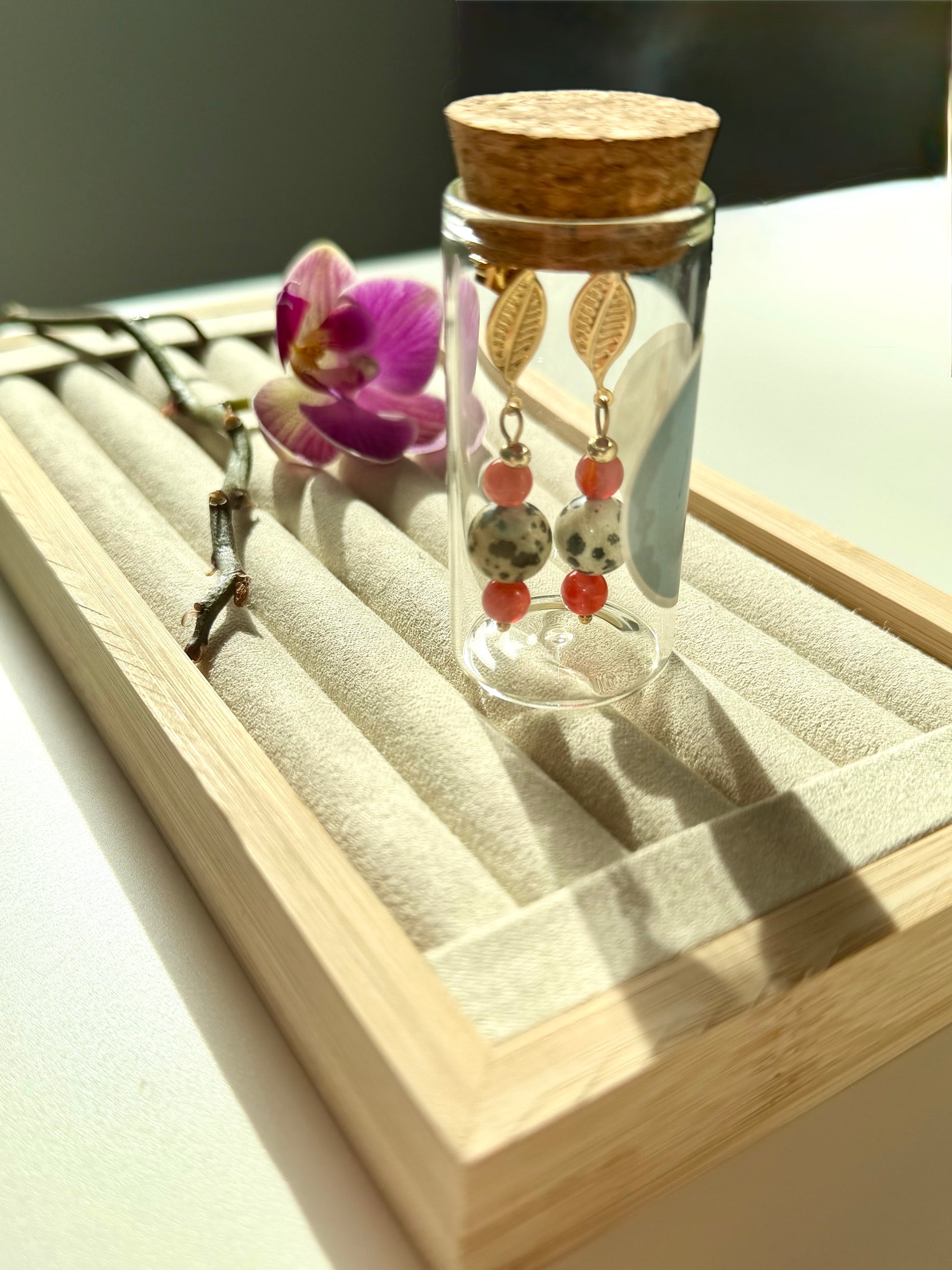 Die Ohrringe „Solara Leaf“ verbinden natürliche Strukturen mit warmen, ausdrucksstarken Farbakzenten. Der gefleckte Dalmatiner Jaspis trifft auf leuchtend rote Achatperlen und wird durch ein feines Blattdetail in Goldoptik ergänzt. Die Kombination wirkt lebendig, natürlich und gleichzeitig elegant – ein besonderes Schmuckstück mit Charakter.
