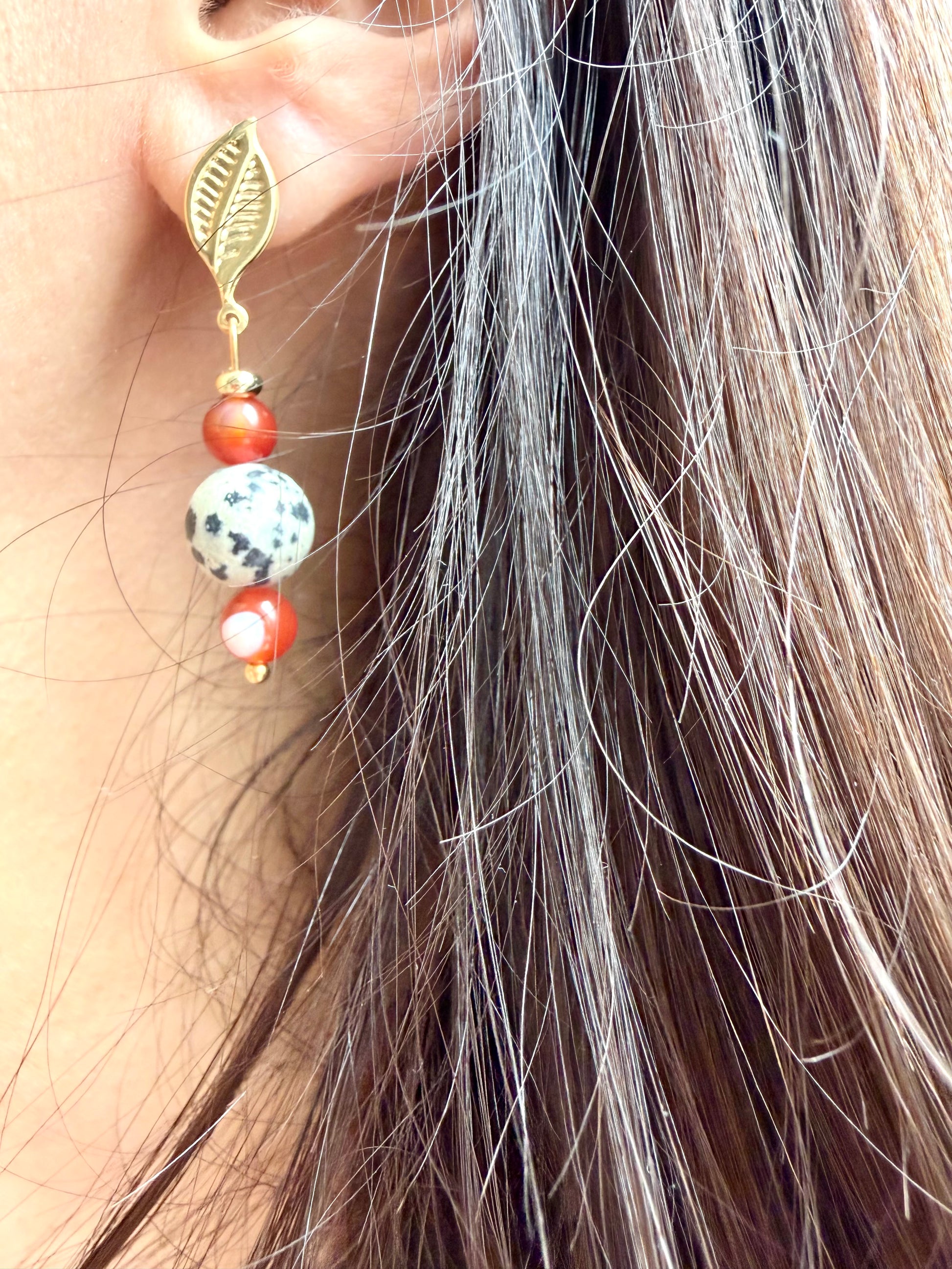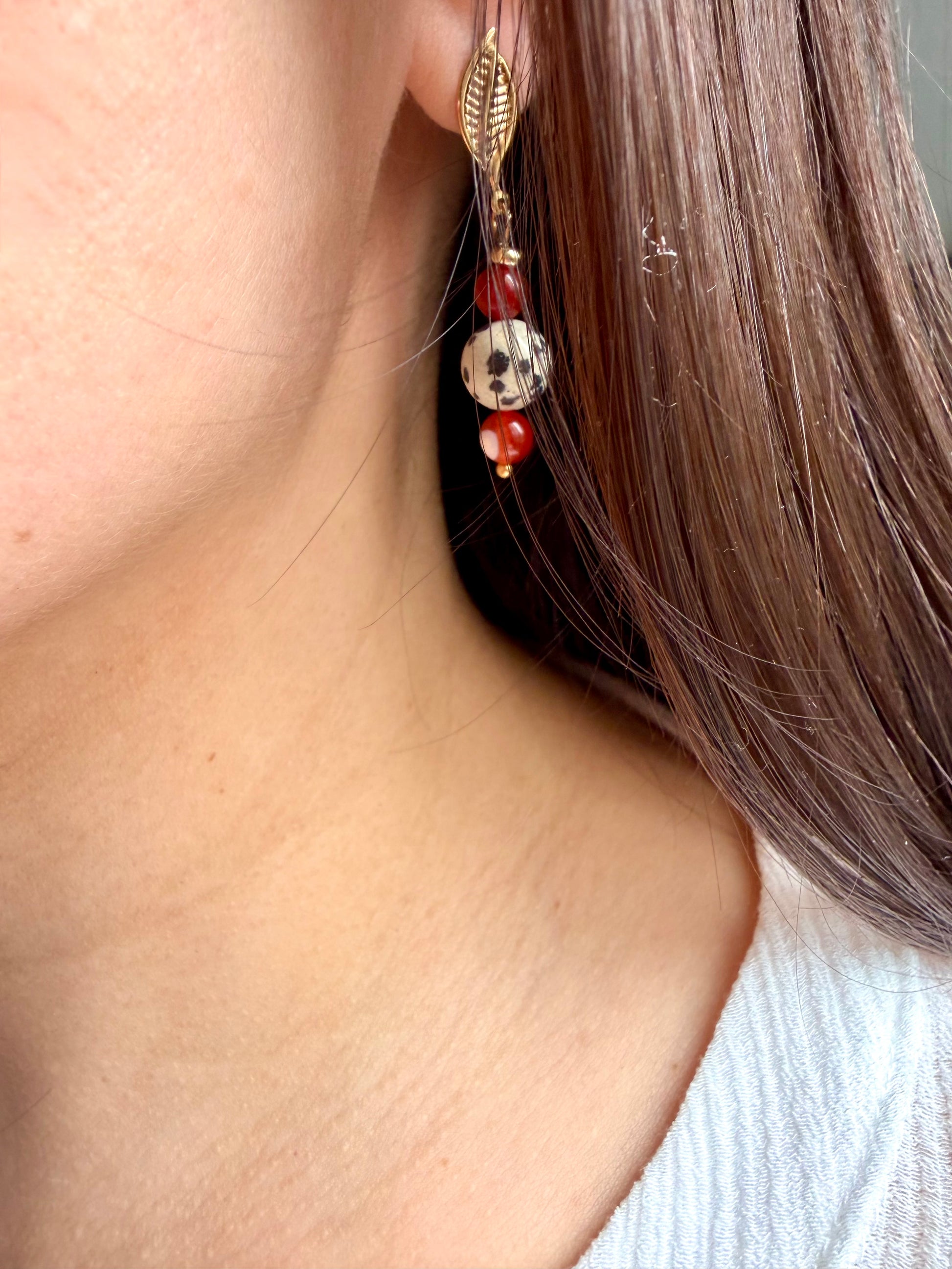 Solara Leaf – Ohrringe mit Dalmatiner Jaspis, rotem Achat & Blattdetail – handgefertigt