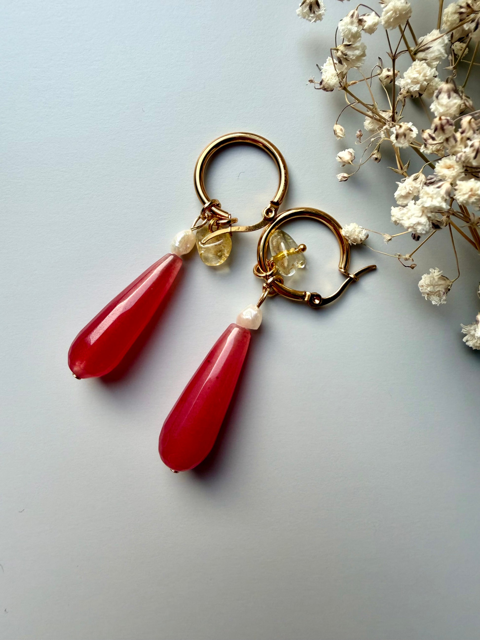 Stone Drip – Gold-plated hoop earrings with gemstone drops & pearls – handmade