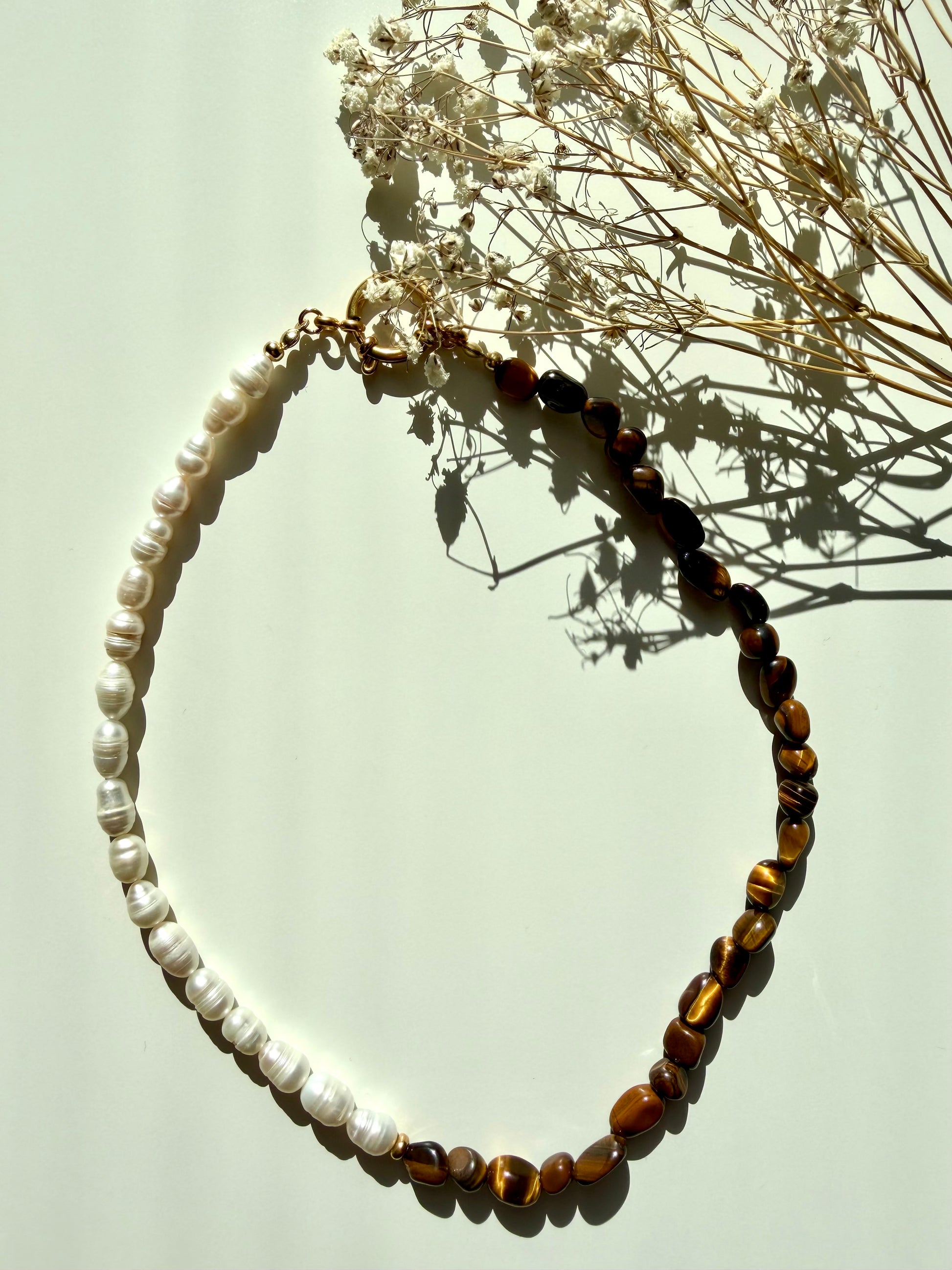 Die Halskette „Tiger Pearl“ kombiniert warm schimmerndes Tigerauge mit klassischen Süßwasserperlen zu einem ausdrucksstarken und zugleich eleganten Design. Die erdigen Braun- und Goldtöne des Tigerauges treffen auf die weiche, helle Ausstrahlung der Perlen und schaffen ein harmonisches Gleichgewicht.