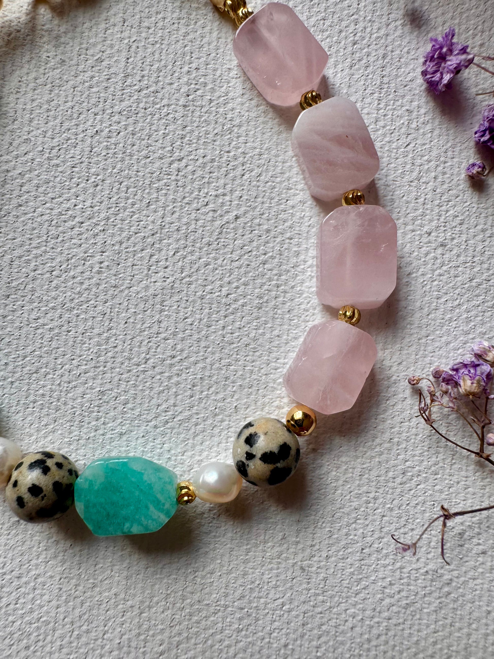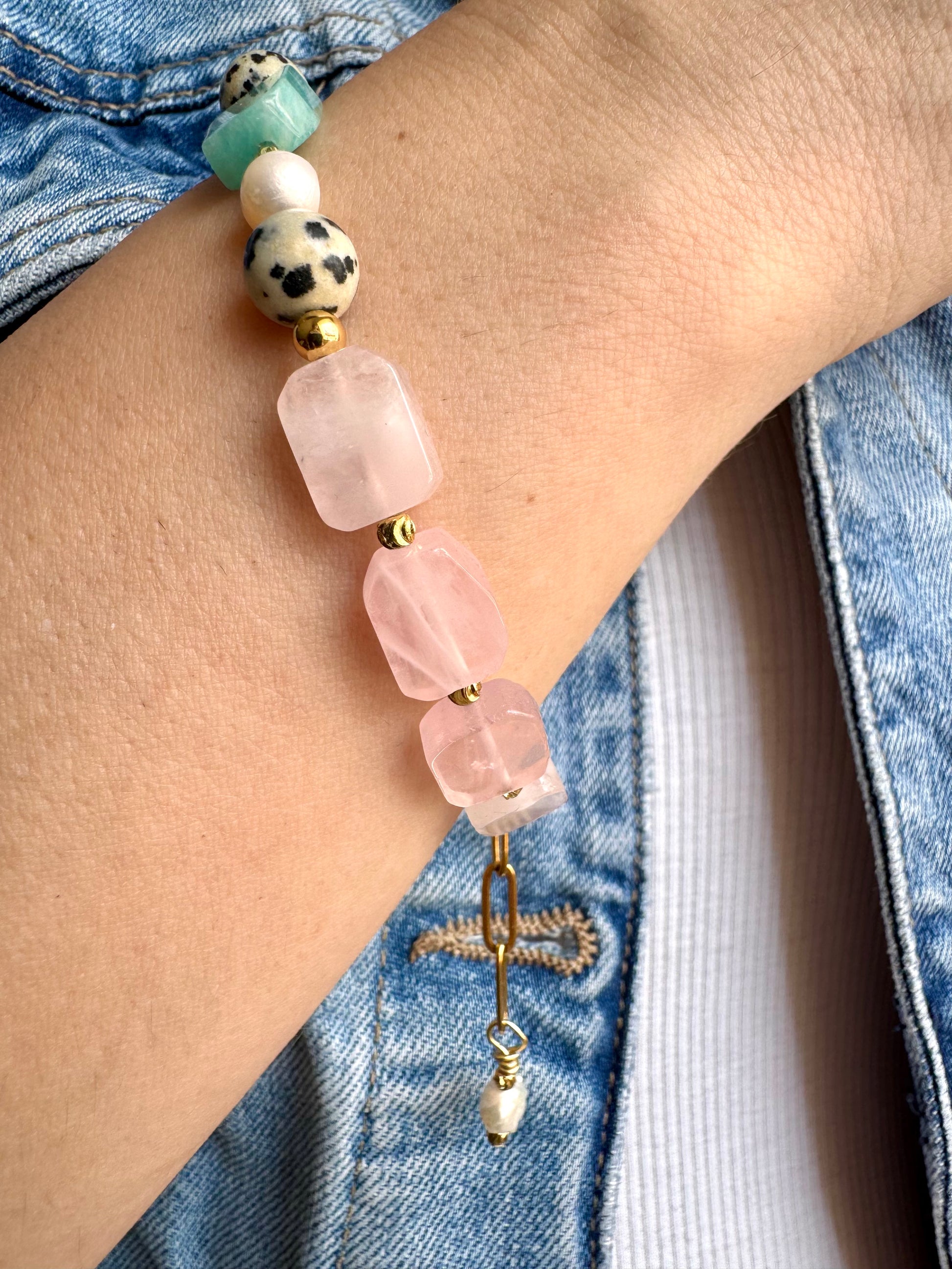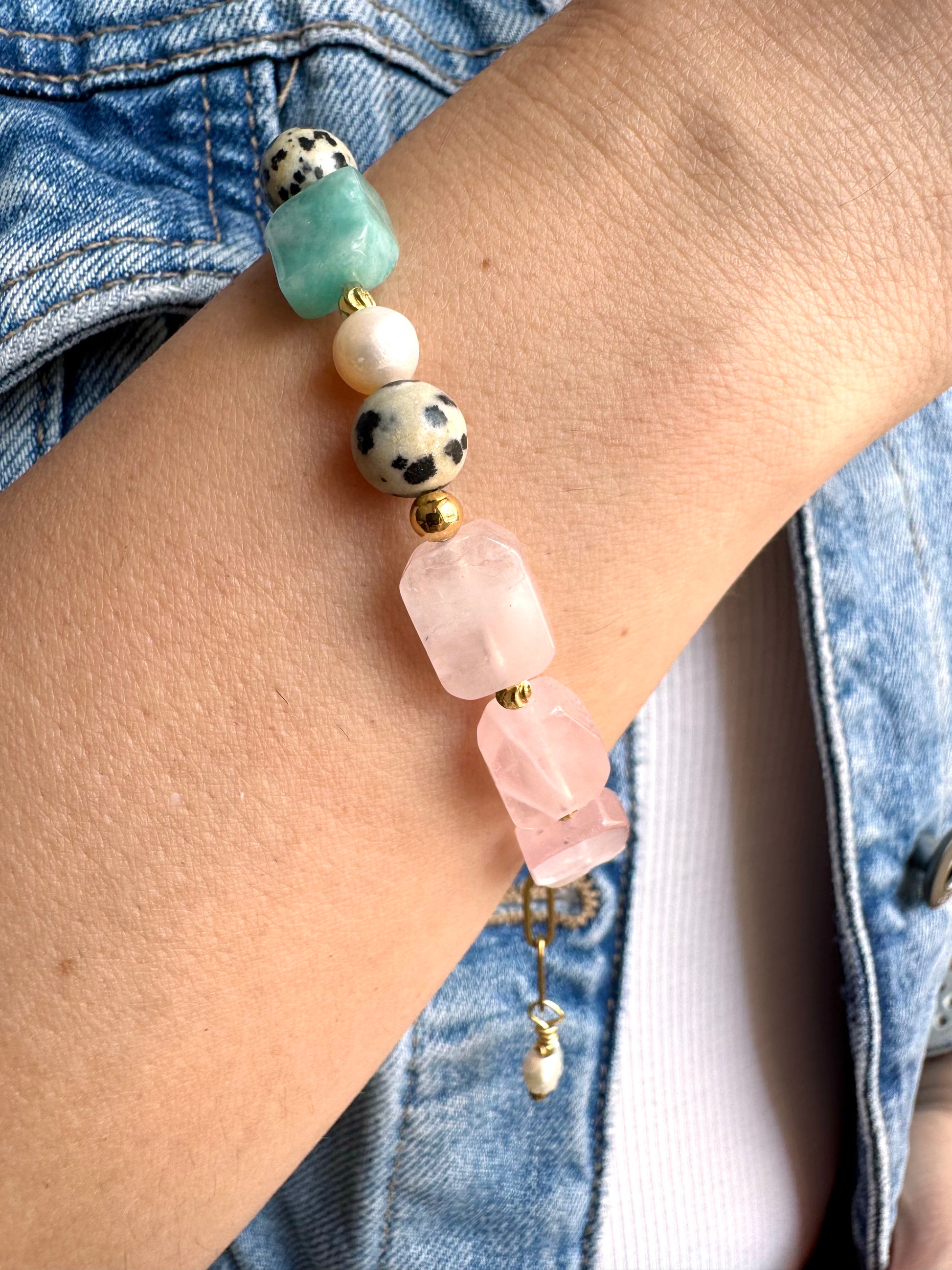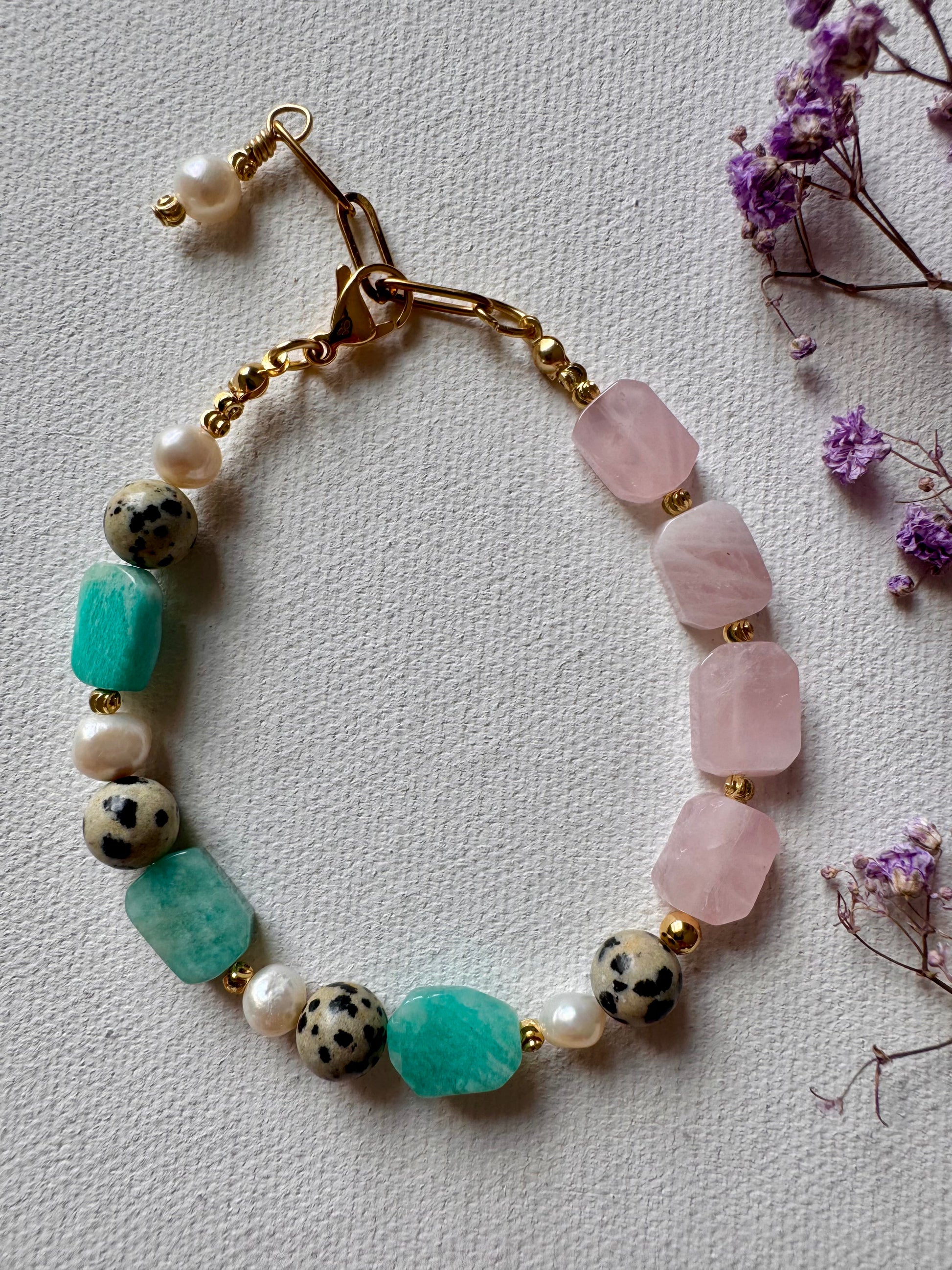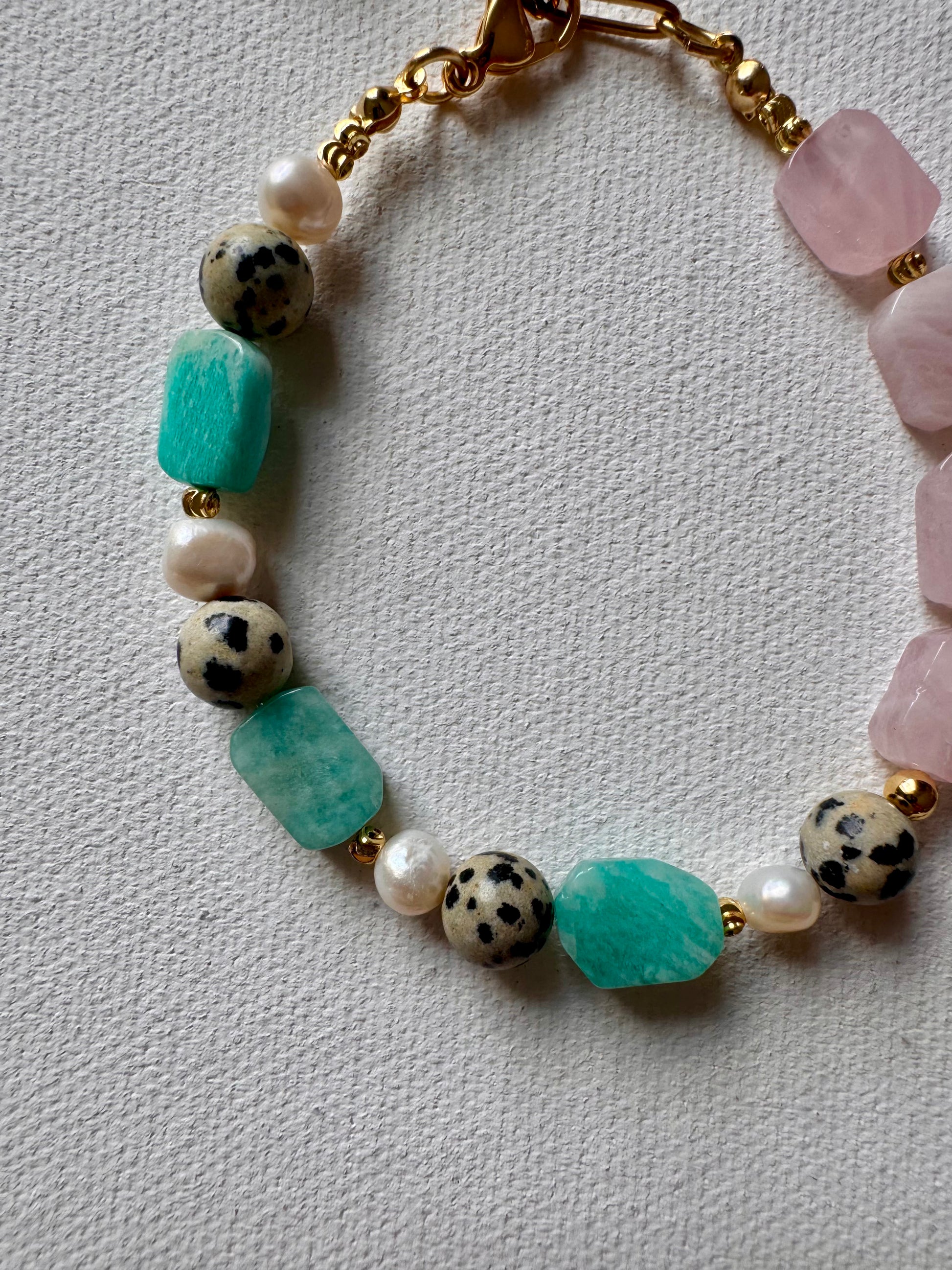Amazonit & Rosenquarz Armband mit Süßwasserperlen • Dalmatiner Jaspis • 18k vergoldet