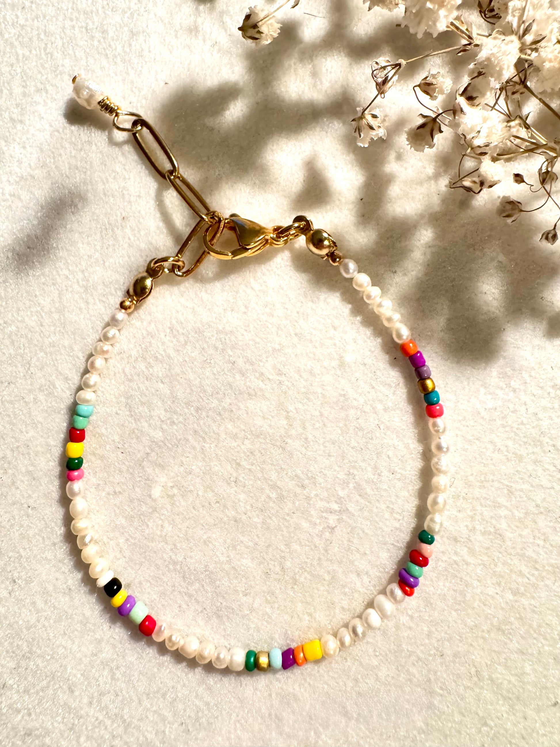 Armband aus feinen Süßwasserperlen & bunten Glasperlen – handgefertigt