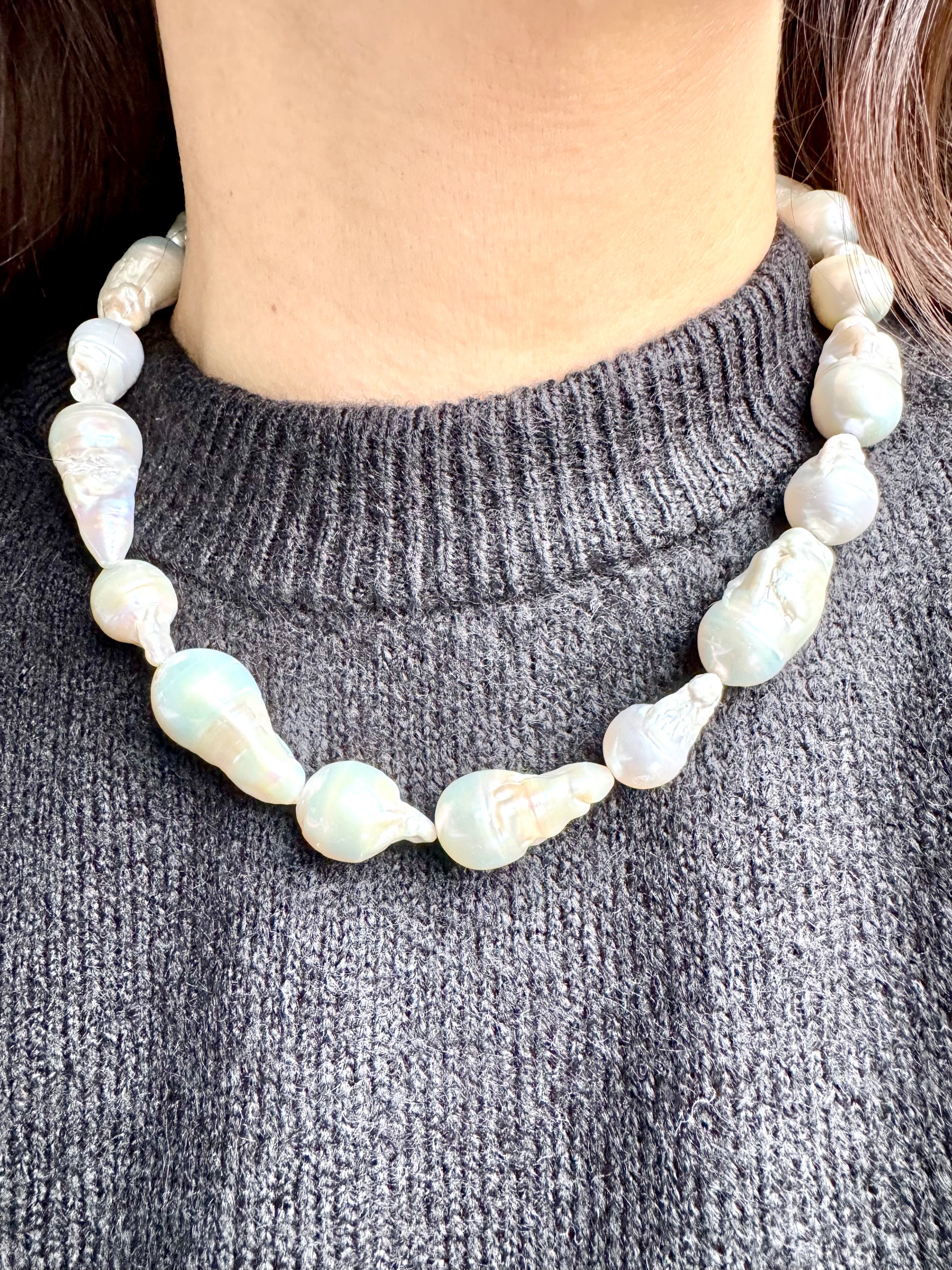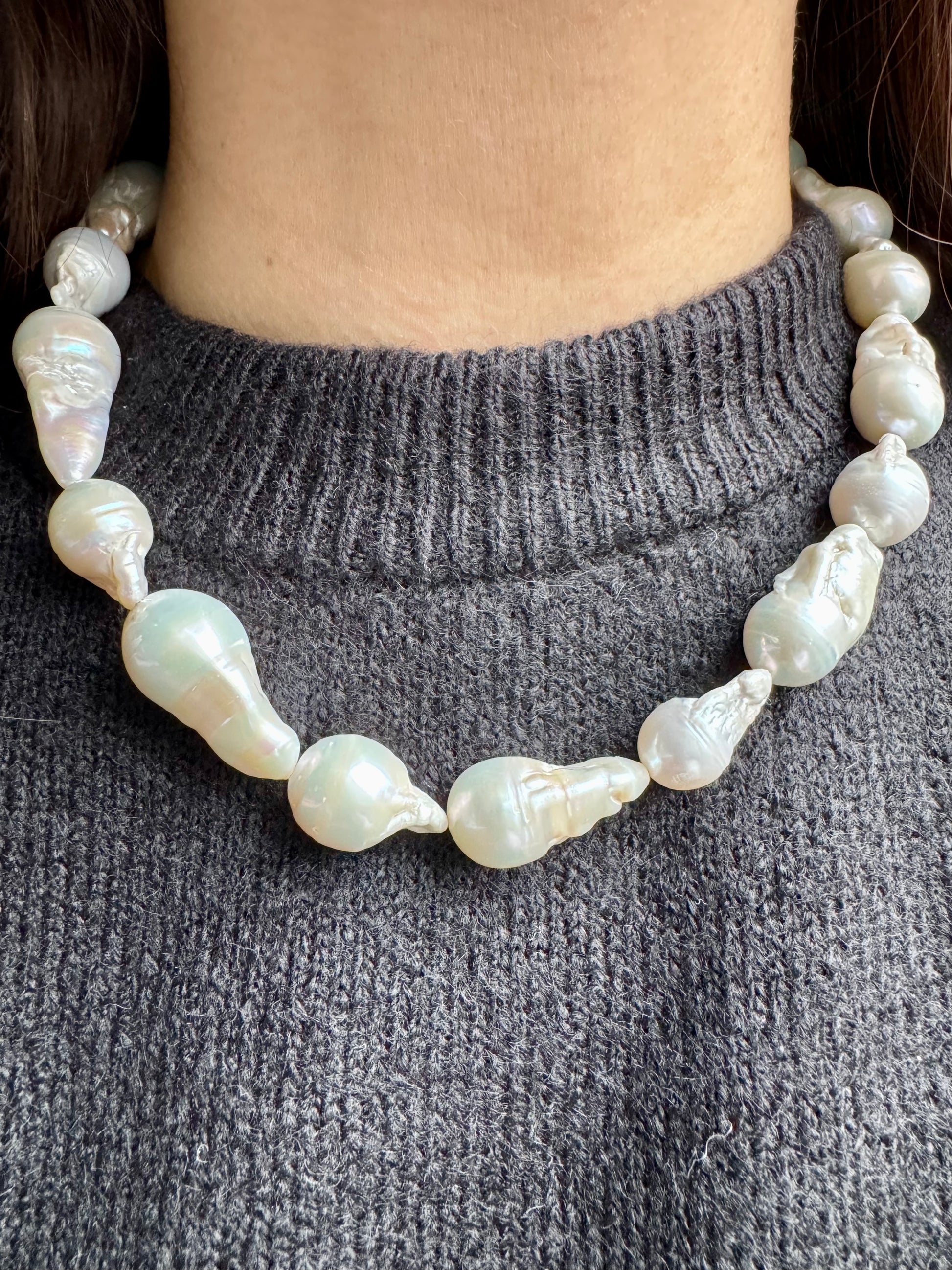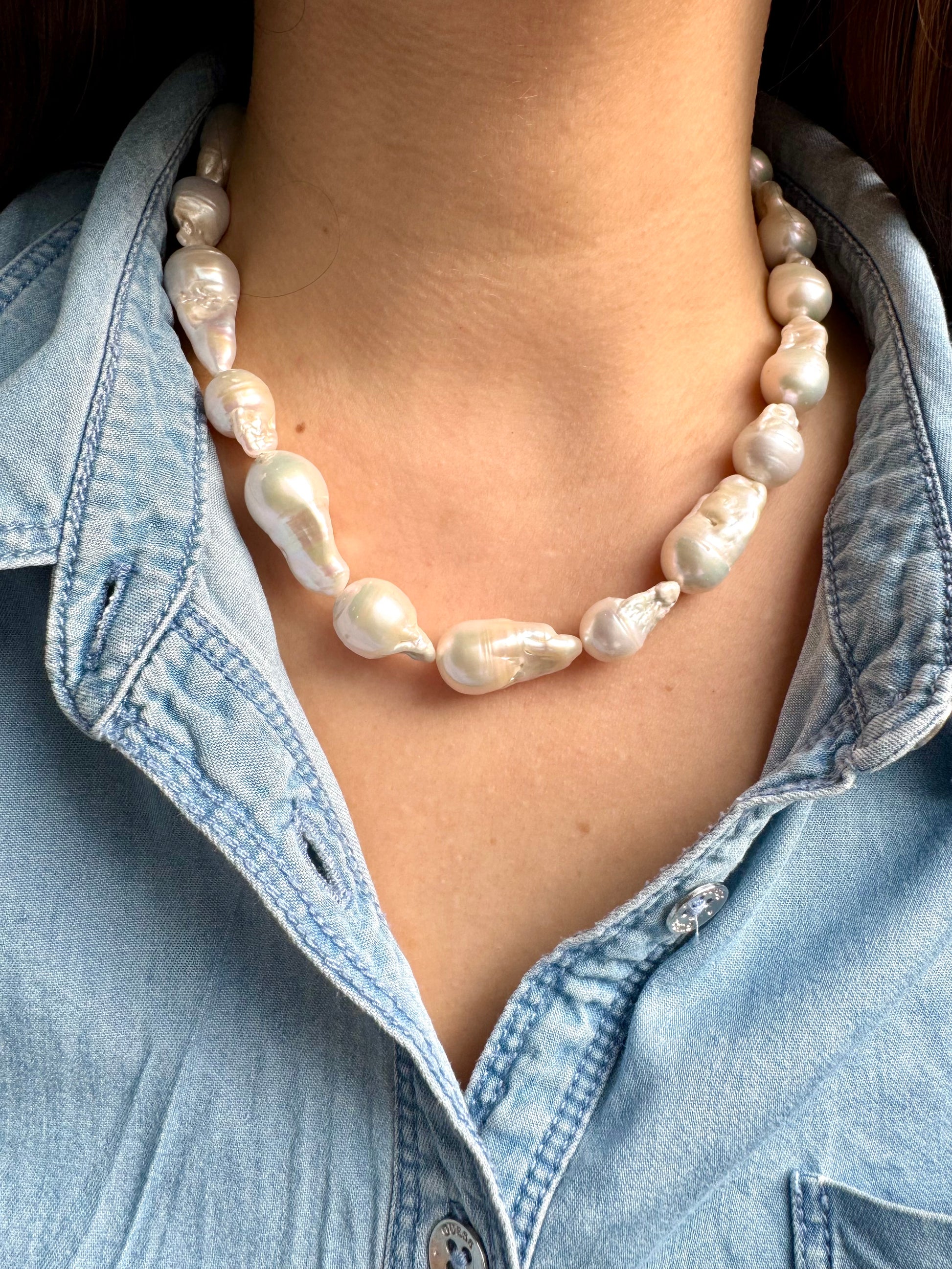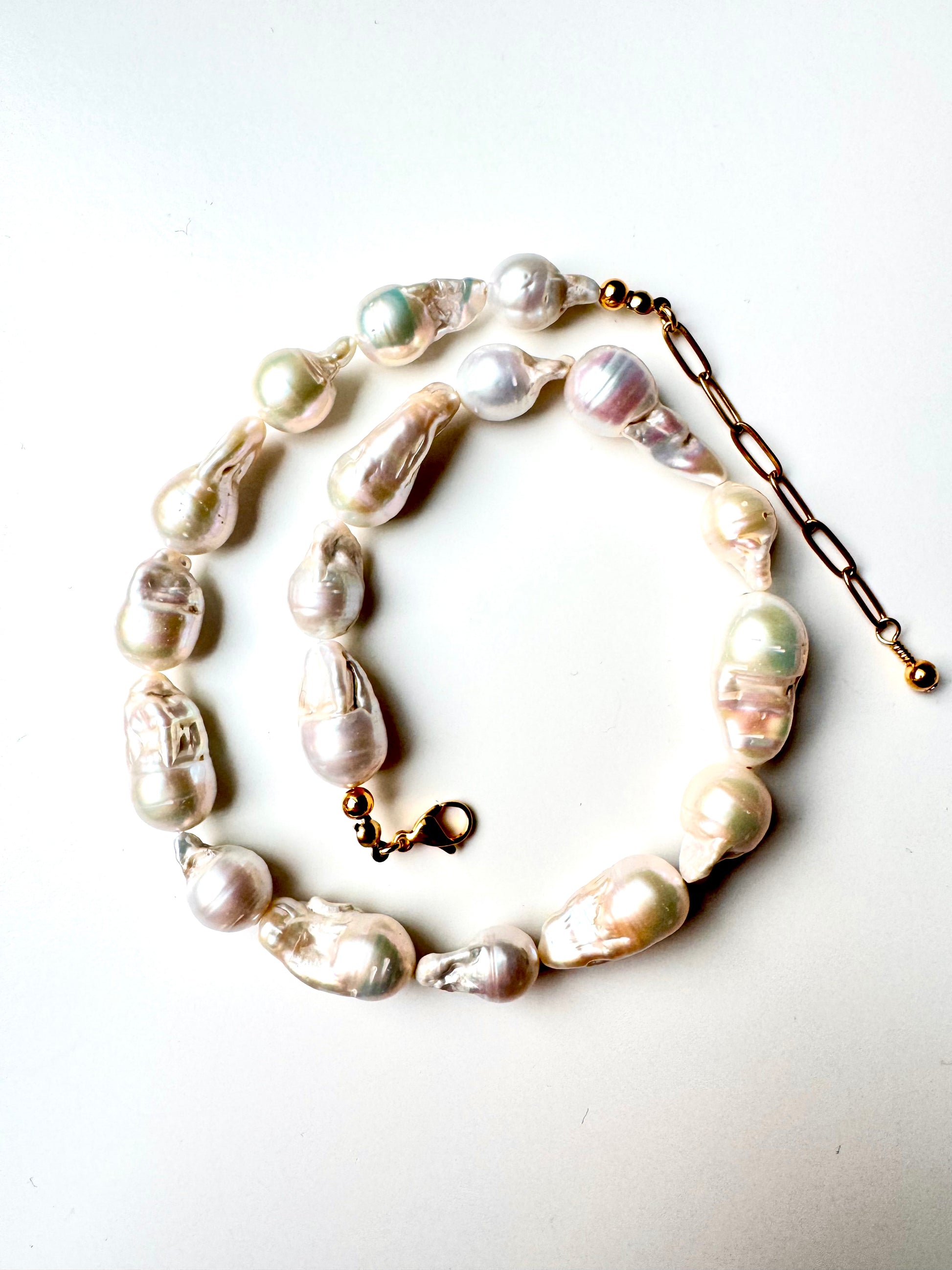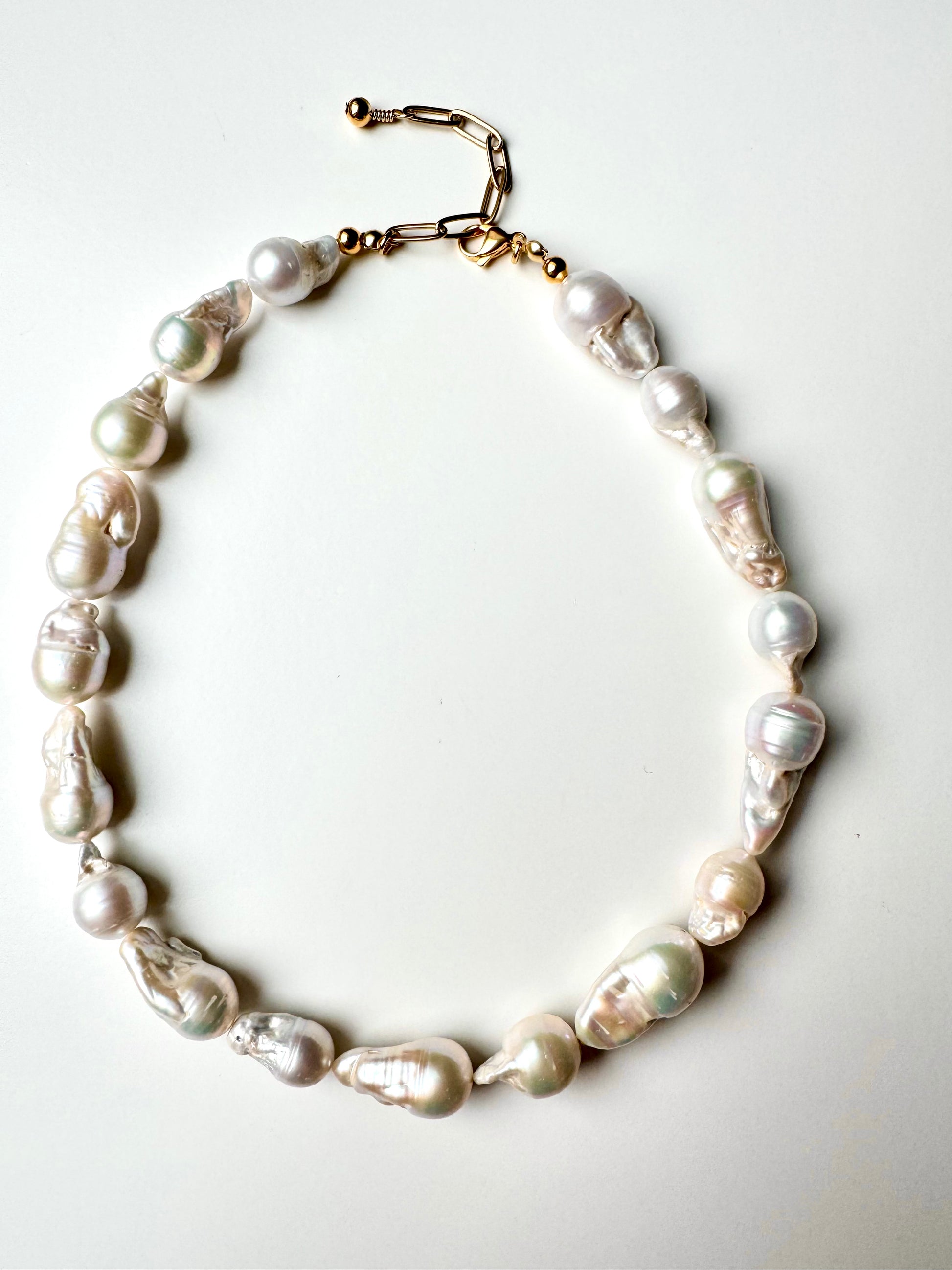 Eine elegante Halskette aus großen, barocken Süßwasserperlen, die mit ihrer organischen Form und ihrem zarten Schimmer faszinieren. Jede Perle ist ein Unikat – mit feinen Reflexen in Weiß, Rosé und Creme. 18k vergoldete Details und eine filigrane Paperclip-Kette runden das Design edel ab. Perfekt für besondere Anlässe oder als stilvolles Statement im Alltag.