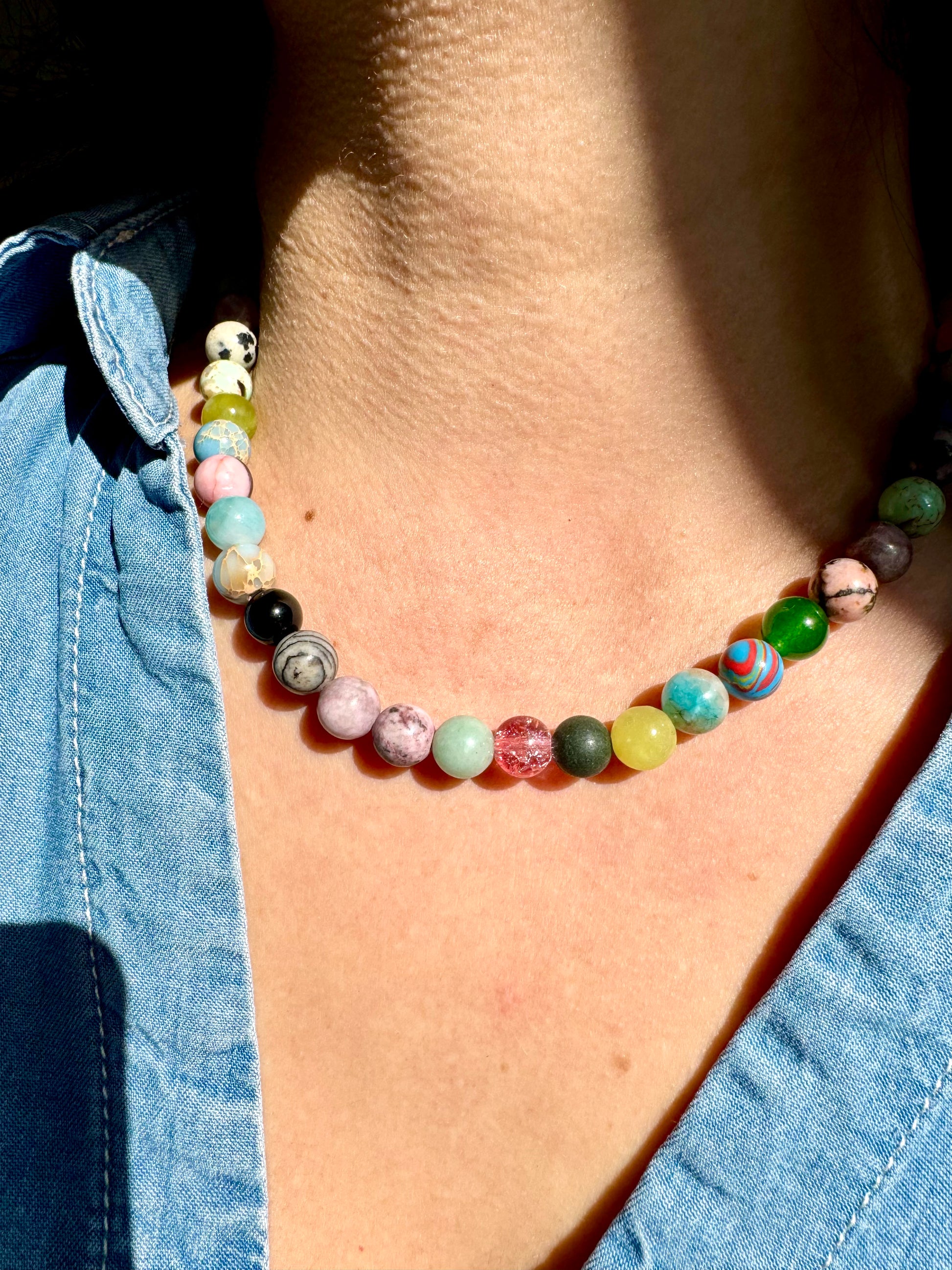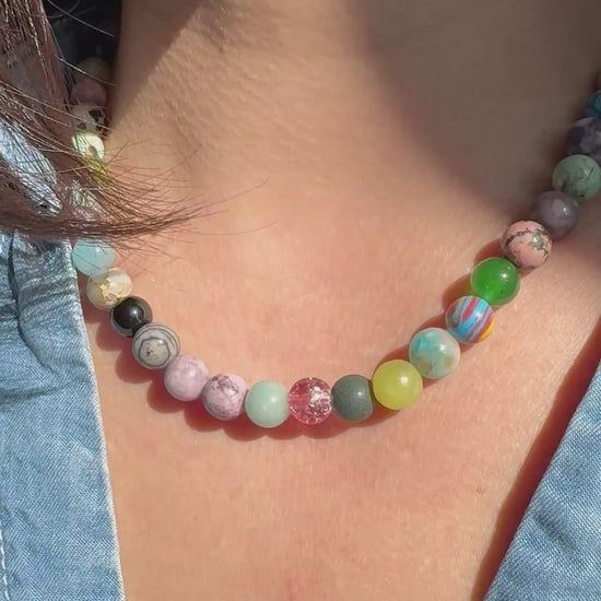 Diese farbenfrohe Edelstein-Halskette wurde in liebevoller Handarbeit gefertigt und kombiniert verschiedene, hochwertig geschliffene Natursteine – jede Perle ist ein Unikat mit eigenem Charakter. Inspiriert vom Frühling bringt sie frische Akzente in deine Garderobe.