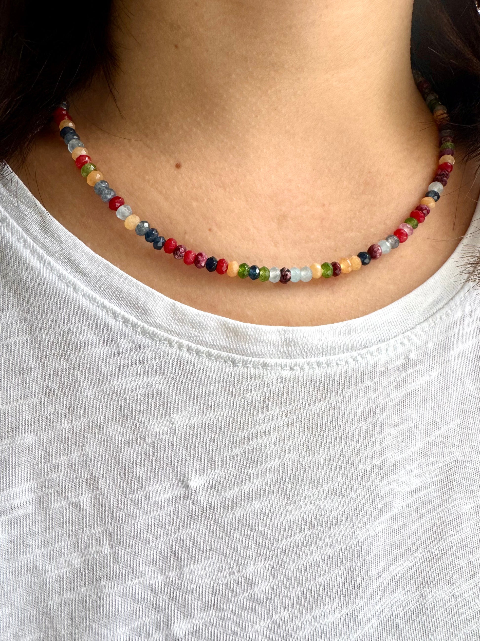 Diese farbenfrohe Halskette vereint elegante Facettierung mit einem harmonischen Mix aus bunten Edelsteinperlen. Jede Perle funkelt im Licht und verleiht deinem Look eine verspielte und zugleich edle Ausstrahlung. Die Kombination aus intensiven Farben und zarten Goldakzenten macht dieses Schmuckstück zum idealen Begleiter – ob im Alltag oder zu besonderen Anlässen.