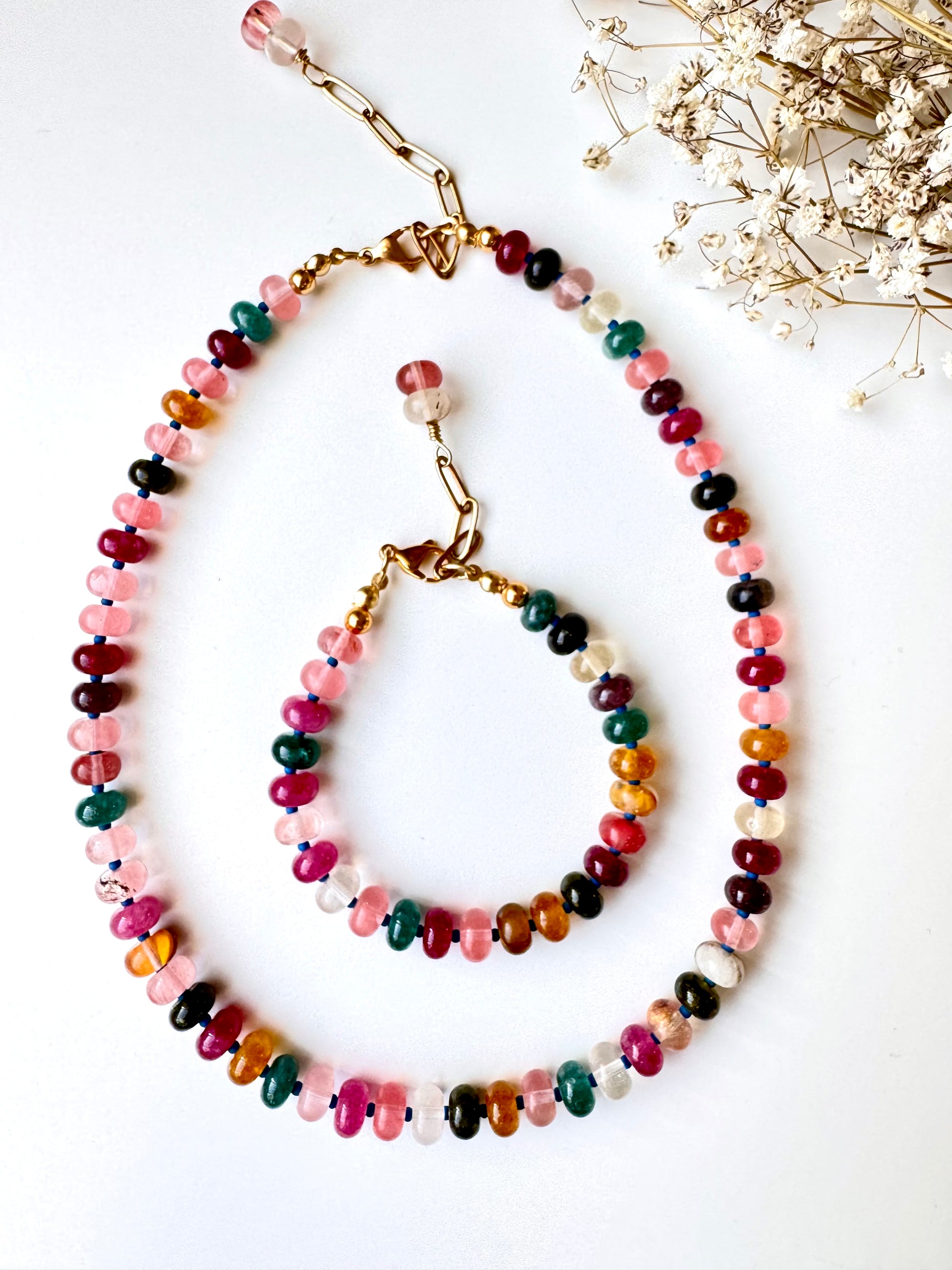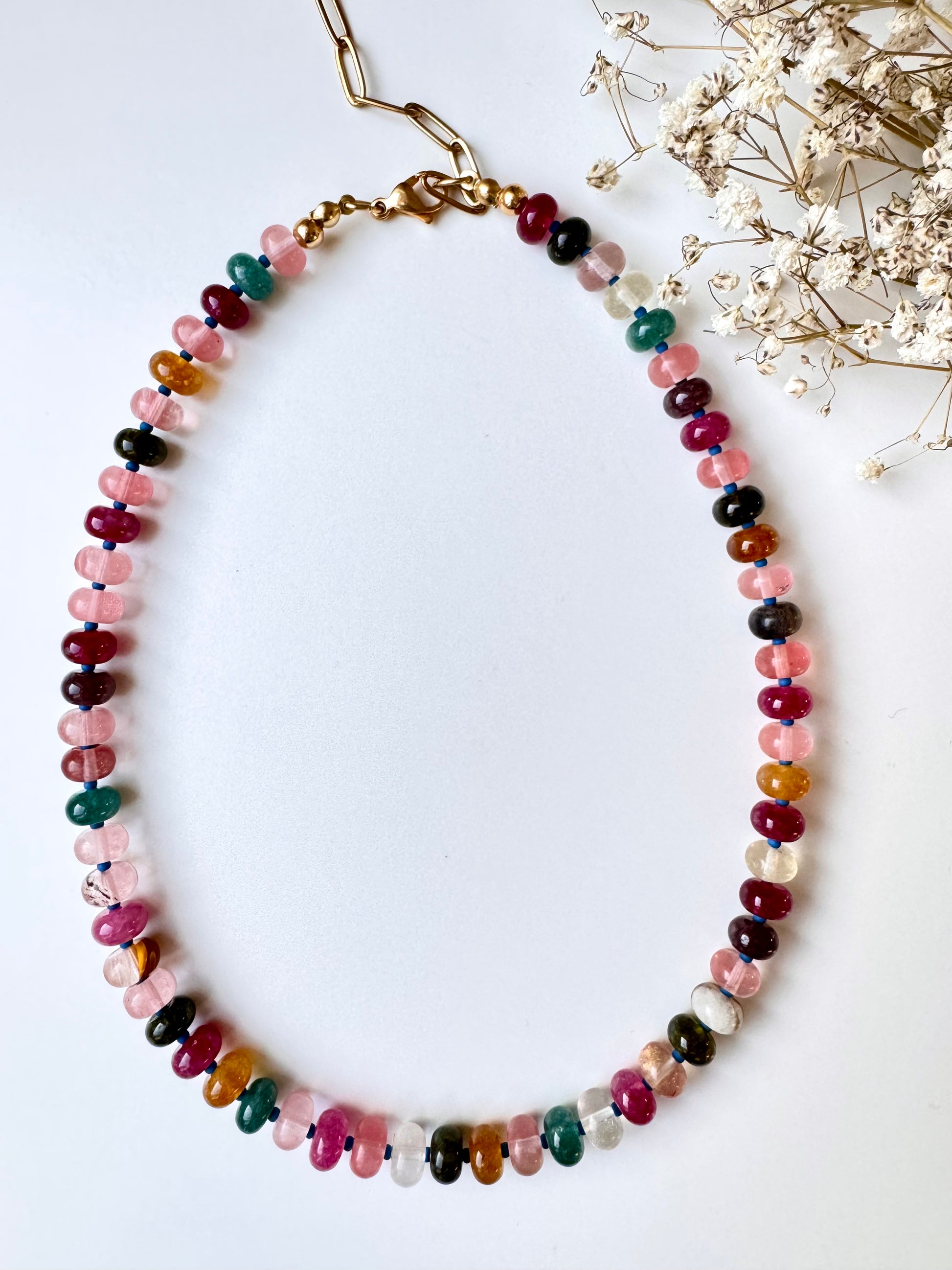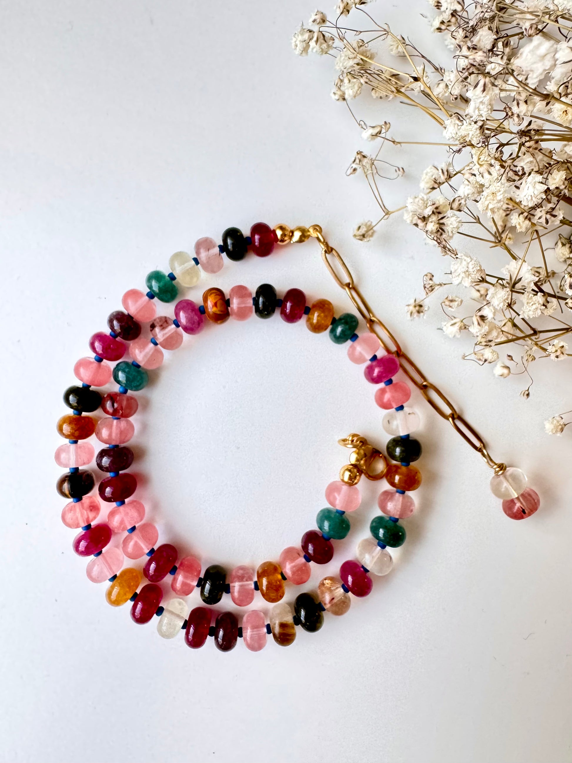 Bunte Turmalin-Halskette mit abakusförmigen Perlen & goldenen Details