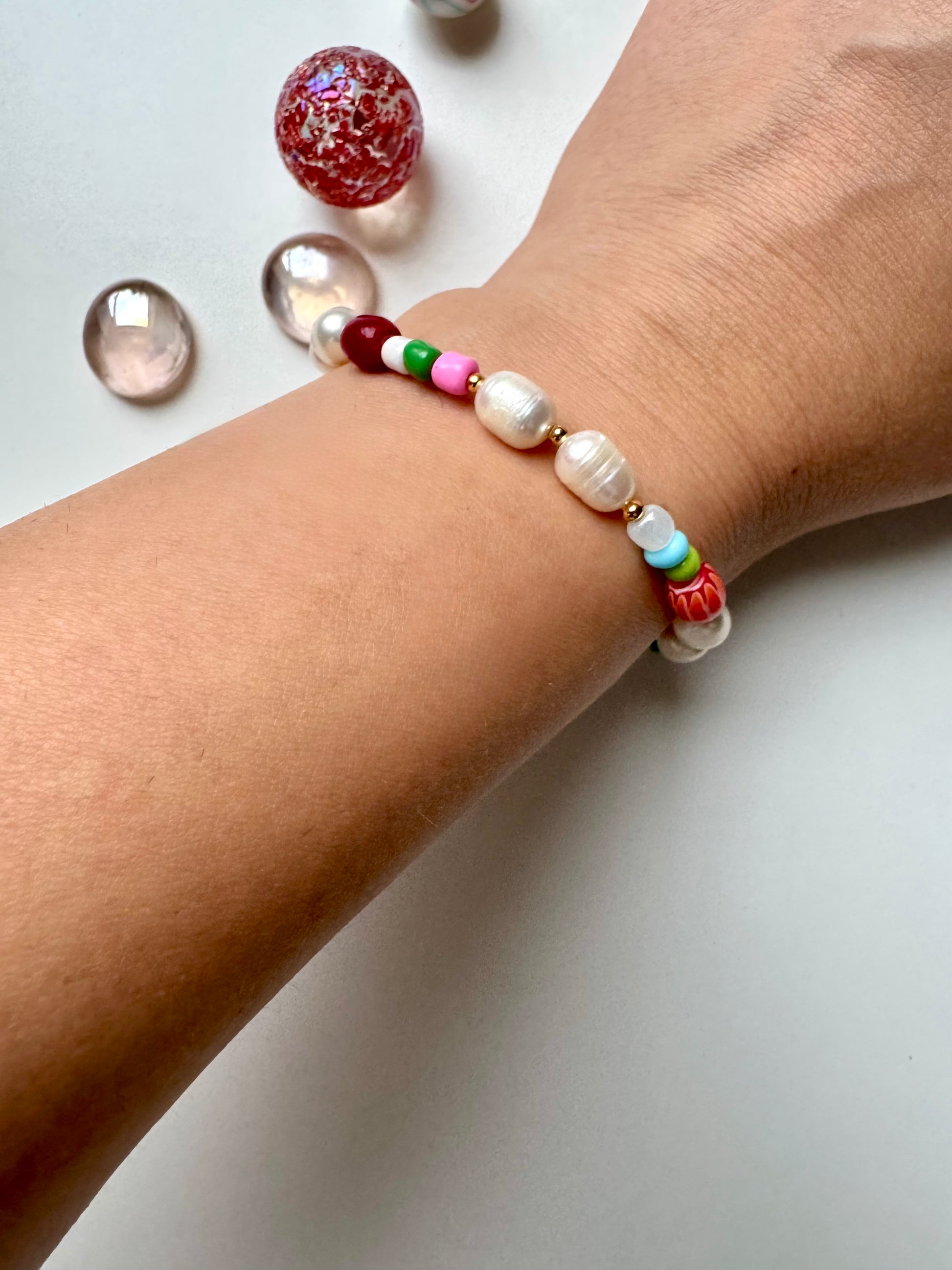 Dieses farbenfrohe Armband vereint natürliche Süßwasserperlen mit hochwertigen Miyuki- und Glasperlen in einem verspielten, modernen Design. Die leuchtenden Farben und unterschiedlichen Formen sorgen für einen lebendigen Look, der sich ideal im Alltag oder zu besonderen Anlässen tragen lässt. Vergoldete Details verleihen dem Armband eine elegante Note und machen es zu einem vielseitigen Begleiter.