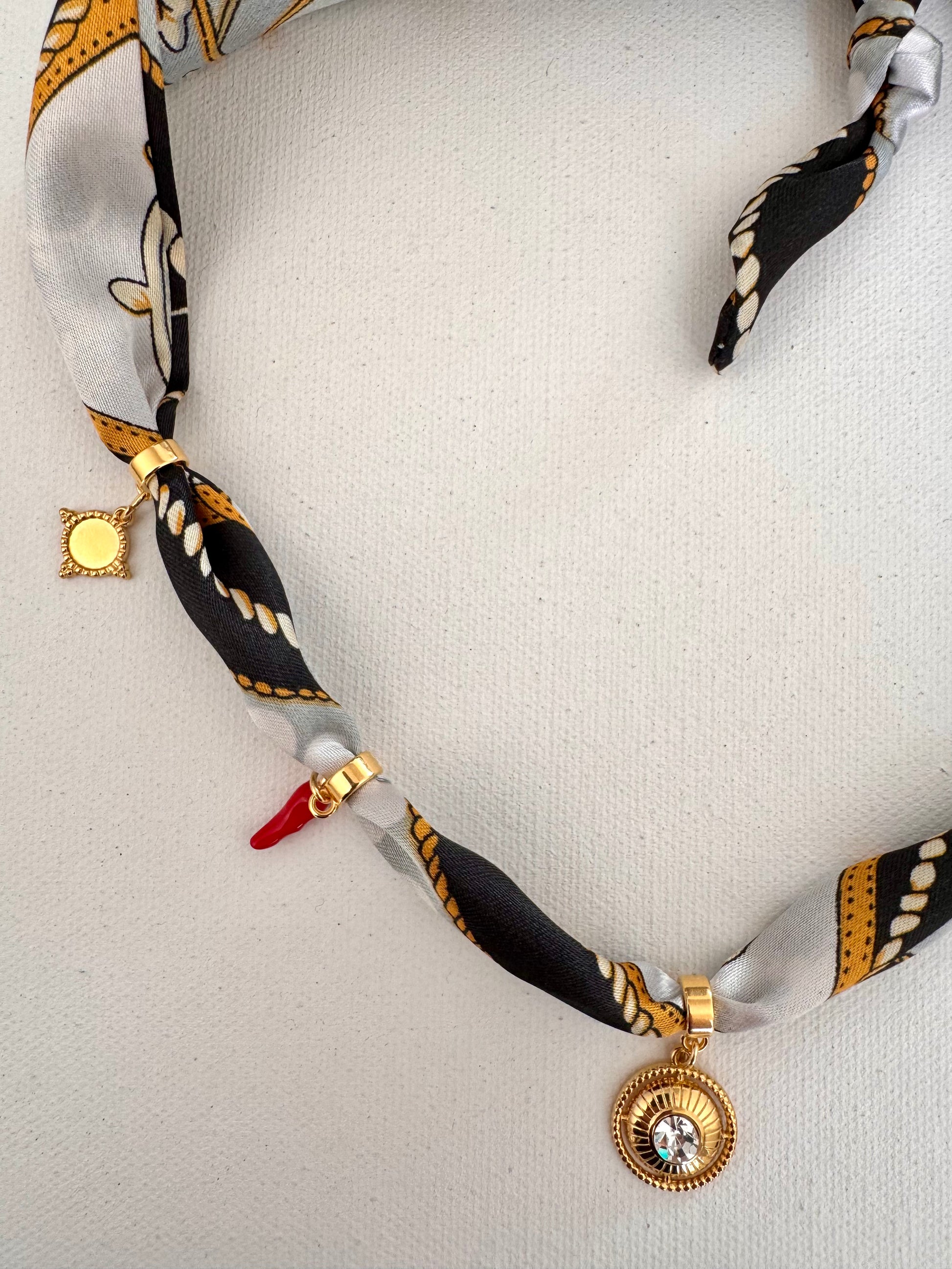 Charm-Bandana in Schwarz-Gold mit grafischem Muster und 6 verschiedenen Anhängern in Goldoptik, darunter Kristallstein, Herz-Detail, Sonnenplatte und ein roter Glücks-Chili