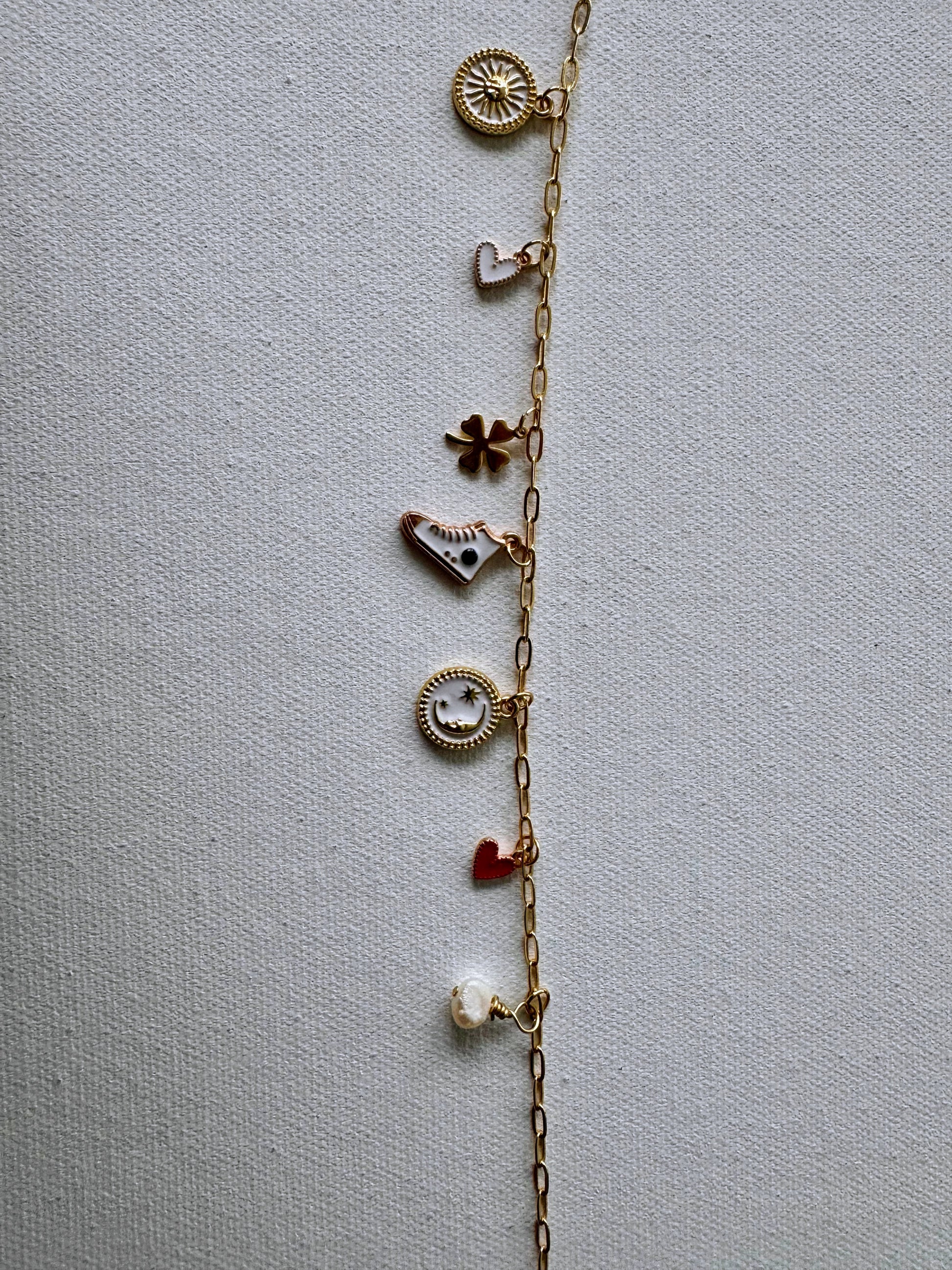 - Anhänger: Rotes und weißes Herz, Sneaker, Kleeblatt, Mond, Sonne, Süßwasserperle