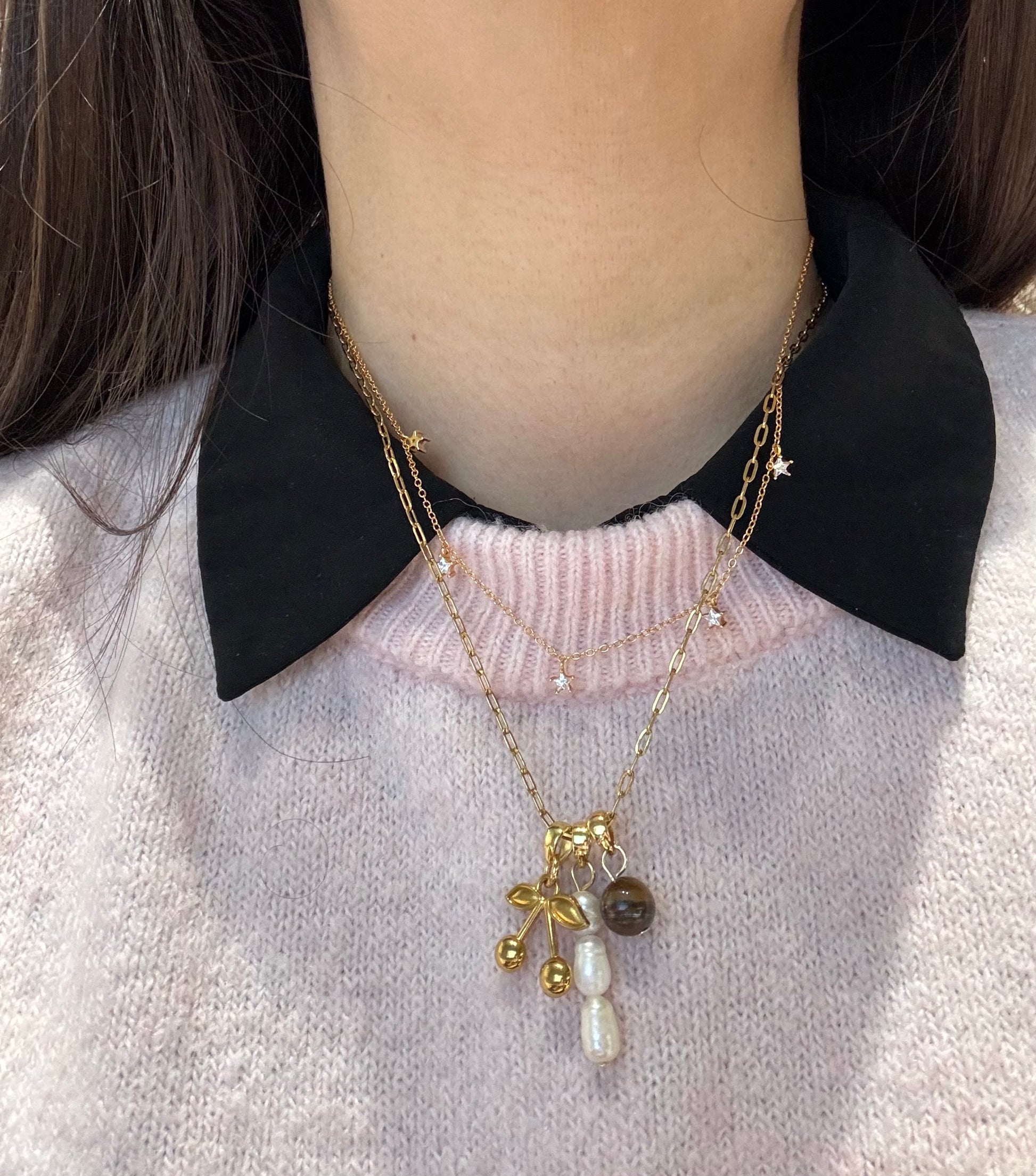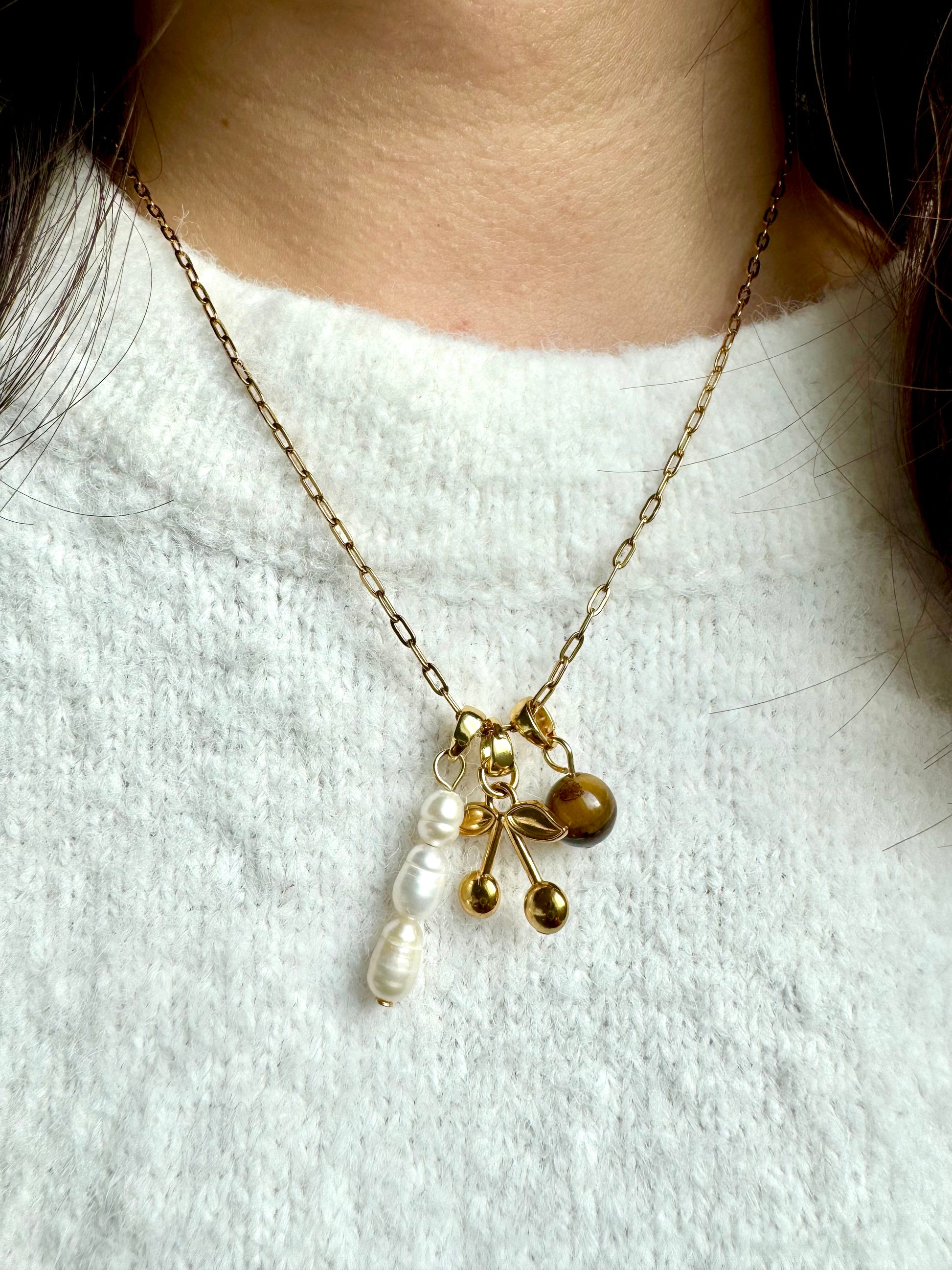 CHERRY CHARM – Halskette mit Süßwasserperlen, Tigerauge & 18k vergoldeten Anhängern, handgefertigt