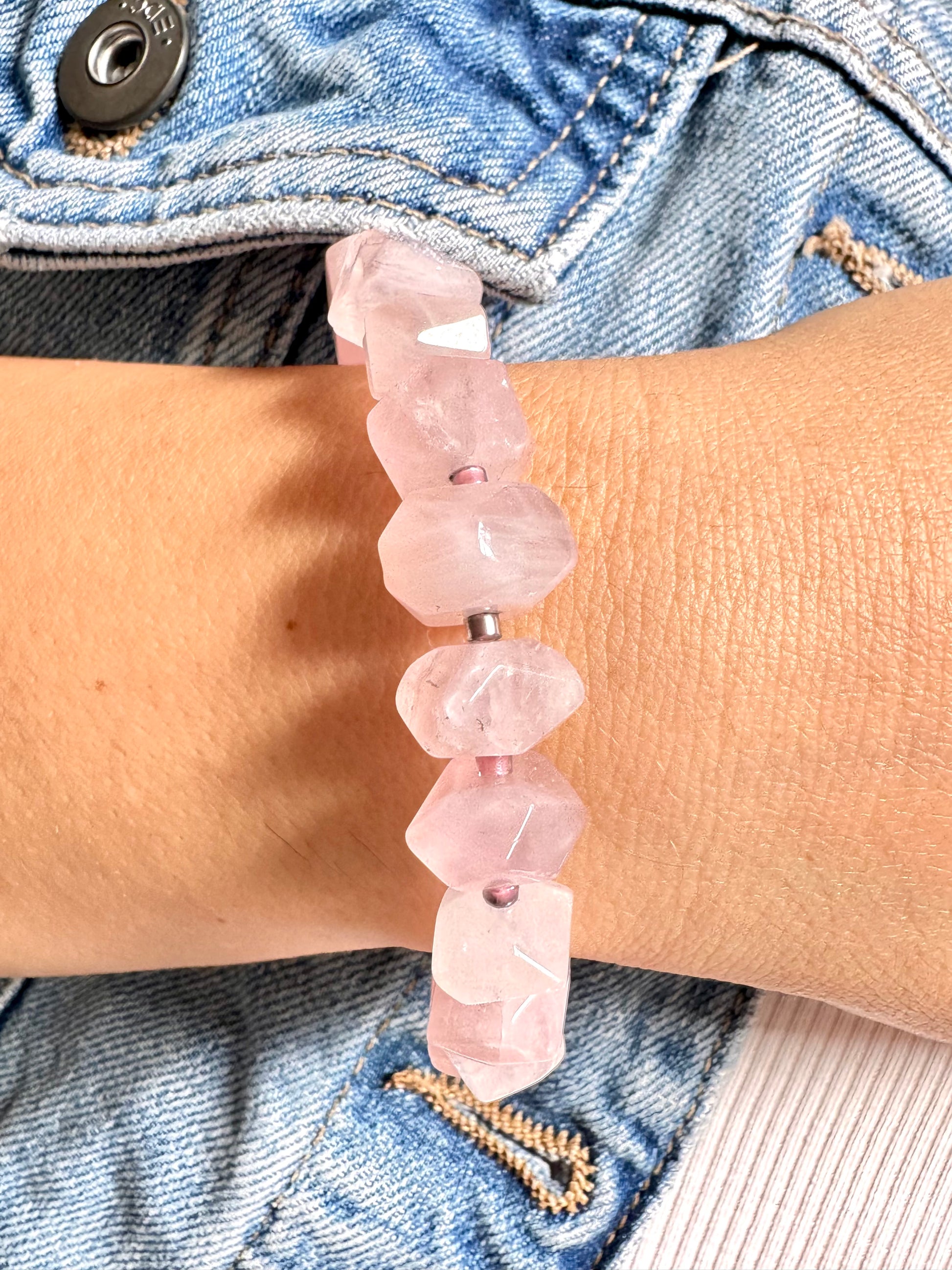 Dieses handgefertigte Armband aus facettiertem Rosenquarz kombiniert die natürliche Schönheit des Edelsteins mit einem modernen, kraftvollen Look. Die zart roséfarbenen Steine sind unregelmäßig geschliffen und wirken besonders lebendig am Handgelenk – ideal als Statement-Piece oder im Layering-Look.