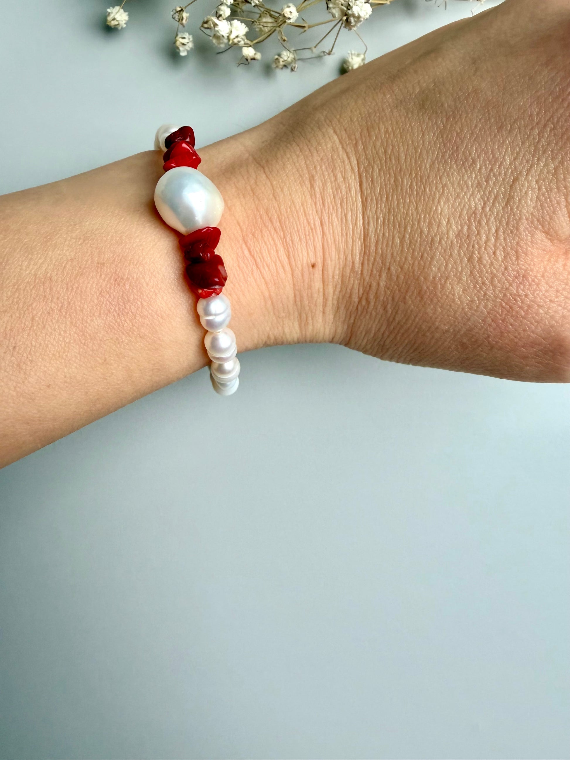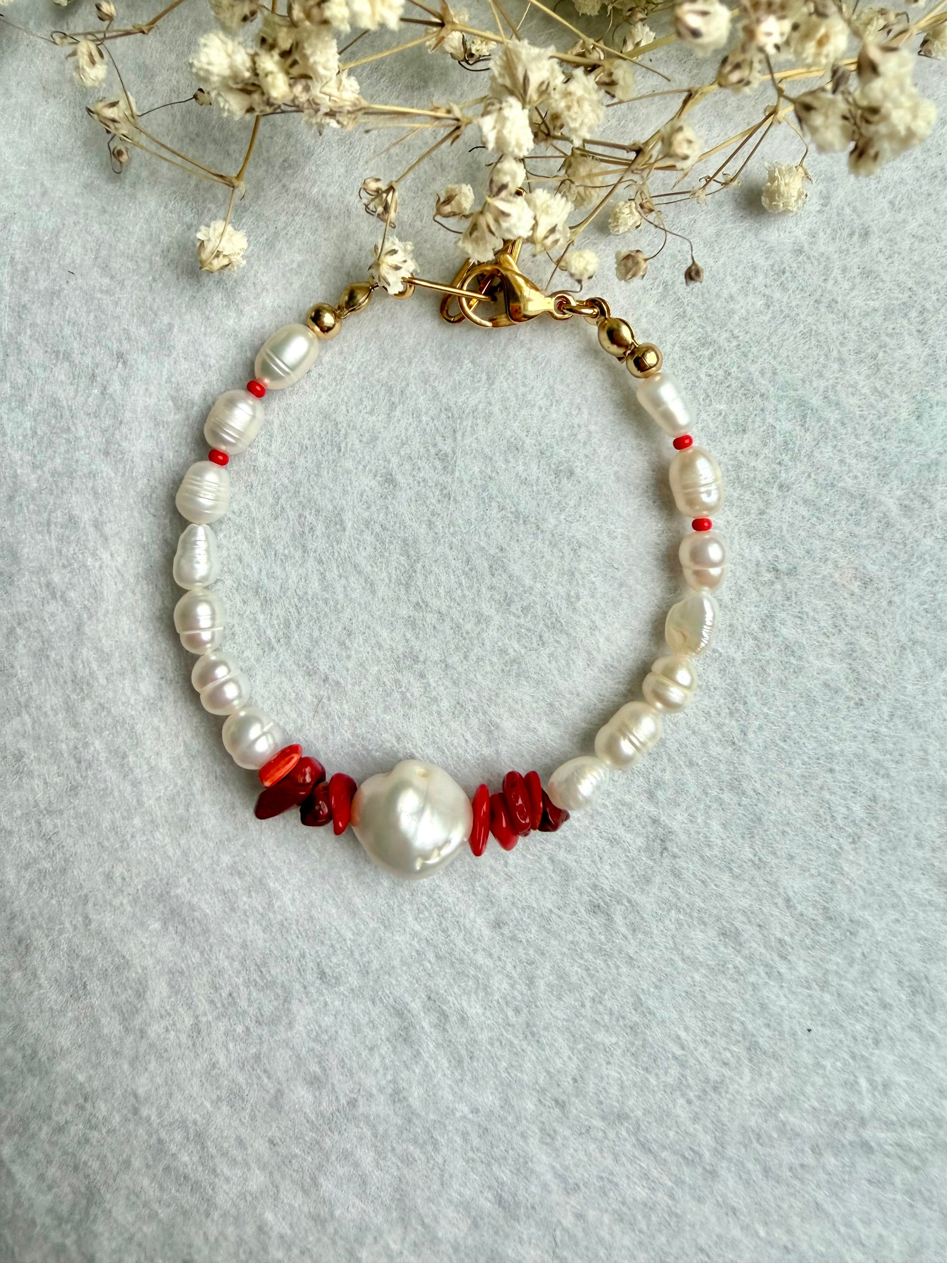 Coral Muse – Armband mit Süßwasserperlen, Barockperle & Korallen – handgefertigt