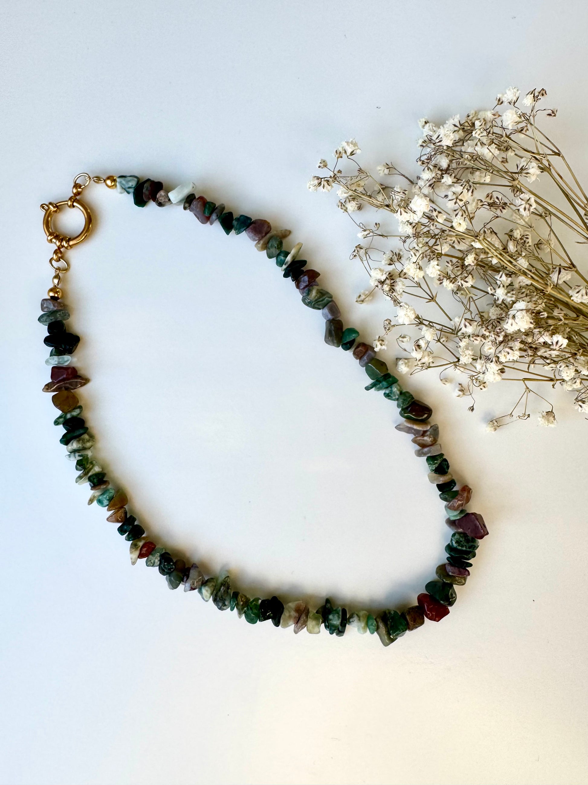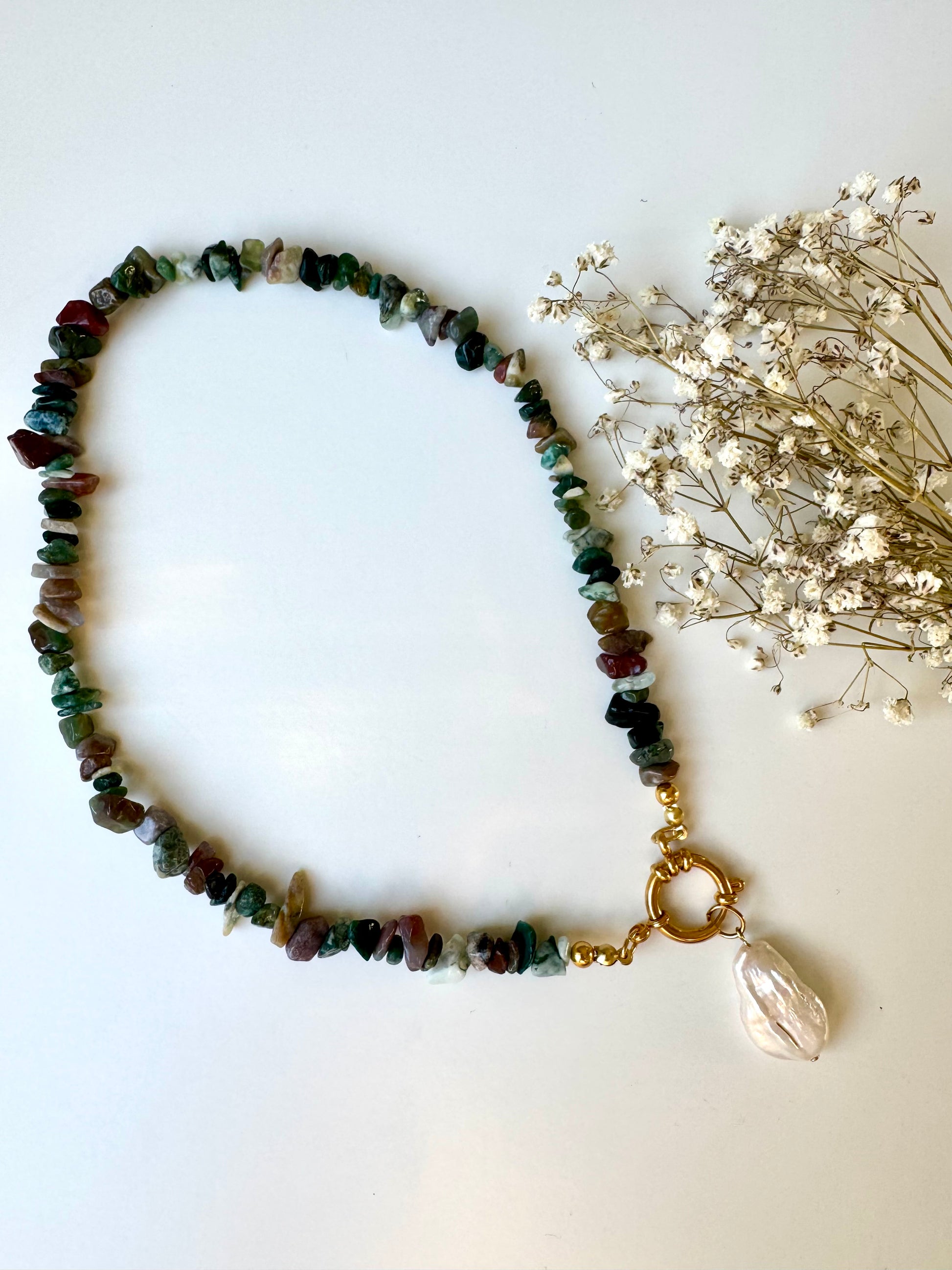 Diese Edelstein-Splitterkette kombiniert natürliche indische Achatperlen in warmen Grün-, Braun- und Rottönen mit einer eleganten Barockperle als Anhänger. Die facettenreichen Farbschattierungen der Achatsteine verleihen der Kette eine erdige, harmonische Ausstrahlung, während der goldfarbene Ringverschluss für einen modernen Akzent sorgt. Ein stilvolles, handgefertigtes Schmuckstück für Liebhaber natürlicher Eleganz.