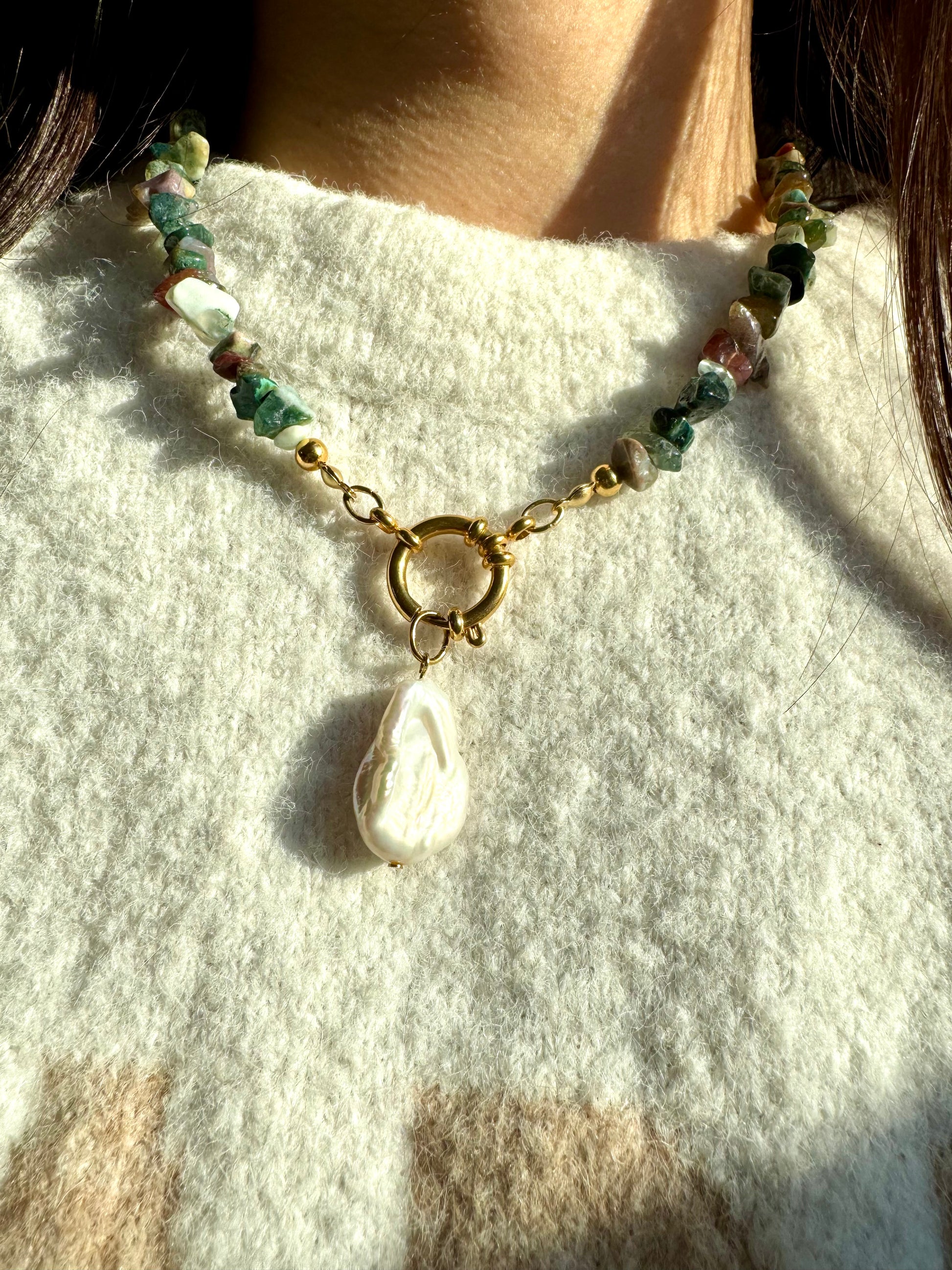 Edelstein-Splitterkette aus indischen Achatperlen mit Barockperle & goldfarbenem Ringverschluss – handgefertigt