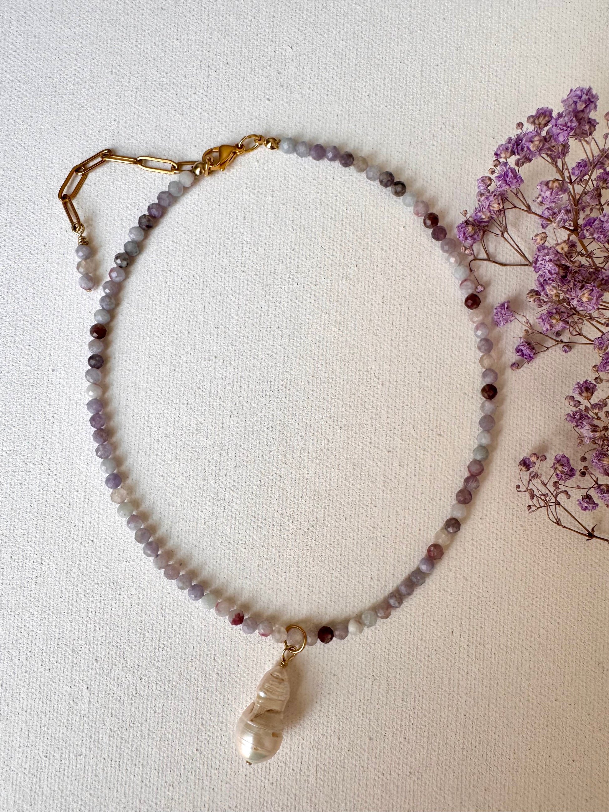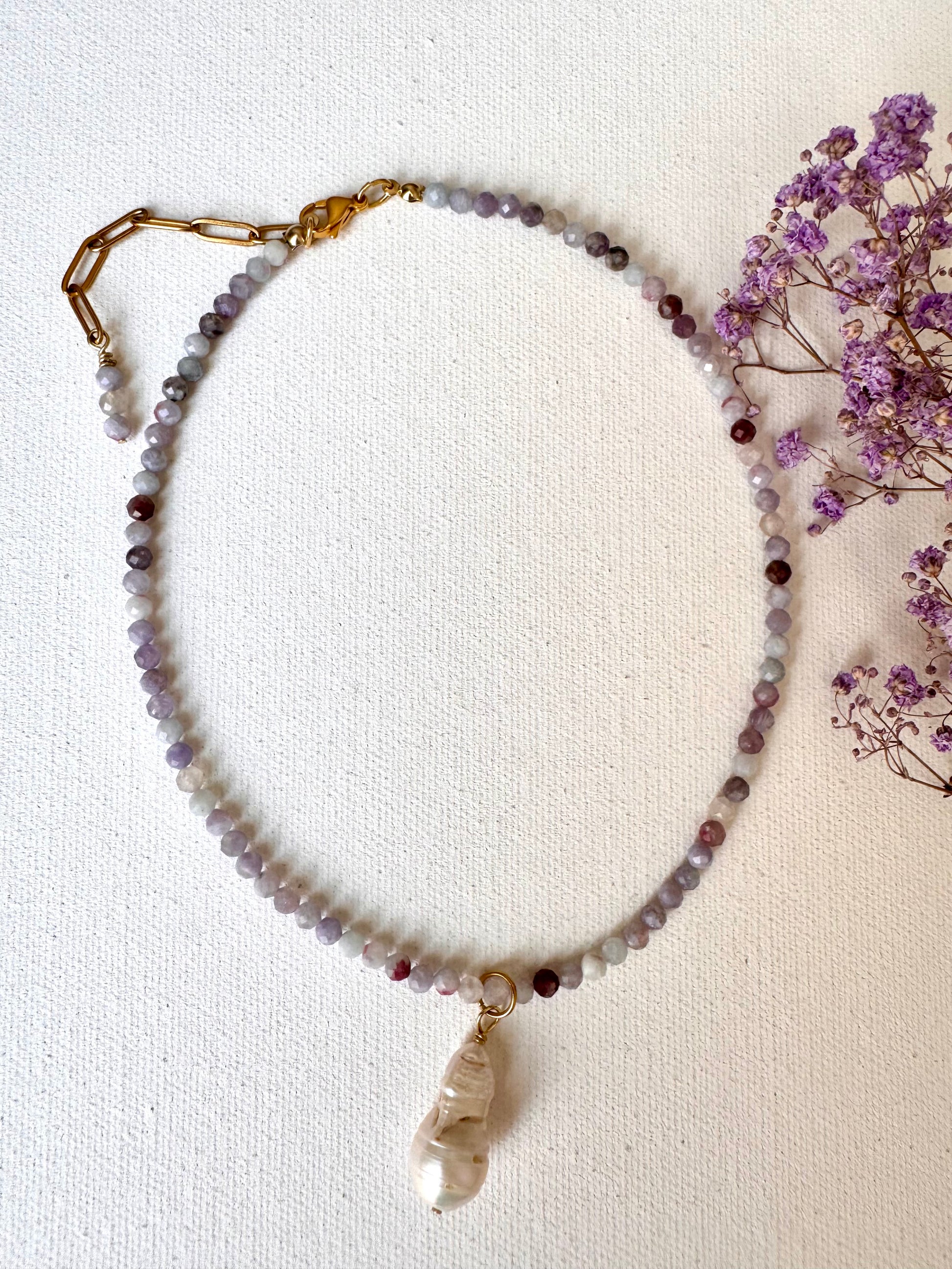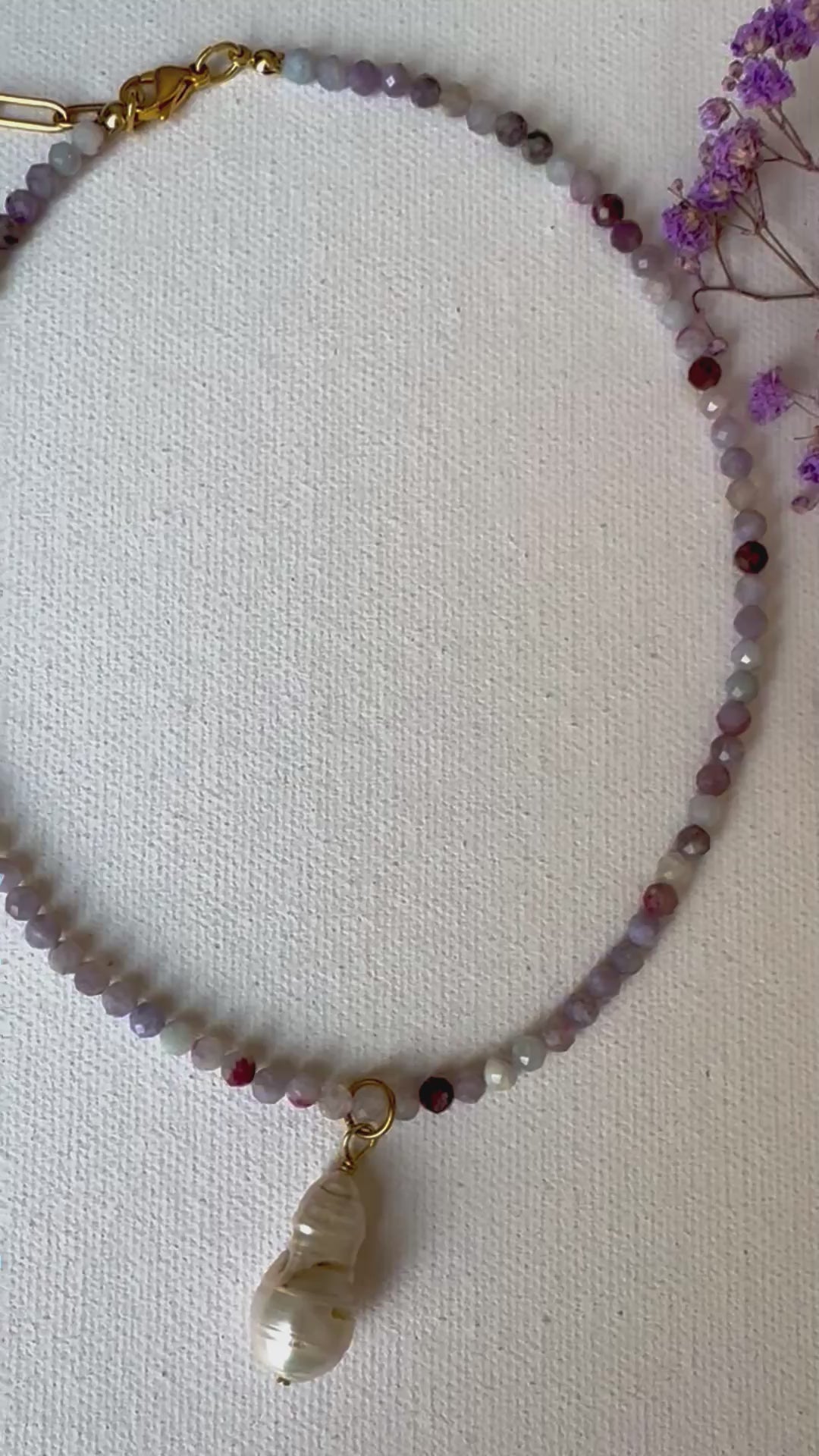 Diese handgefertigte Kette kombiniert facettierte Edelsteine in zarten Flieder- und Naturtönen mit einer großen Barockperle als Anhänger. Die goldfarbenen Details und die feine Gliederkette zum Verstellen machen sie zu einem eleganten und zugleich vielseitigen Schmuckstück.