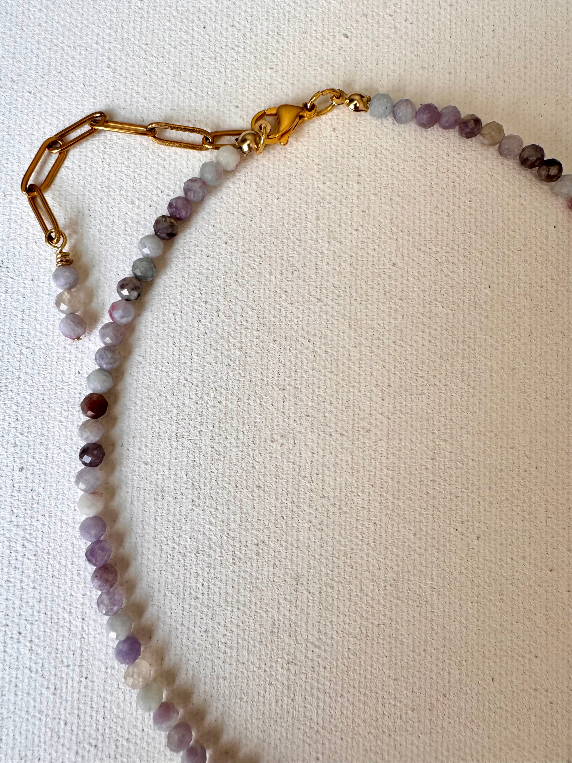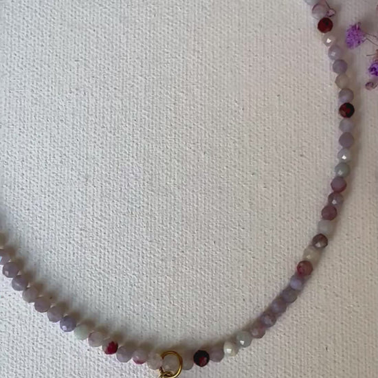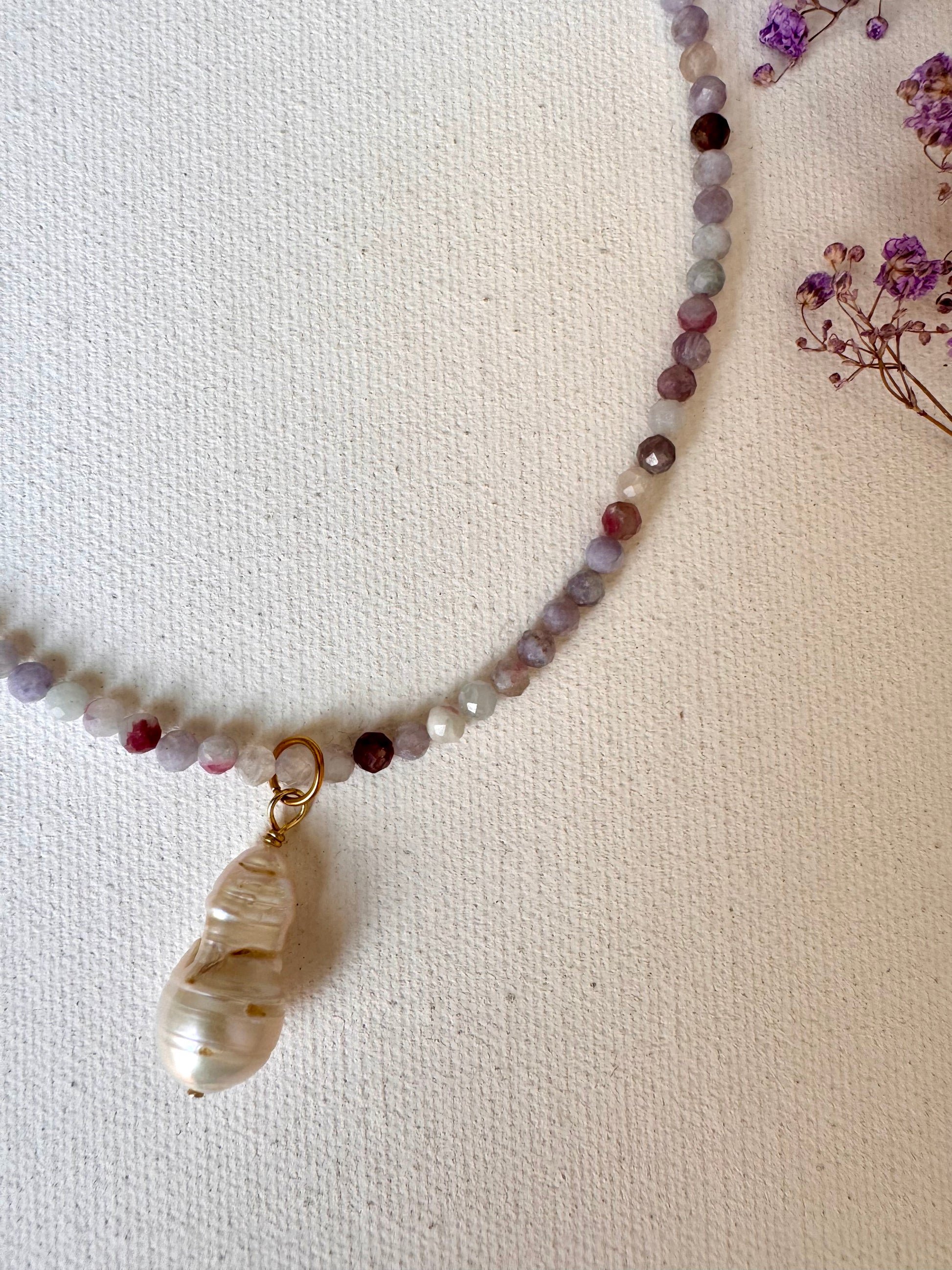 Diese handgefertigte Kette kombiniert facettierte Edelsteine in zarten Flieder- und Naturtönen mit einer großen Barockperle als Anhänger. Die goldfarbenen Details und die feine Gliederkette zum Verstellen machen sie zu einem eleganten und zugleich vielseitigen Schmuckstück.