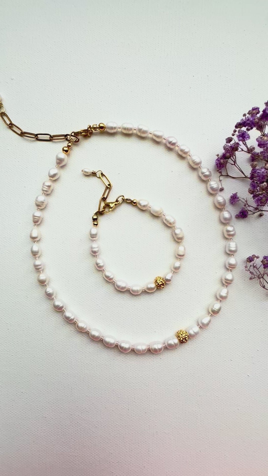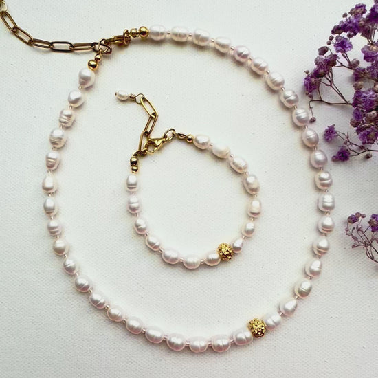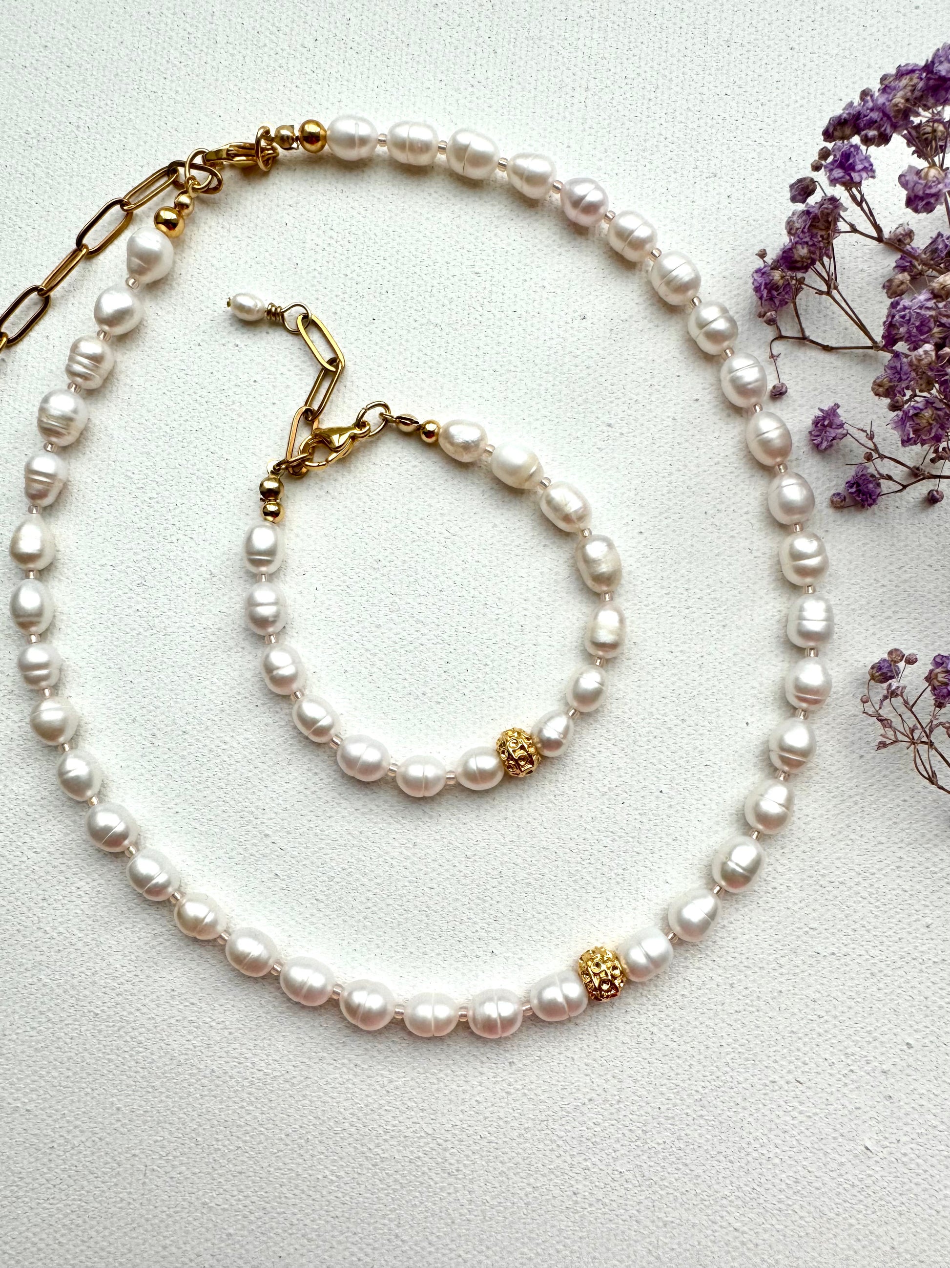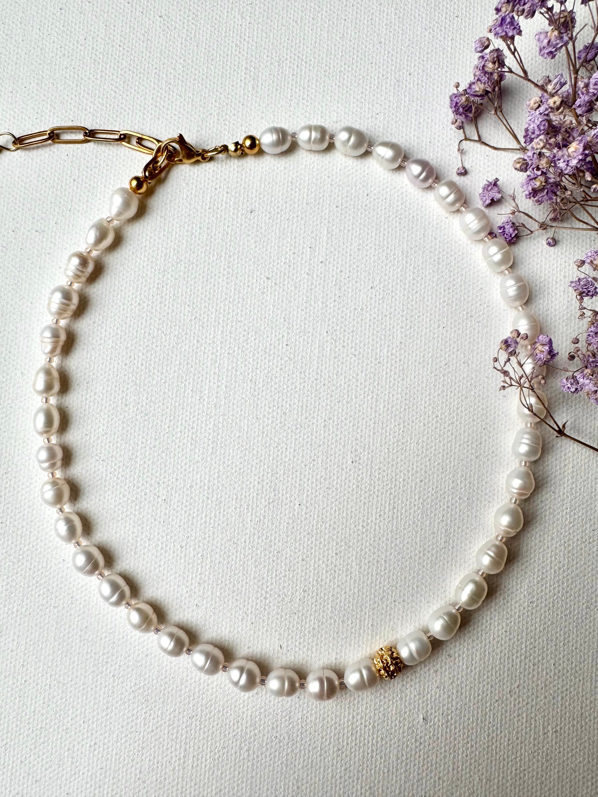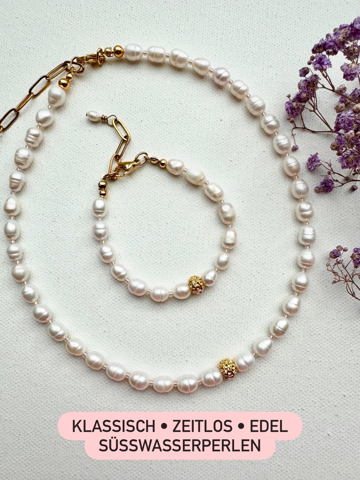 Diese klassische Halskette aus edlen Süßwasserperlen vereint zeitlose Eleganz mit einem Hauch moderner Raffinesse. Die leicht unregelmäßigen Perlen verleihen dem Schmuckstück einen natürlichen Charakter, während das goldfarbene Zierelement einen stilvollen Blickfang bildet. Perfekt für besondere Anlässe oder als edles Everyday-Piece.