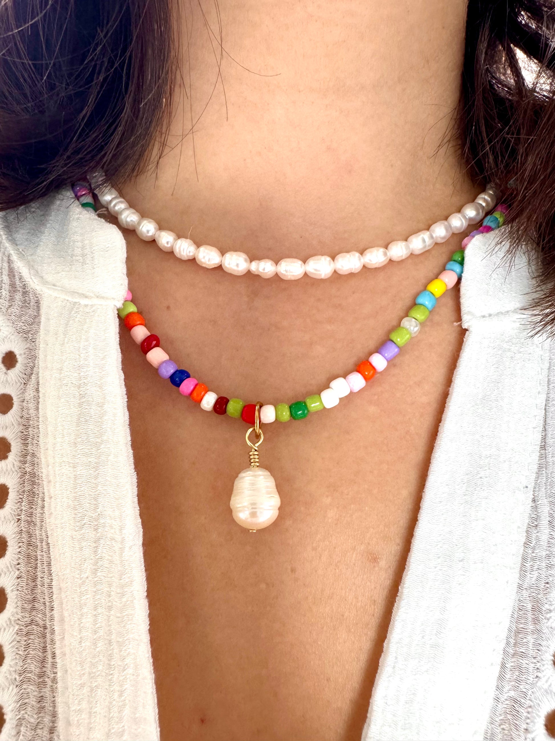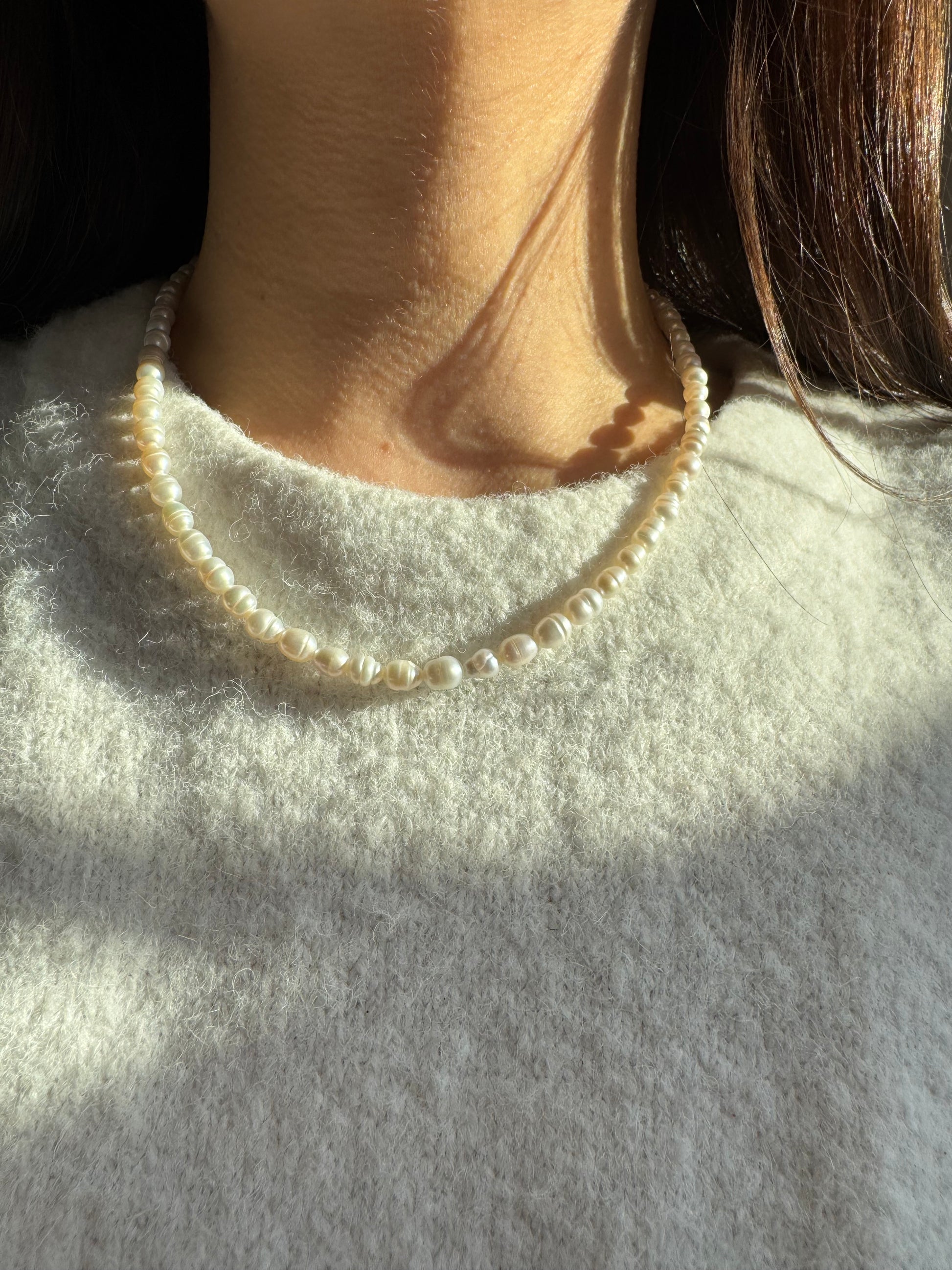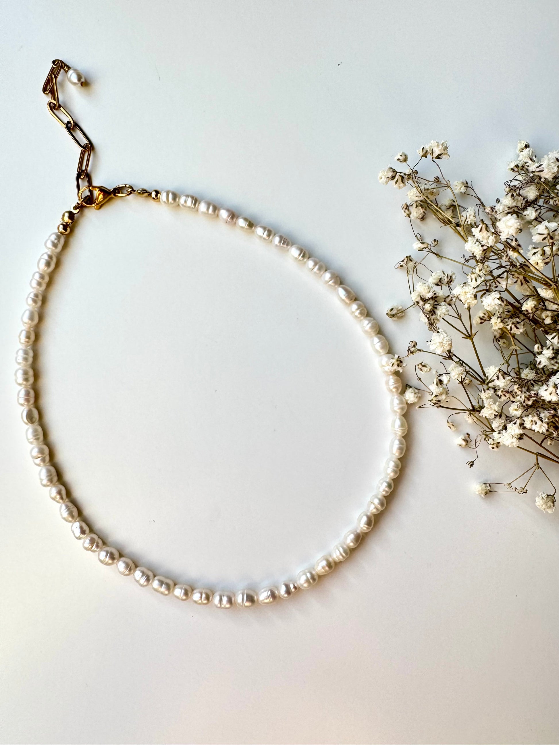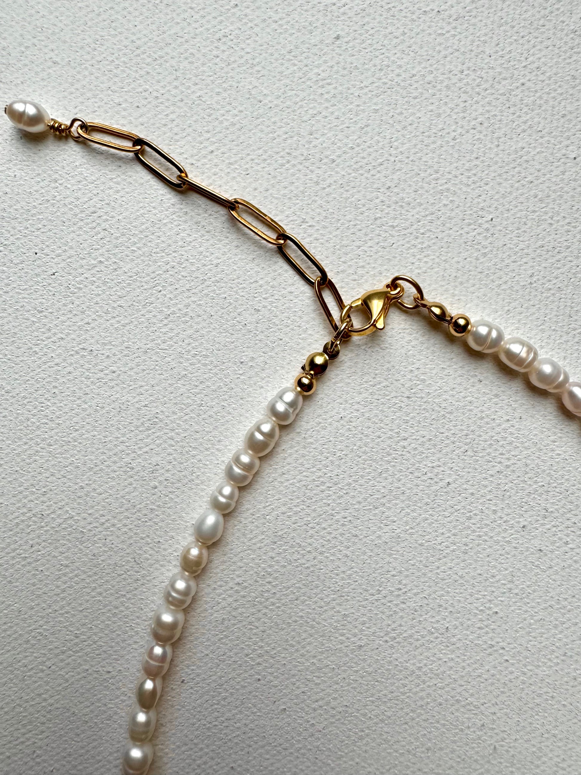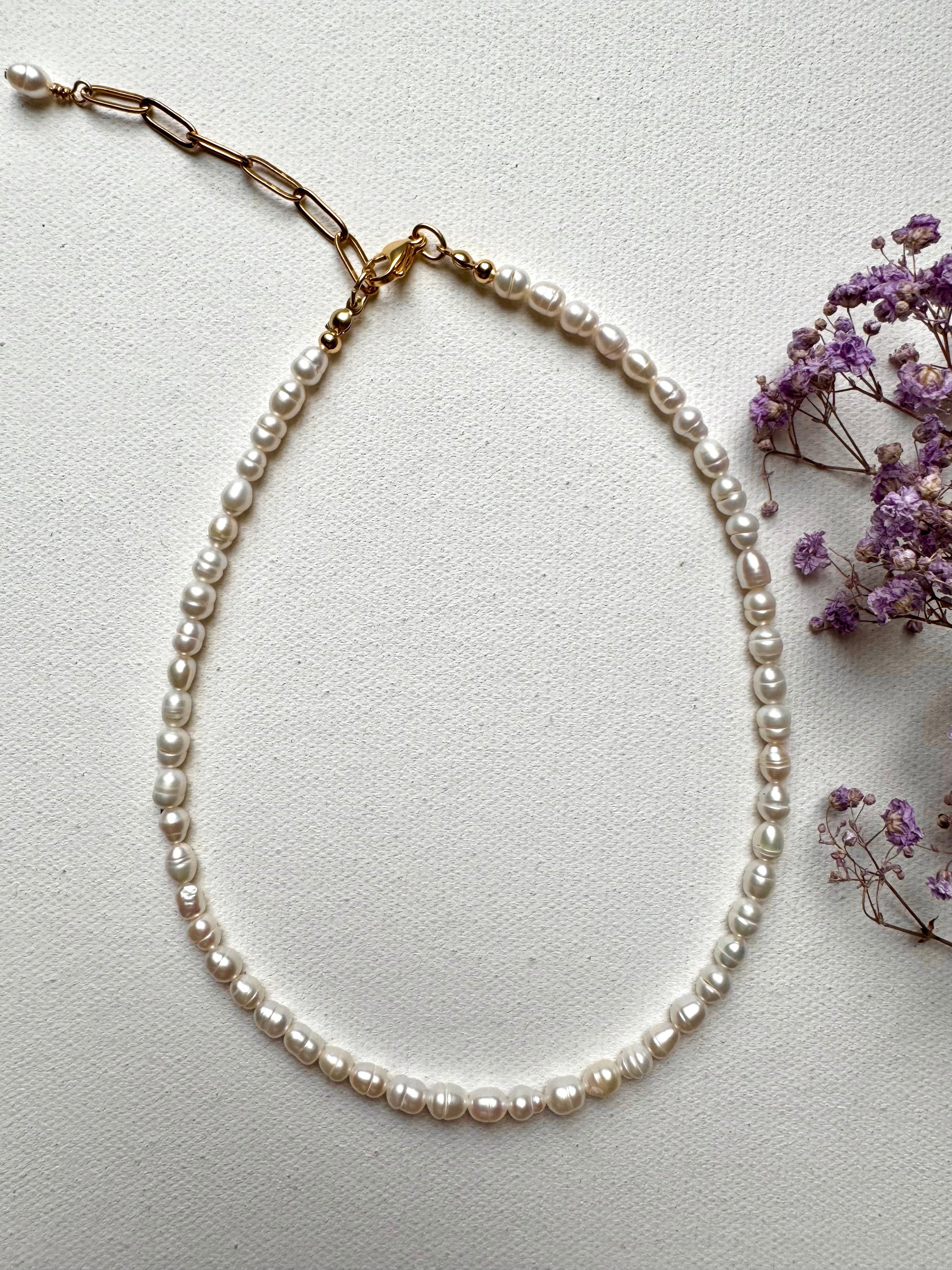 Diese zarte Halskette aus natürlichen weißen Süßwasserperlen überzeugt mit ihrer klassischen Eleganz und dem modernen Twist durch die 18 k vergoldete Paperclip-Verlängerung. Die unregelmäßig geformten Perlen verleihen jedem Stück einen einzigartigen Charakter und lassen sich wunderbar sowohl einzeln als auch im Layering tragen.