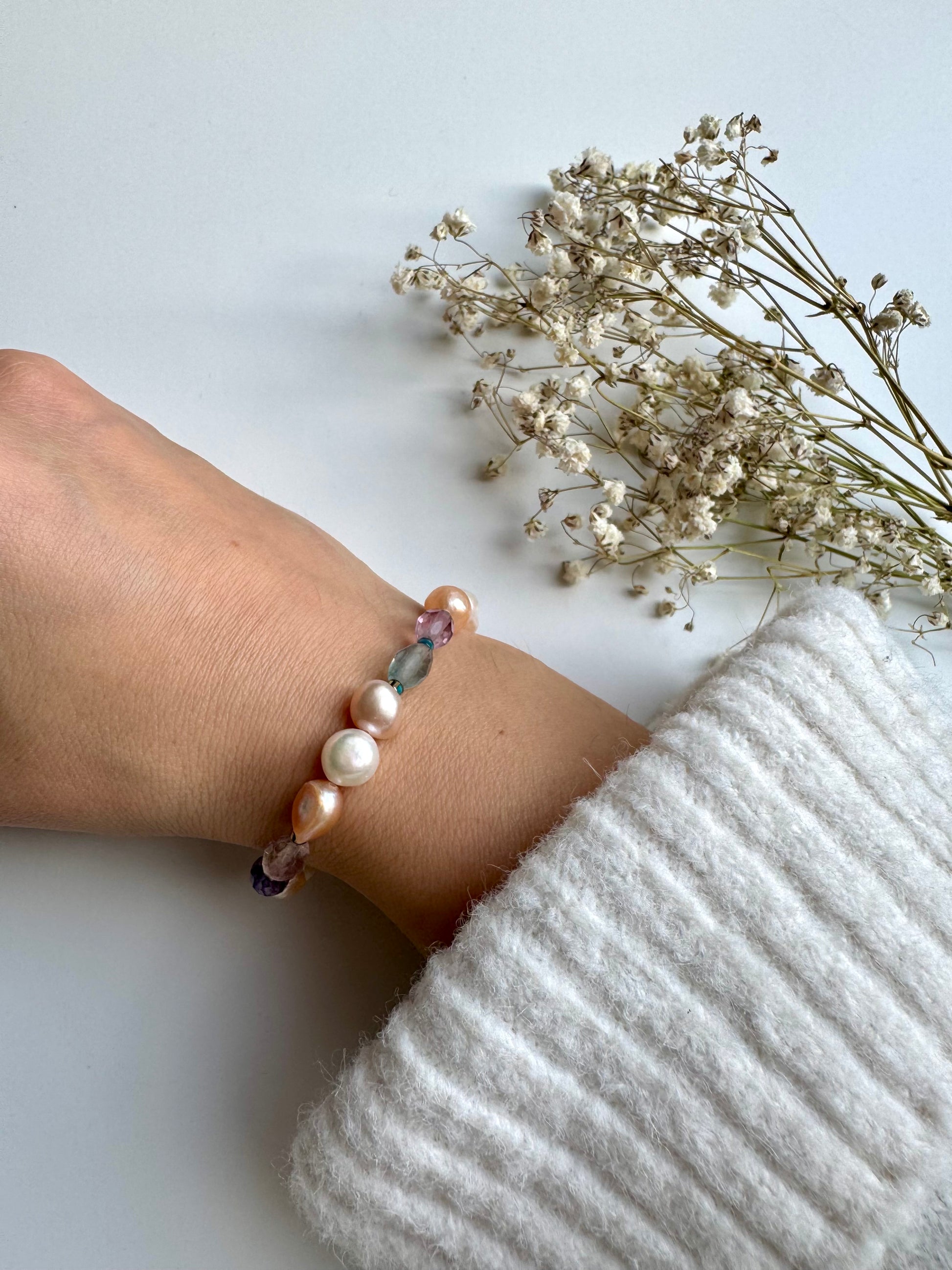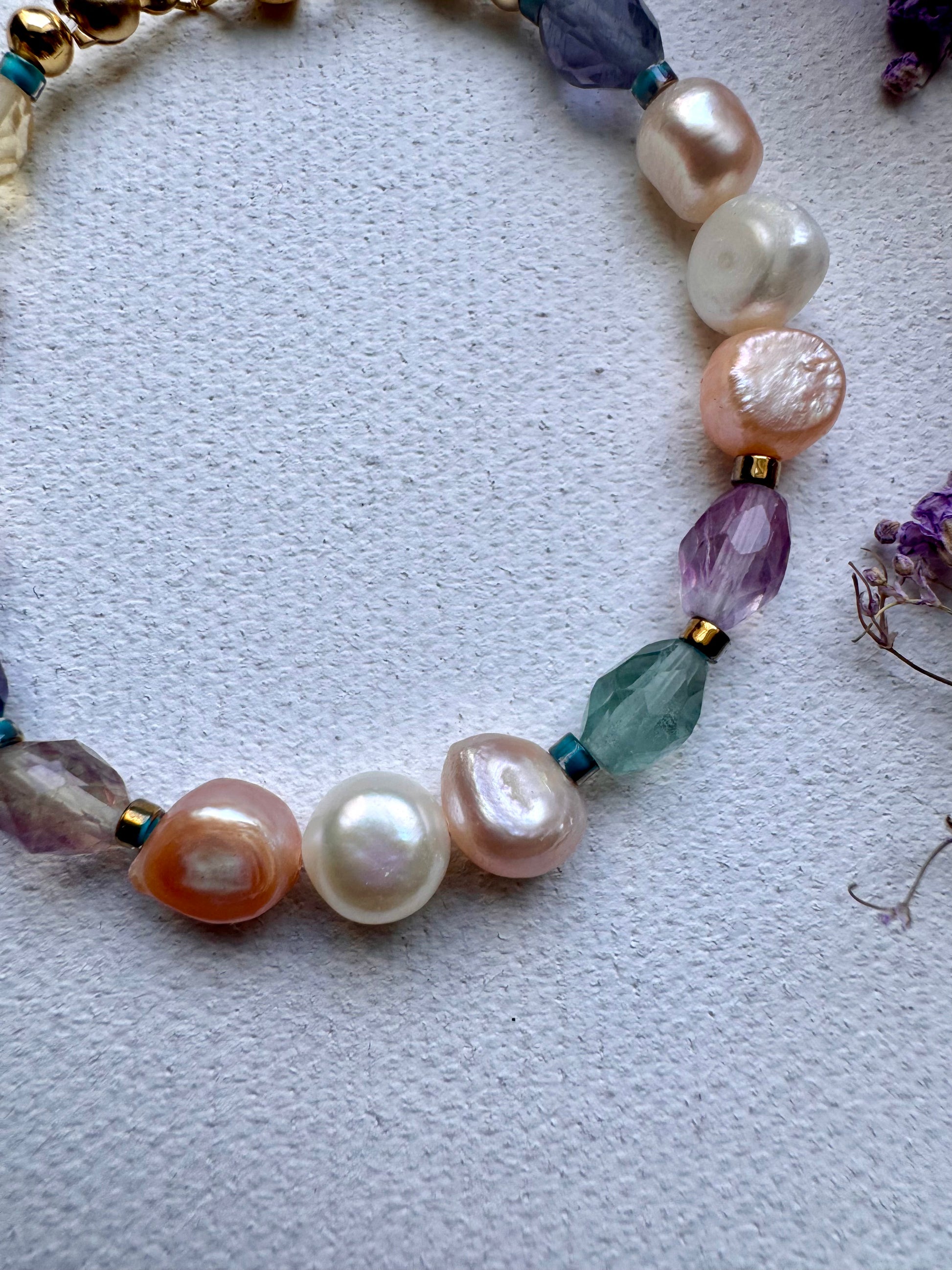 Dieses handgefertigte Armband verbindet natürliche Eleganz mit farbenfrohem Charme. Schimmernde Süßwasserperlen in Weiß, Rosa und Apricot werden ergänzt durch eine feine Auswahl facettierter Edelsteinperlen – darunter auch Fluorit in zarten Blau-, Grün- und Lilatönen. Goldfarbene Akzente verleihen dem Design eine edle Note. Dank der Verlängerungskette mit Perlenabschluss ist die Passform individuell anpassbar.