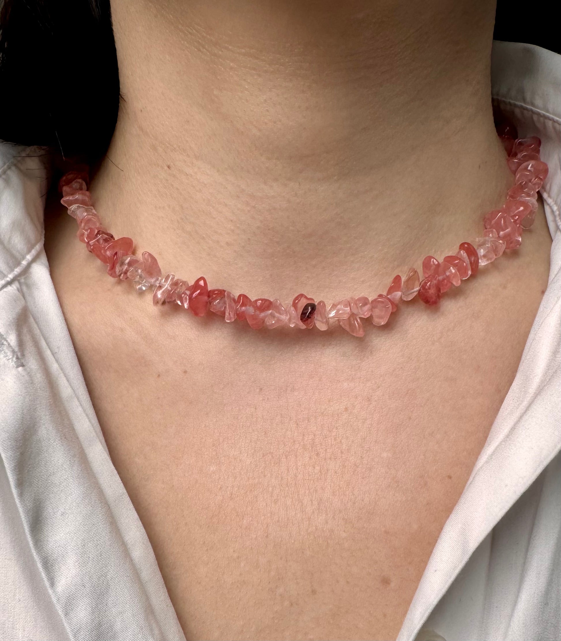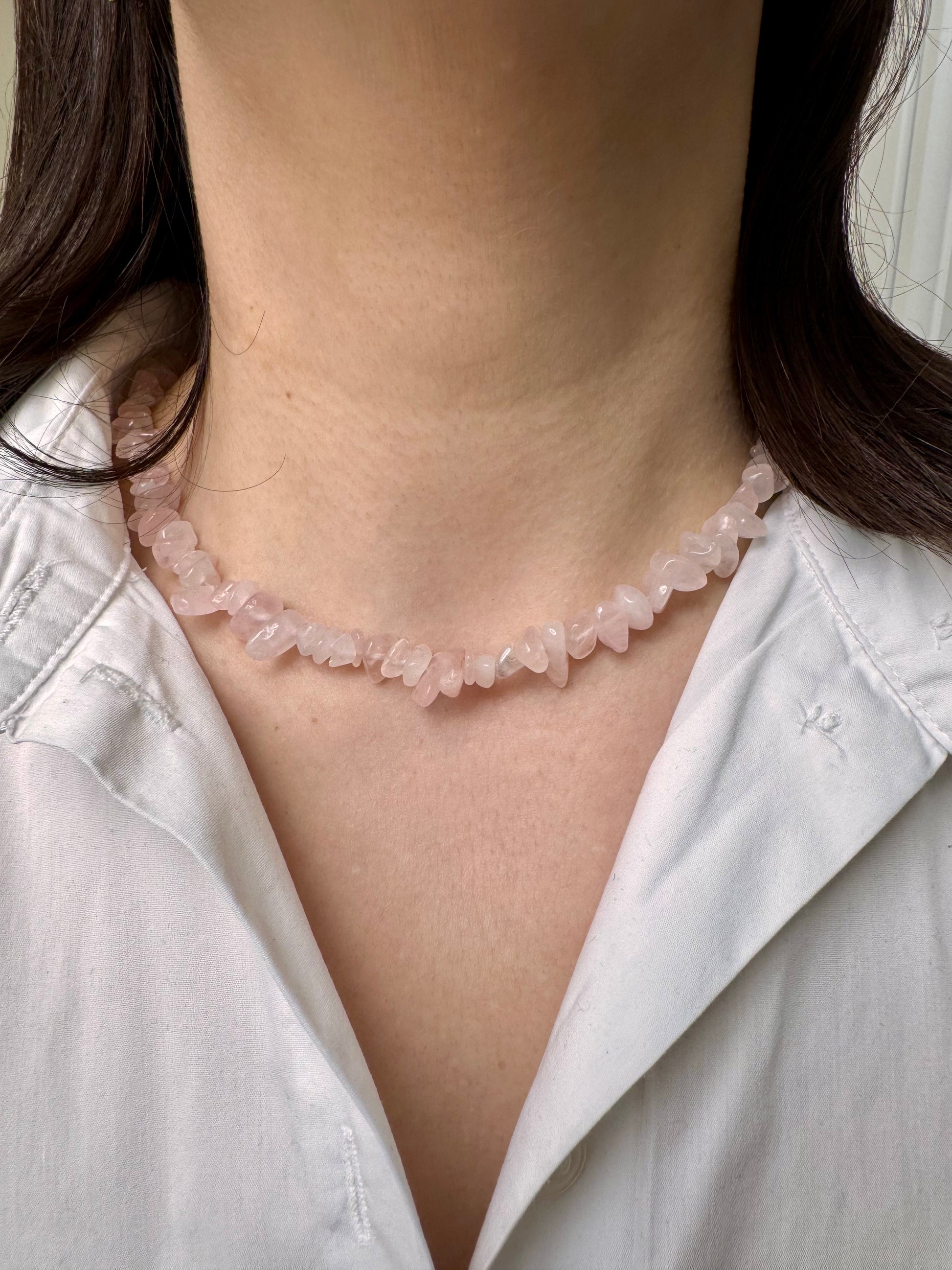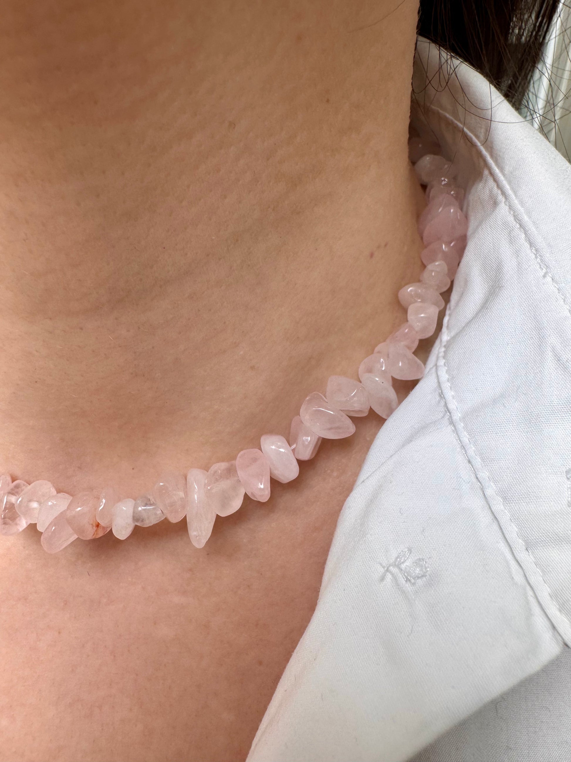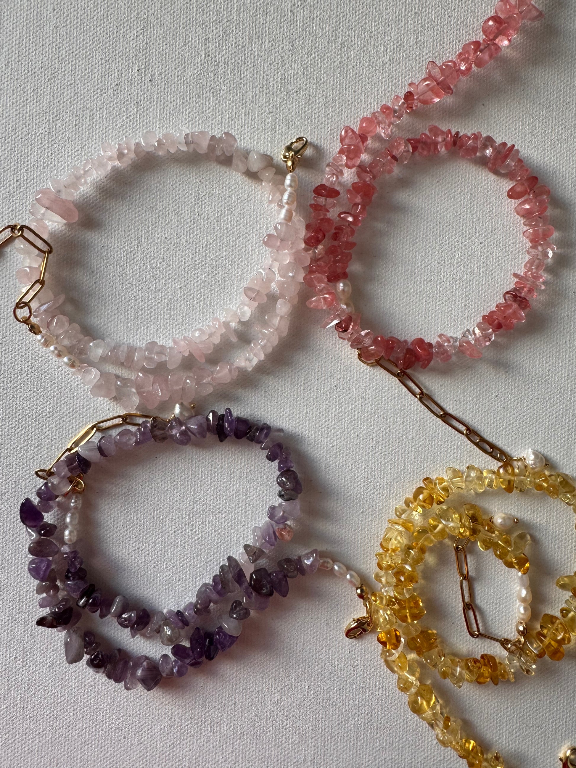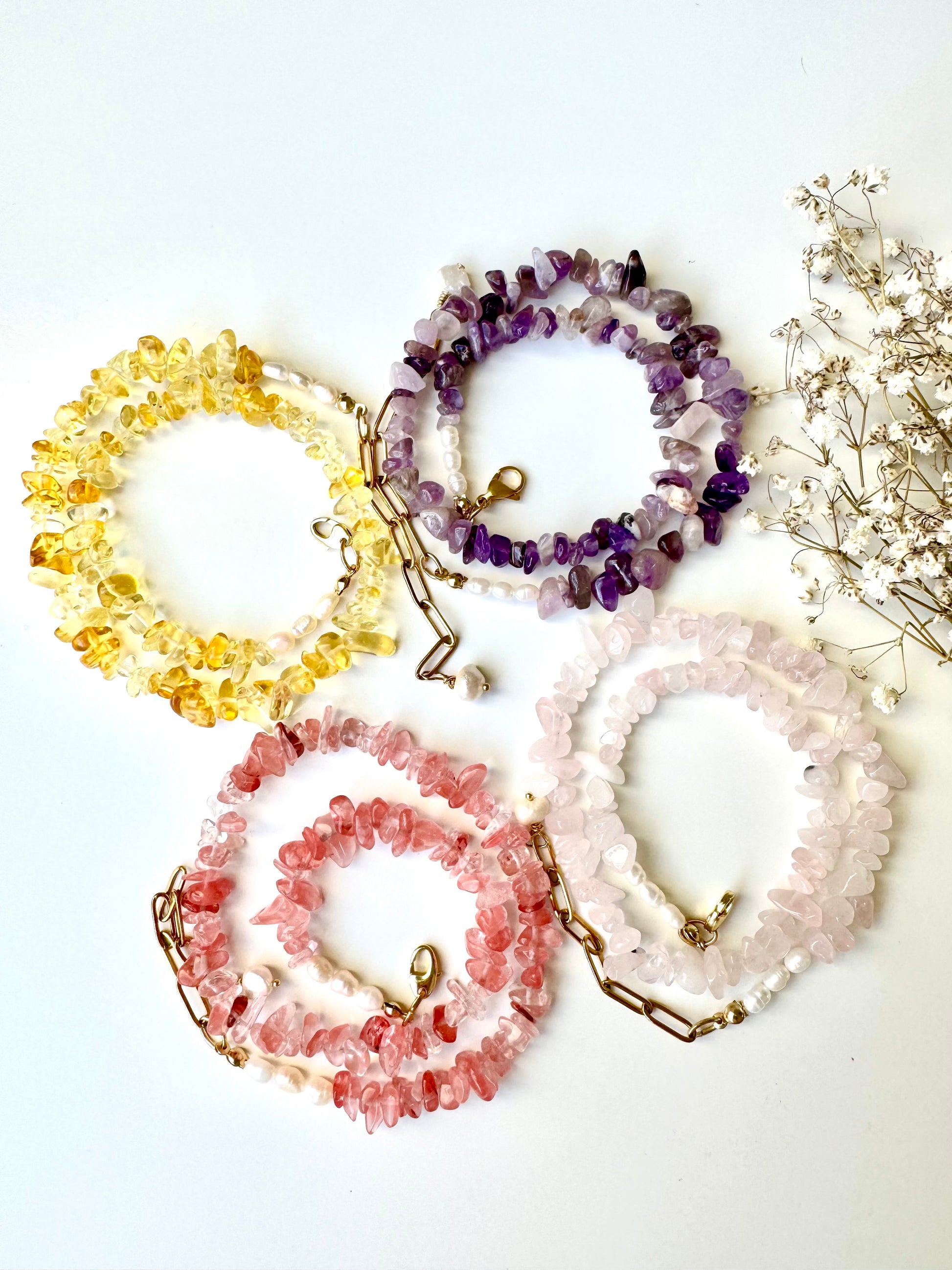 - Material: Edelsteinchips (wahlweise Rosenquarz, Wassermelonenquarz, Amethyst, Citrin) & Süßwasserperlen
