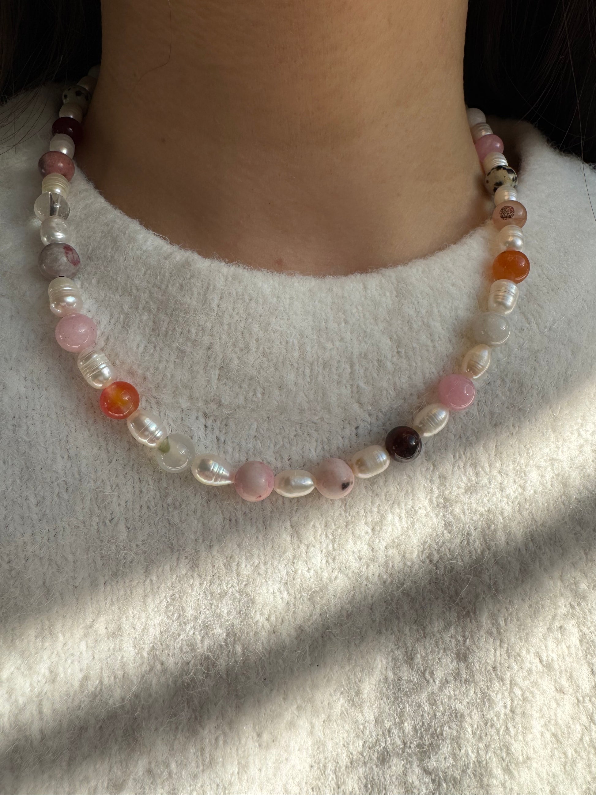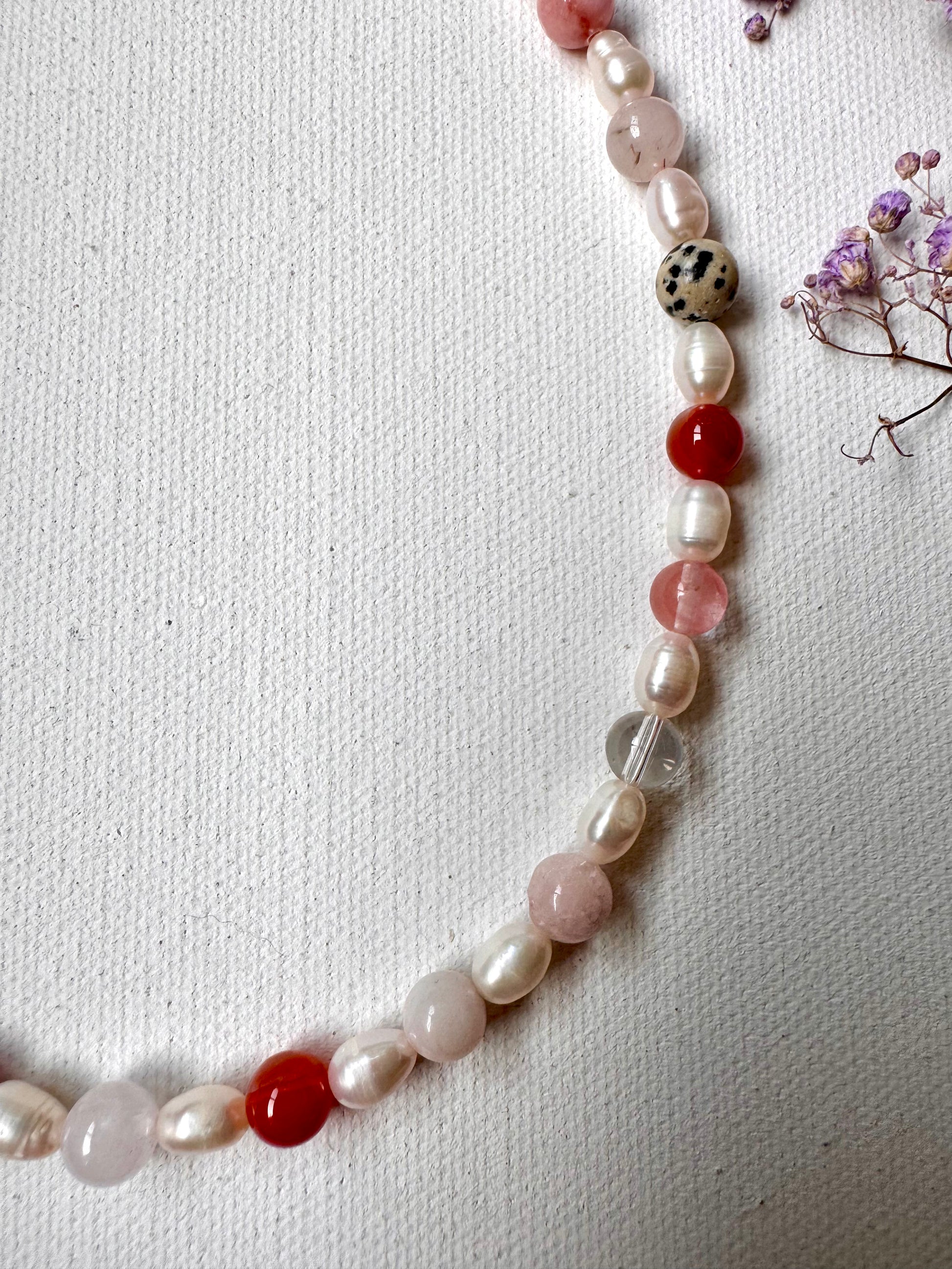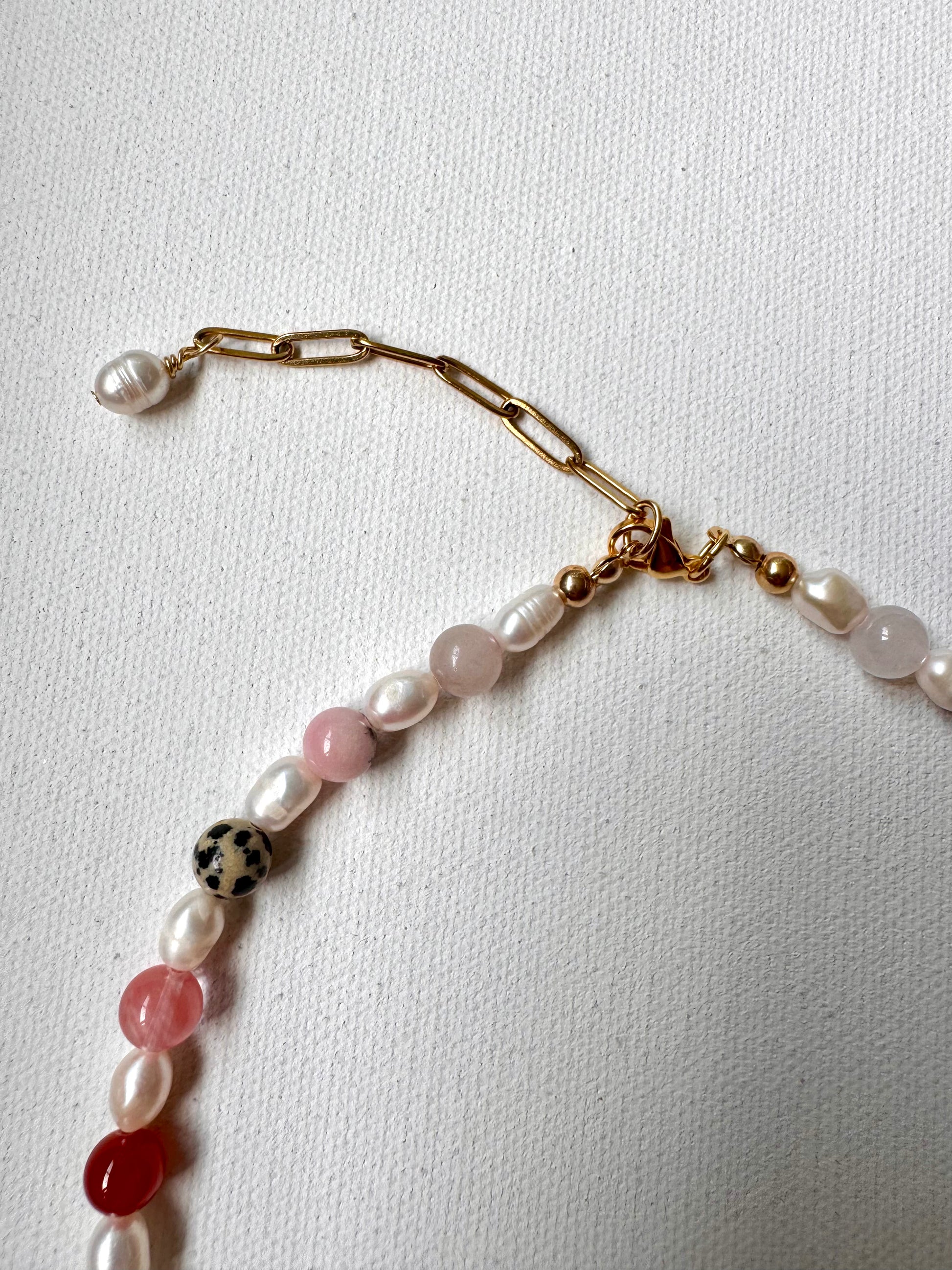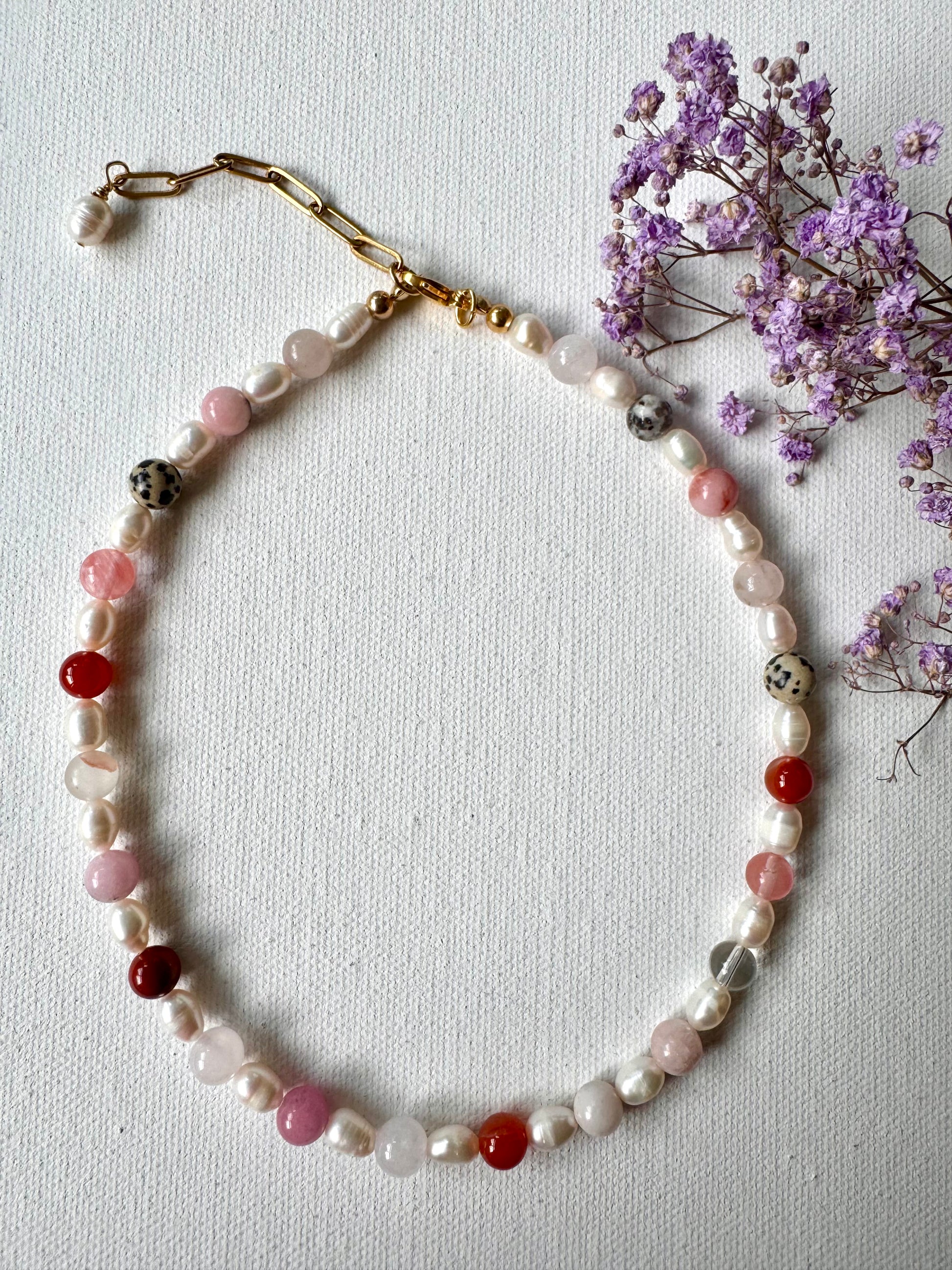 Diese elegante Halskette vereint zarte Süßwasserperlen mit einem harmonischen Mix aus roséfarbenen Edelsteinen, Dalmatinerstein und goldenen Akzenten. Die sanften Töne in Rosa, Weiß und Rot werden durch feine natürliche Muster belebt und machen jedes Stück zu einem kleinen Kunstwerk. Die unregelmäßige Perlenform sorgt für einen modernen Look, der gleichzeitig klassisch bleibt.