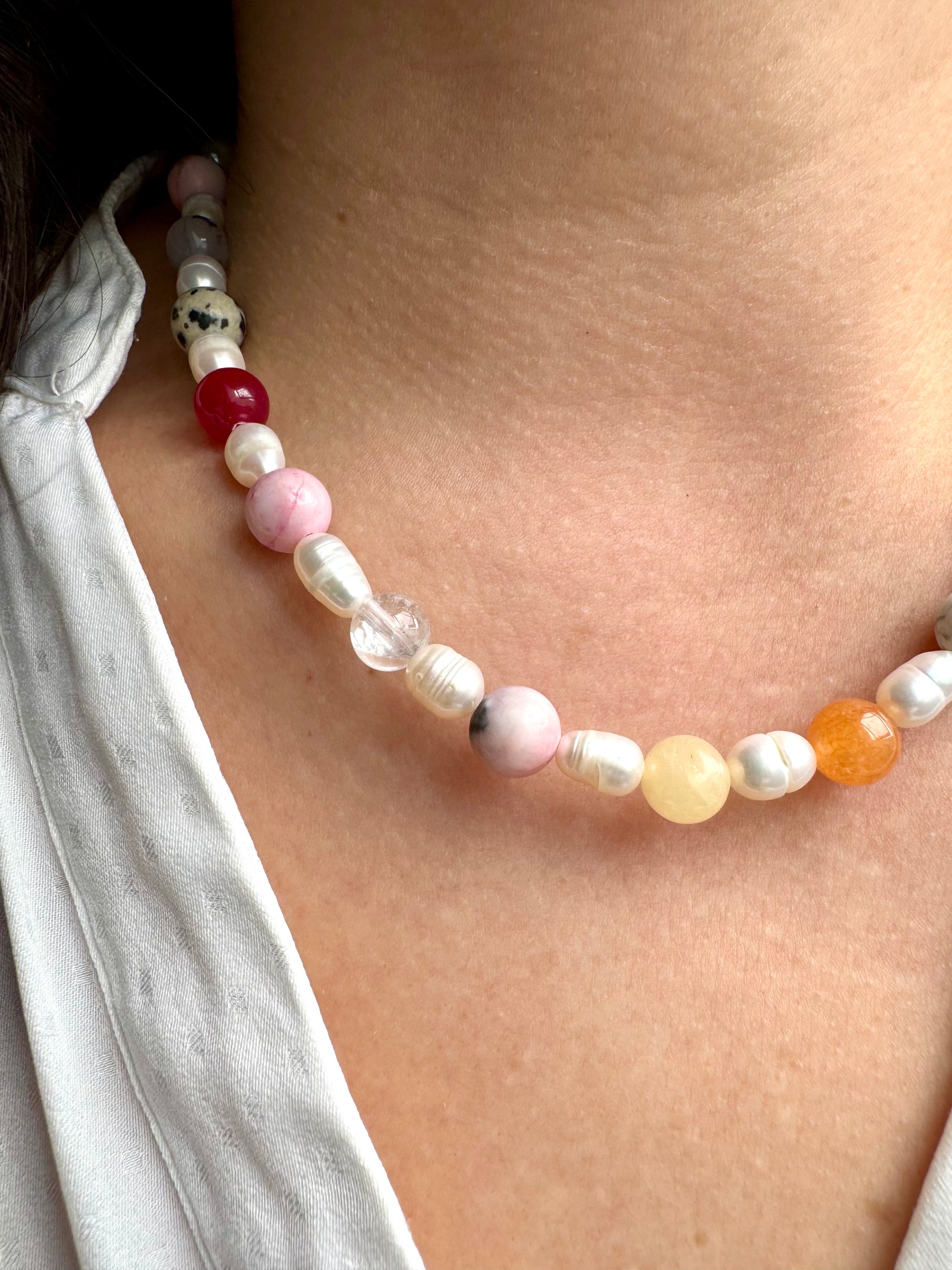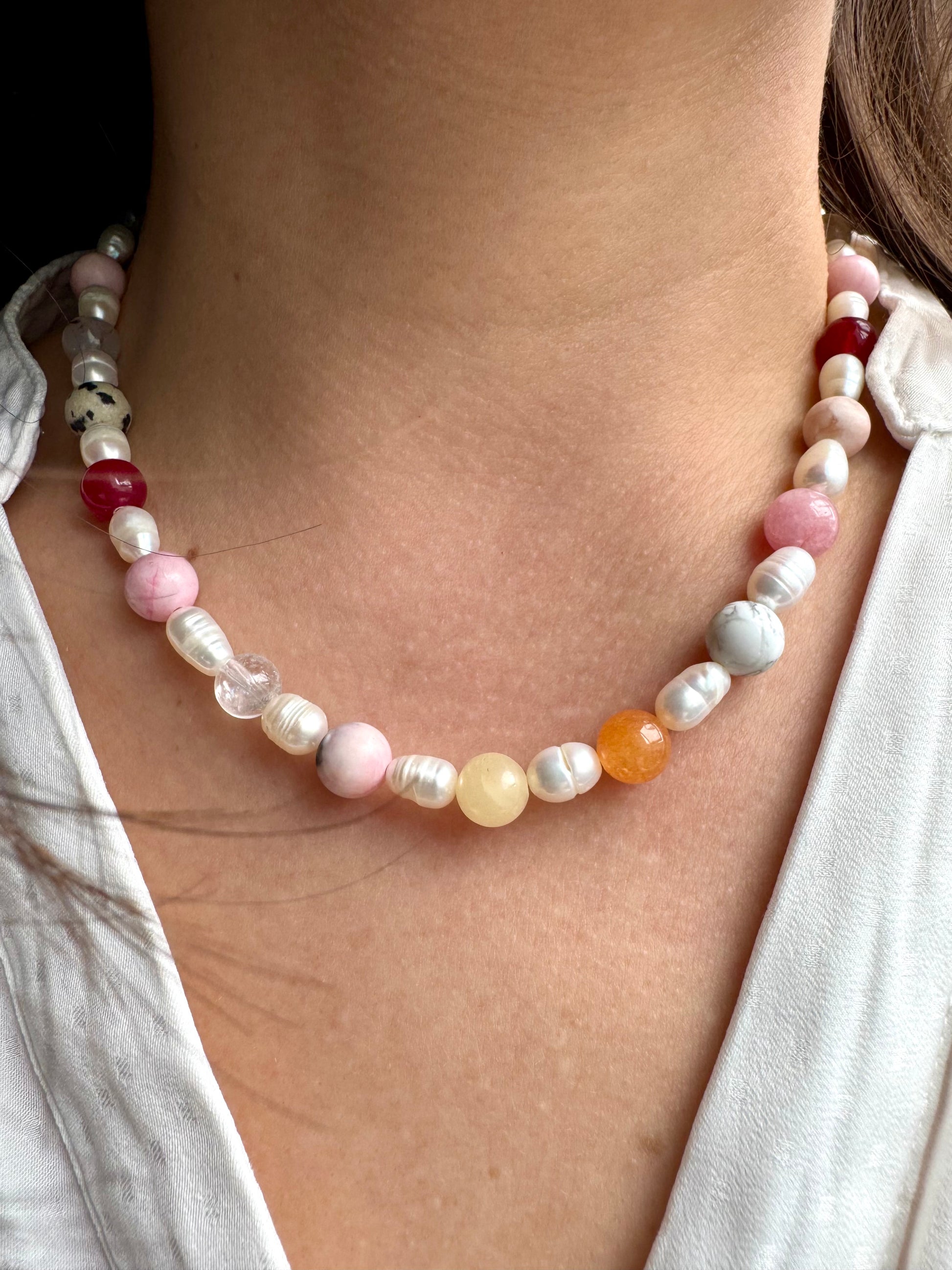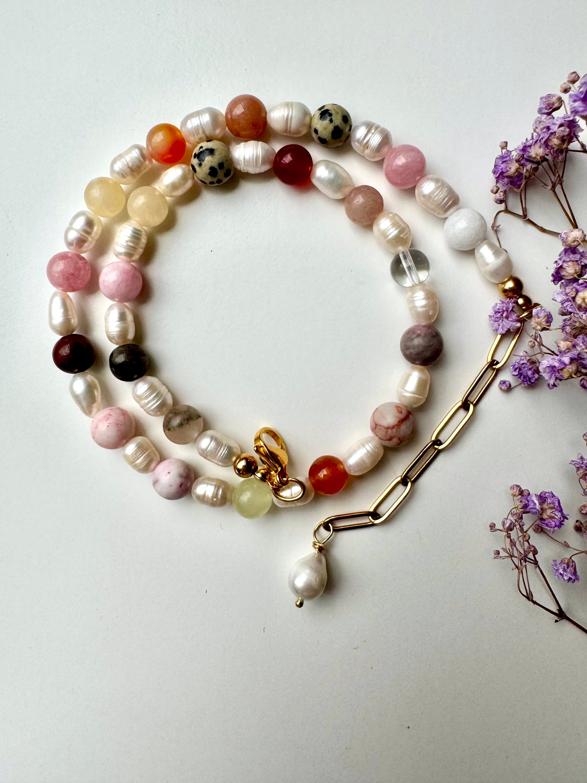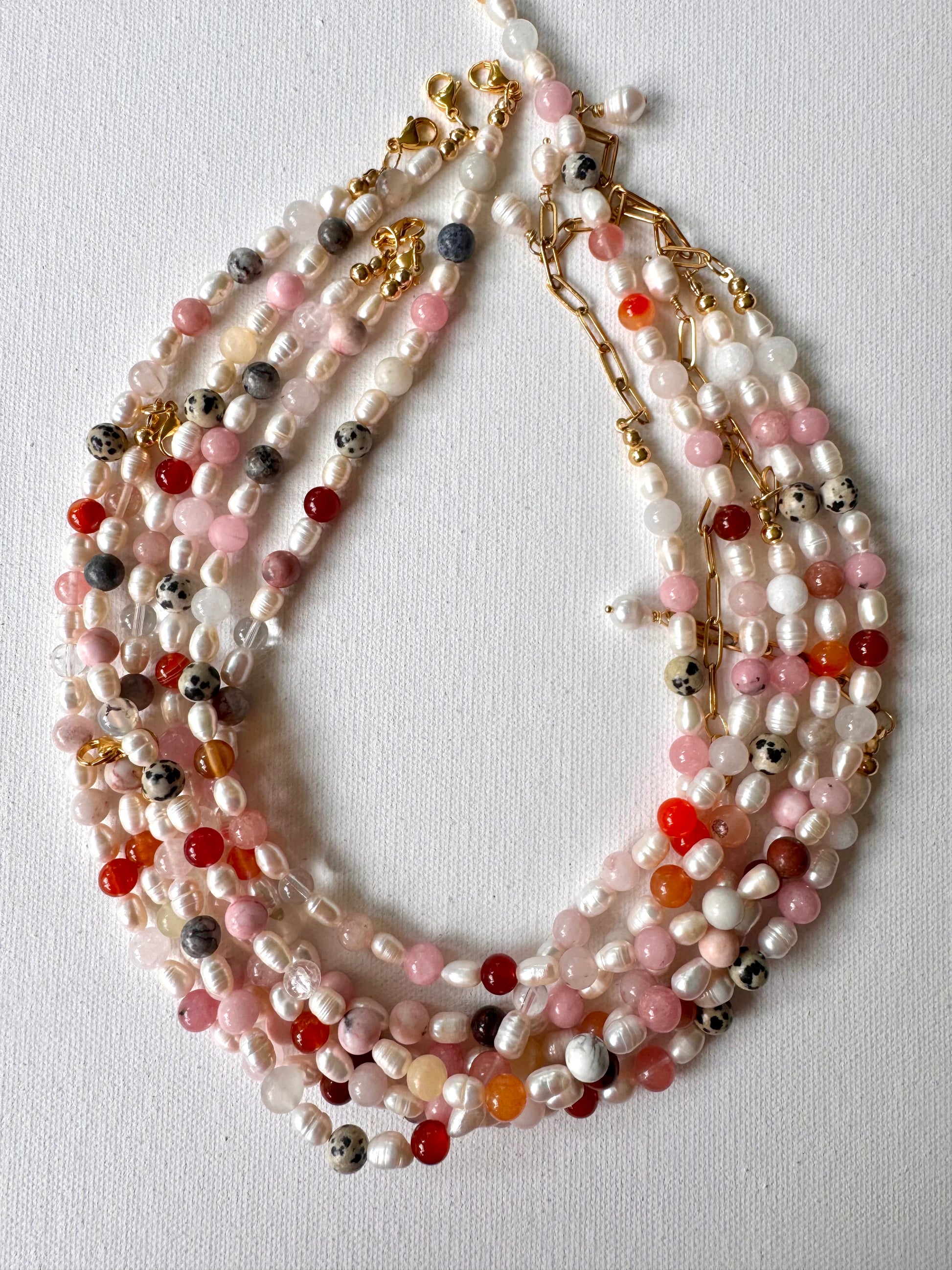 Diese elegante Halskette vereint zarte Süßwasserperlen mit einem harmonischen Mix aus roséfarbenen Edelsteinen, Dalmatinerstein und goldenen Akzenten. Die sanften Töne in Rosa, Weiß und Rot werden durch feine natürliche Muster belebt und machen jedes Stück zu einem kleinen Kunstwerk. Die unregelmäßige Perlenform sorgt für einen modernen Look, der gleichzeitig klassisch bleibt.