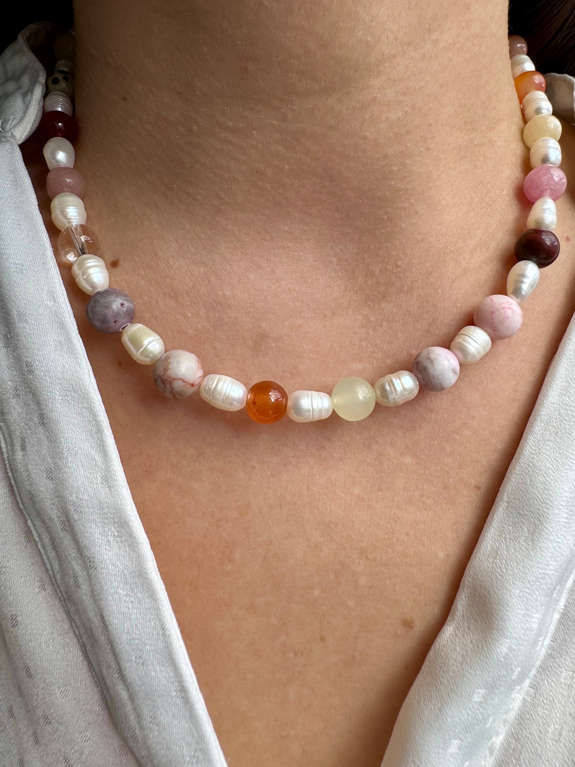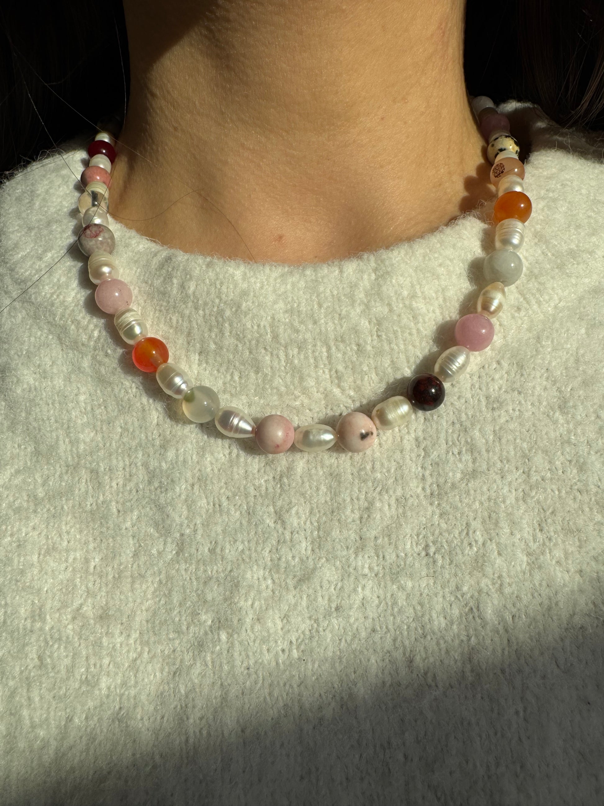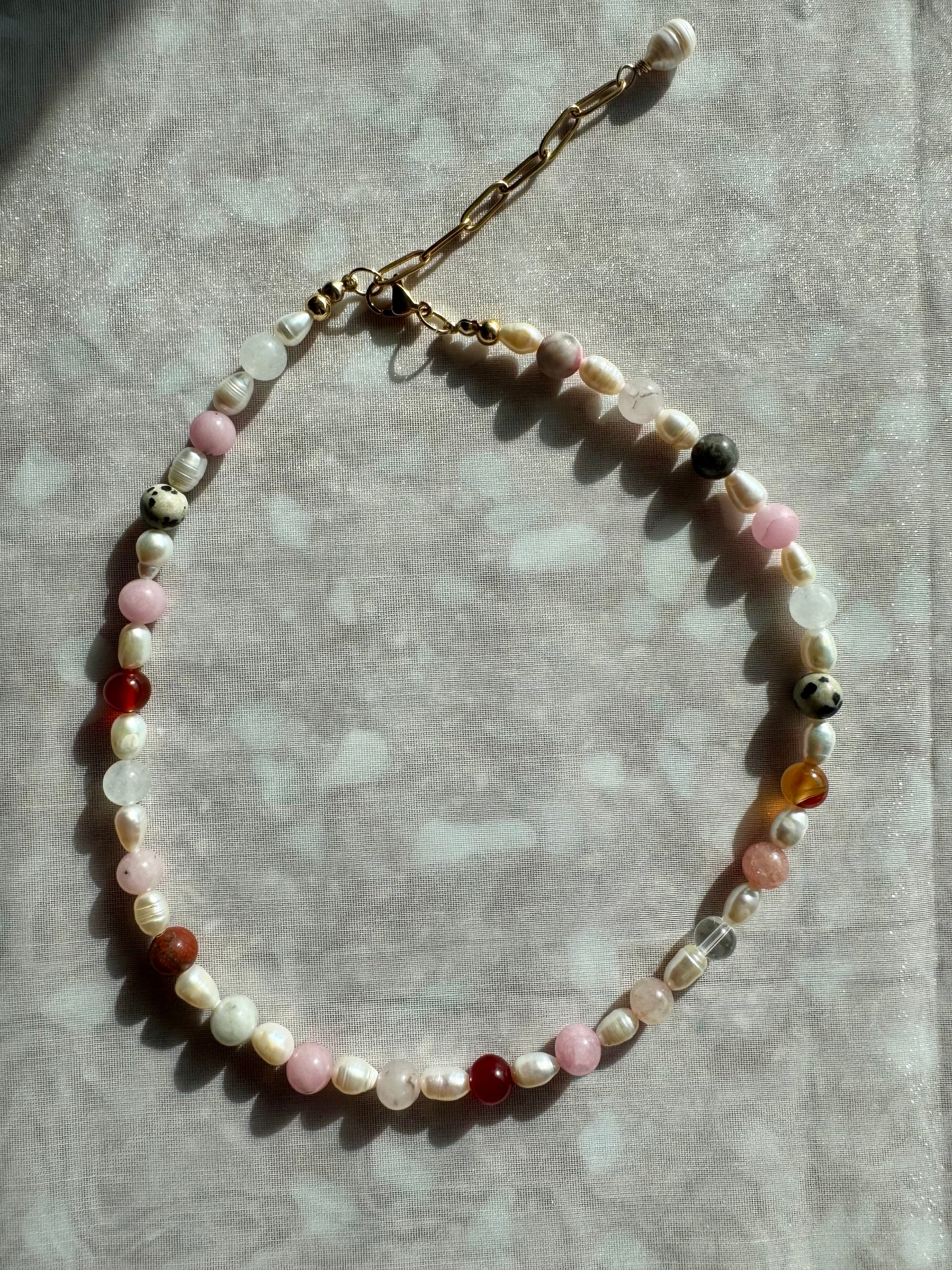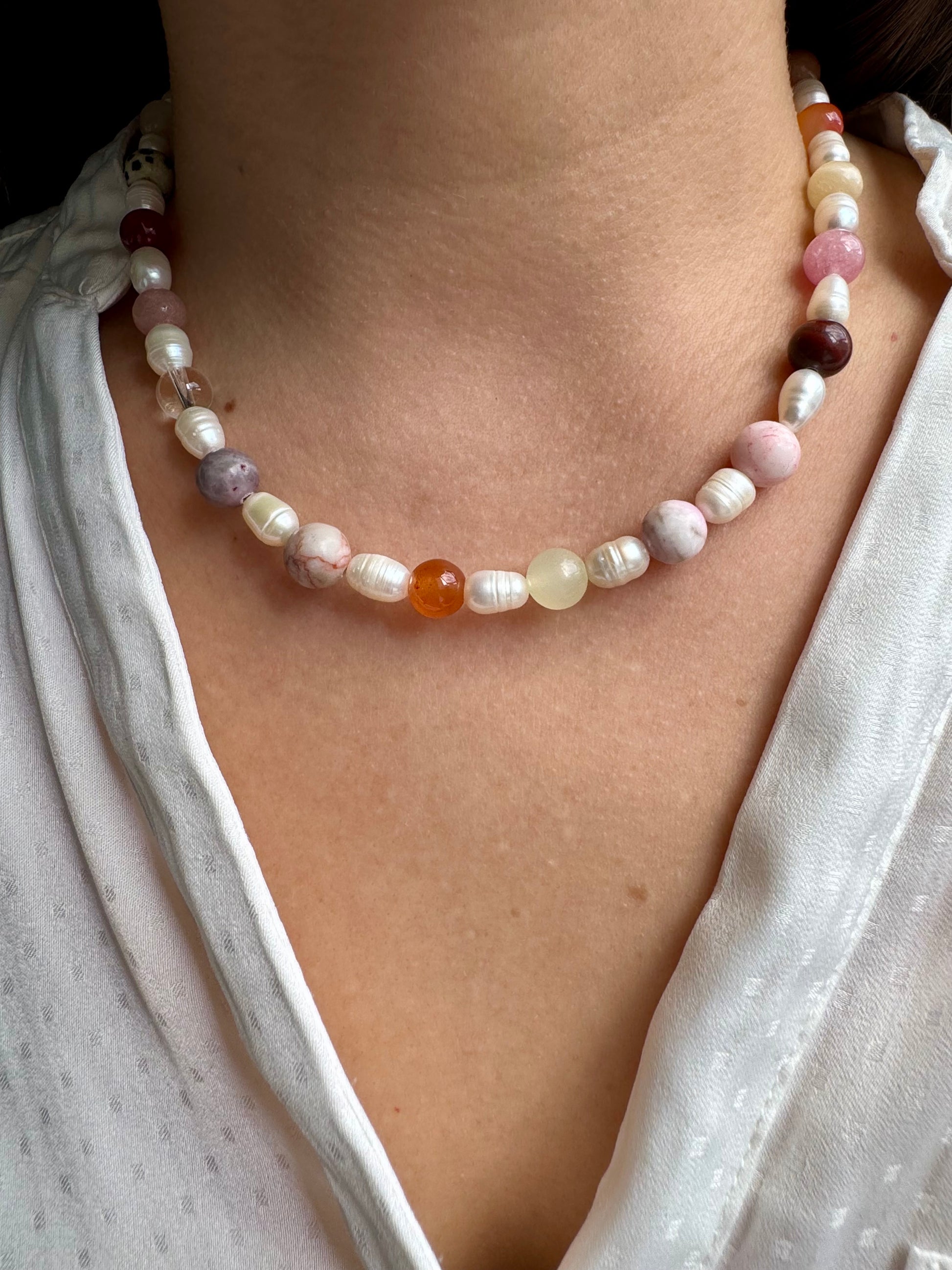 Diese elegante Halskette vereint zarte Süßwasserperlen mit einem harmonischen Mix aus roséfarbenen Edelsteinen, Dalmatinerstein und goldenen Akzenten. Die sanften Töne in Rosa, Weiß und Rot werden durch feine natürliche Muster belebt und machen jedes Stück zu einem kleinen Kunstwerk. Die unregelmäßige Perlenform sorgt für einen modernen Look, der gleichzeitig klassisch bleibt.