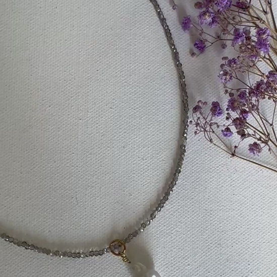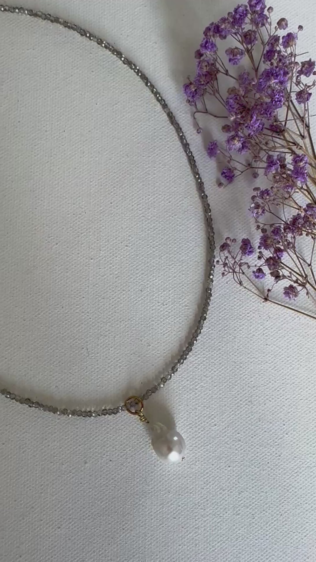 Elegante, facettierte Edelsteinperlen in einem dezenten Grauton treffen auf eine große Barockperle als Anhänger – ein stilvoller Kontrast aus kühler Zurückhaltung und natürlicher Eleganz. Die goldfarbenen Details und die feine Verlängerungskette runden das Design harmonisch ab.