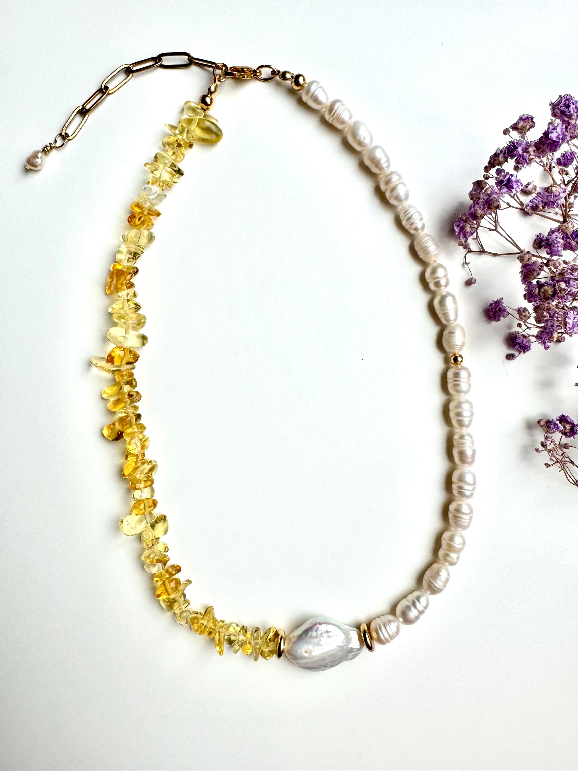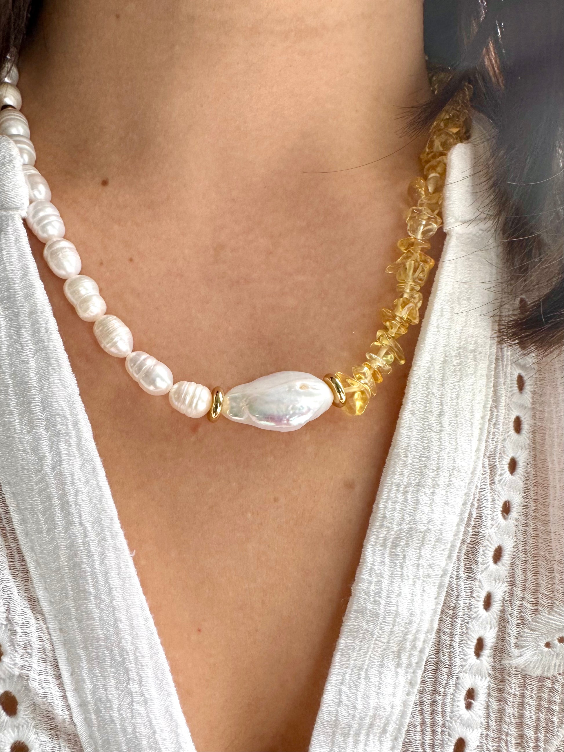 Diese harmonische Halskette kombiniert warme Citrin-Edelsteinsplitter mit edlen, ovalen Süßwasserperlen. Highlight des Designs ist eine große, unregelmäßige Barockperle, die für einen natürlichen und zugleich eleganten Look sorgt. Die sonnigen Gelbtöne des Citrins und das perlmuttige Schimmern der Perlen verschmelzen zu einer sanften, sommerlichen Komposition.