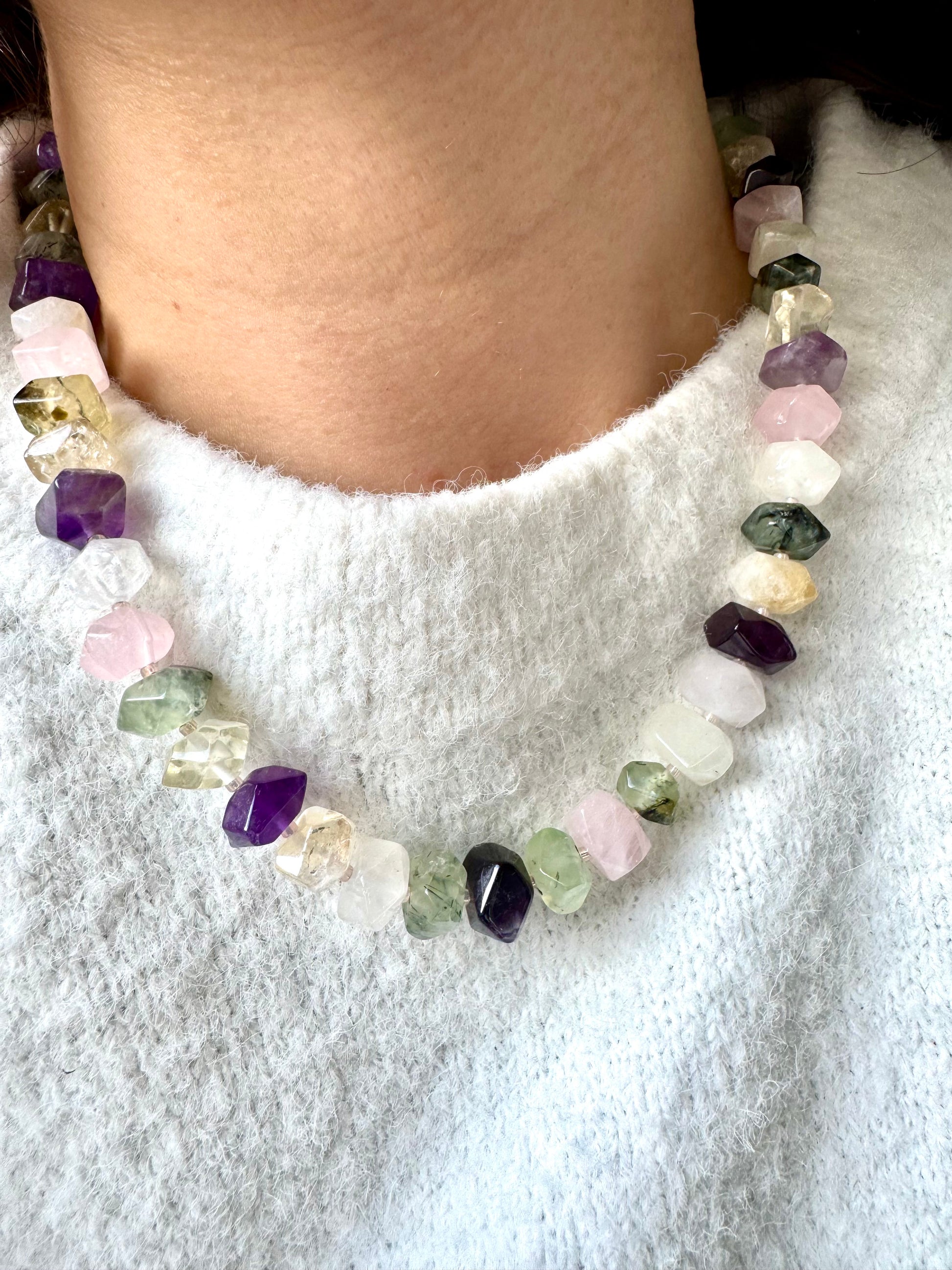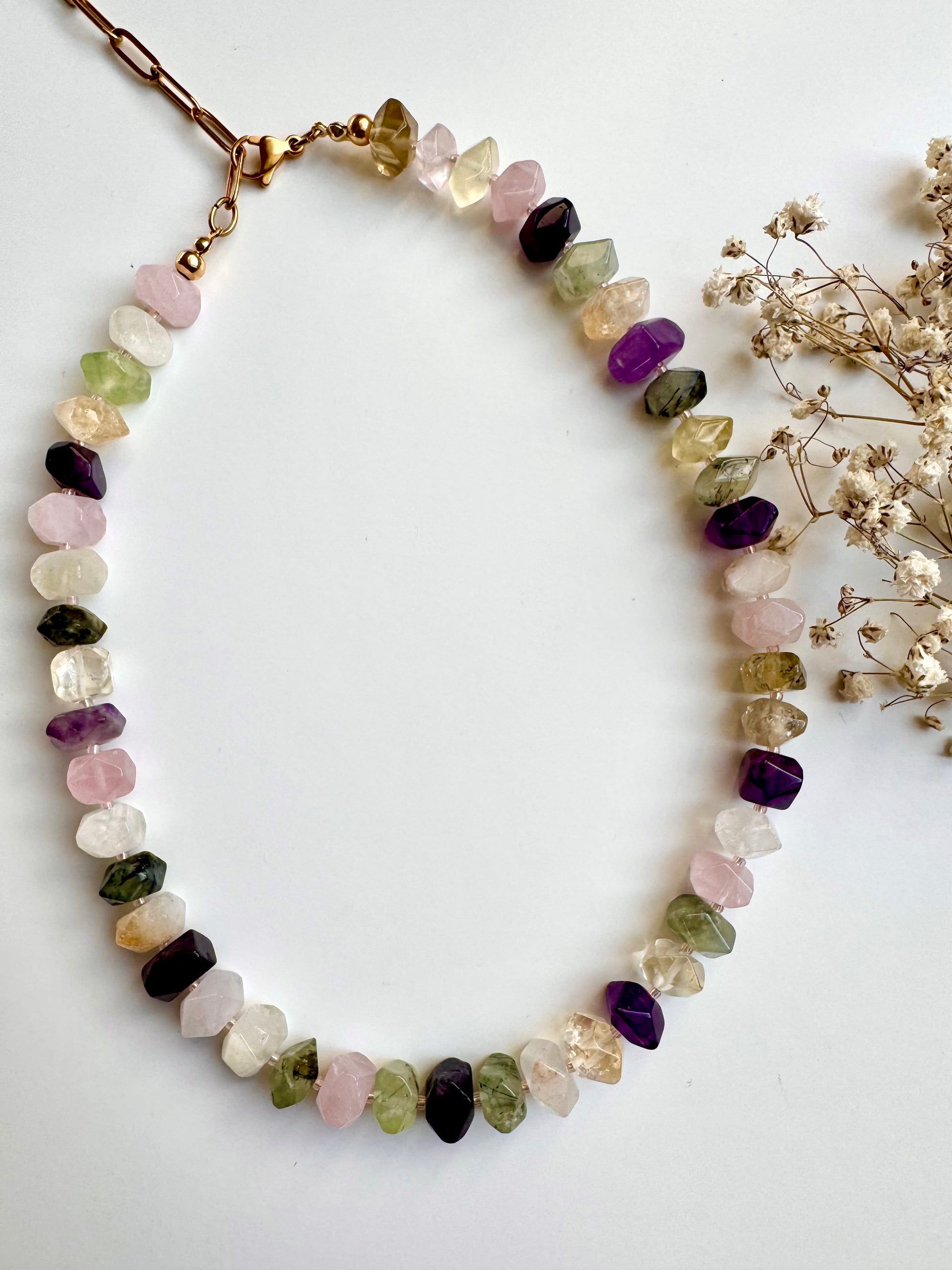 Diese farbenfrohe Edelsteinkette vereint eine harmonische Auswahl an facettierten Edelsteinen in zarten Naturtönen – darunter Amethyst, Rosenquarz, grüner Aventurin und Bergkristall. Die Vielfalt der Steine und Formen macht jedes Stück zu einem Unikat. Perfekt geeignet für alle, die natürliche Eleganz und Farbe lieben.