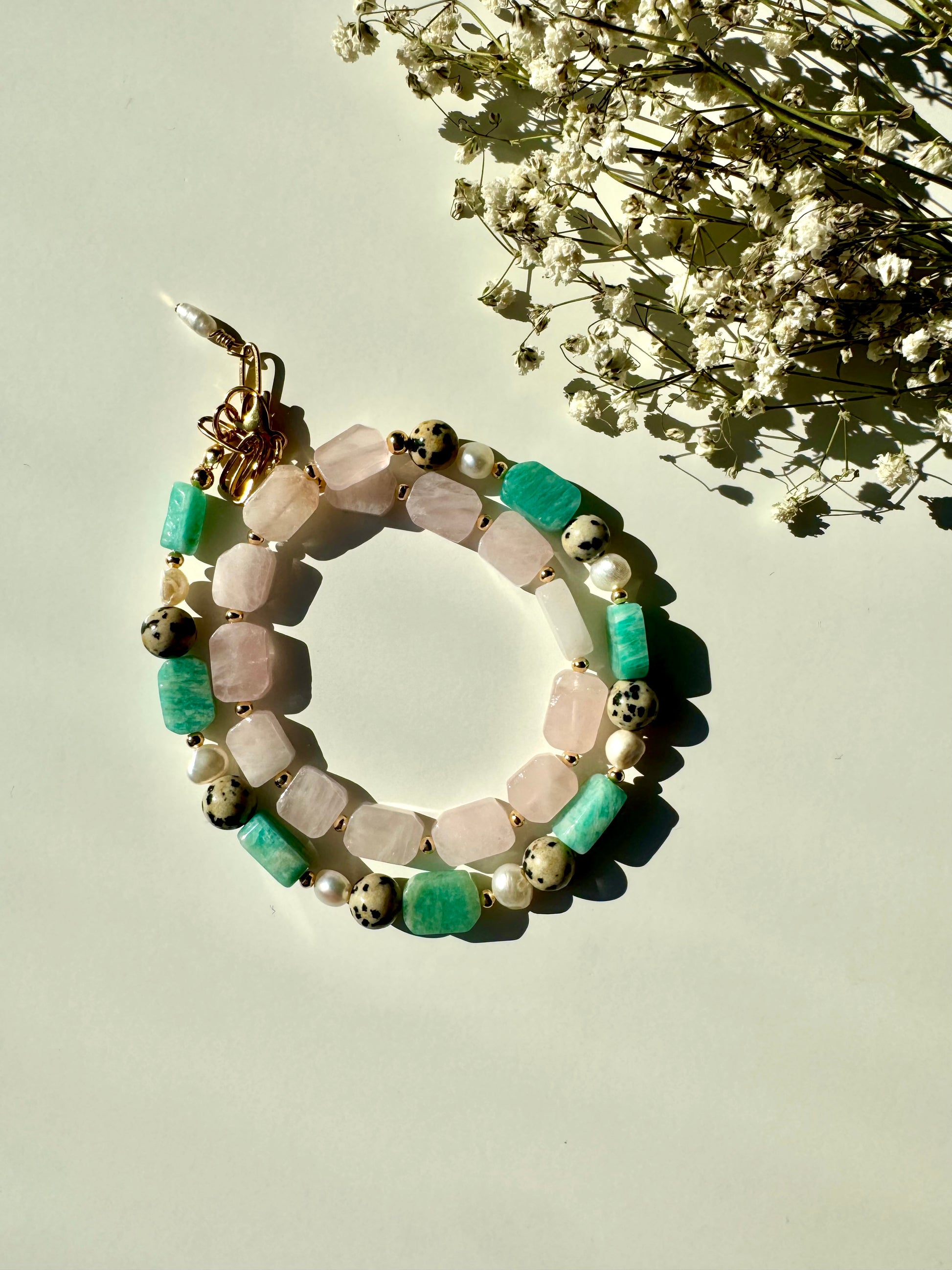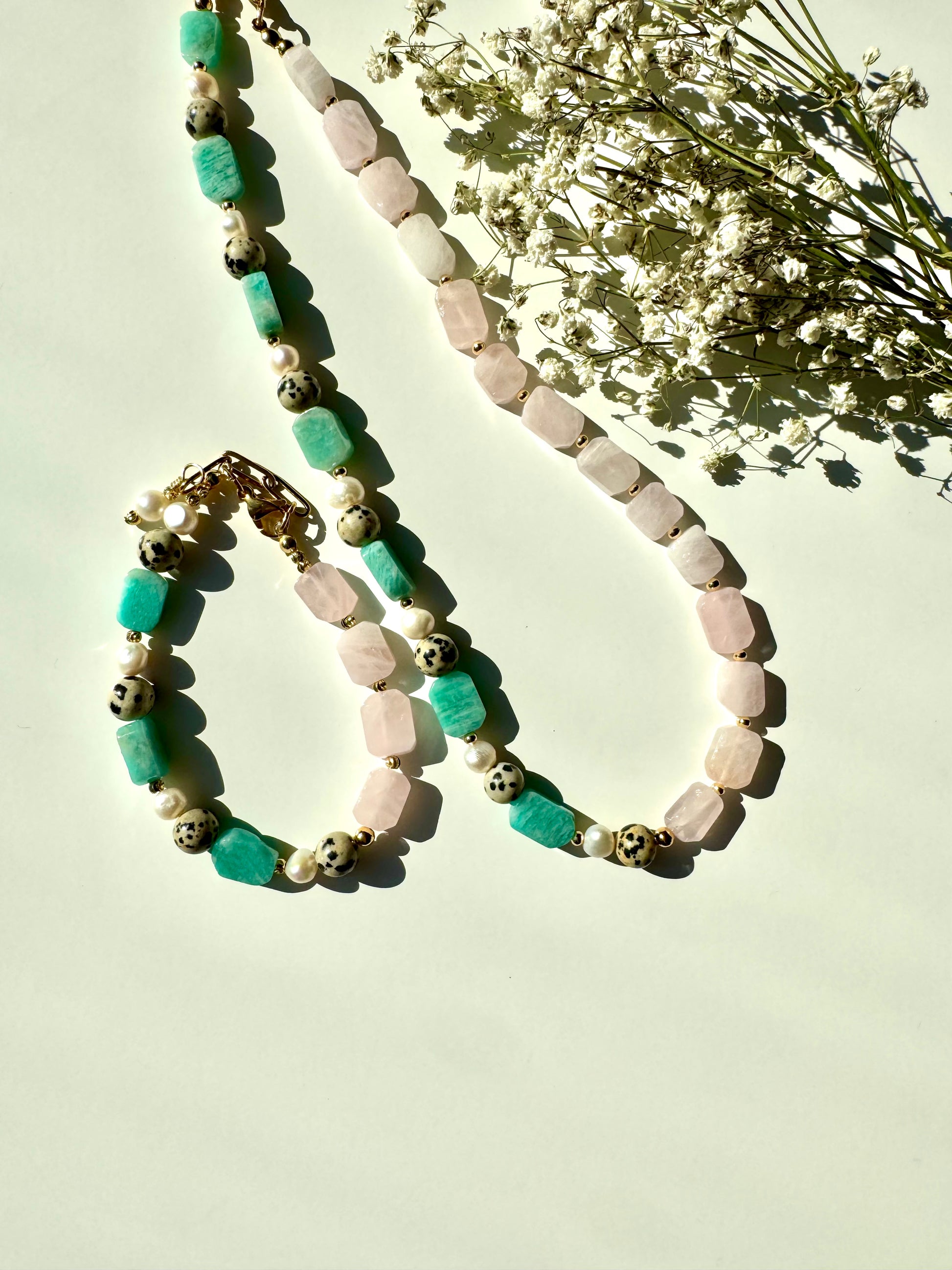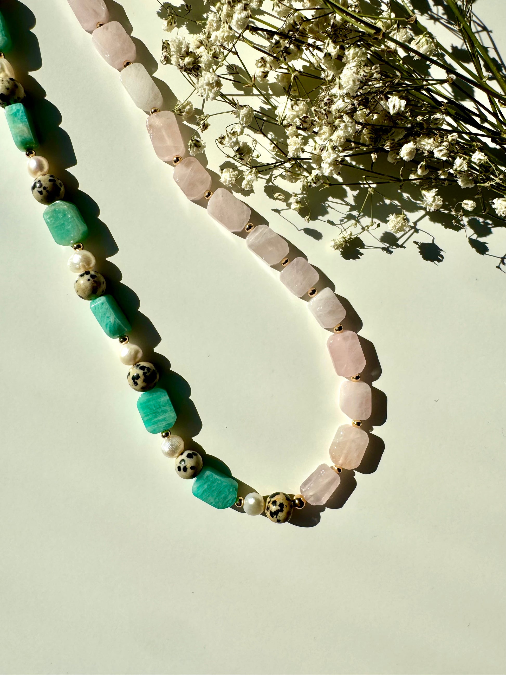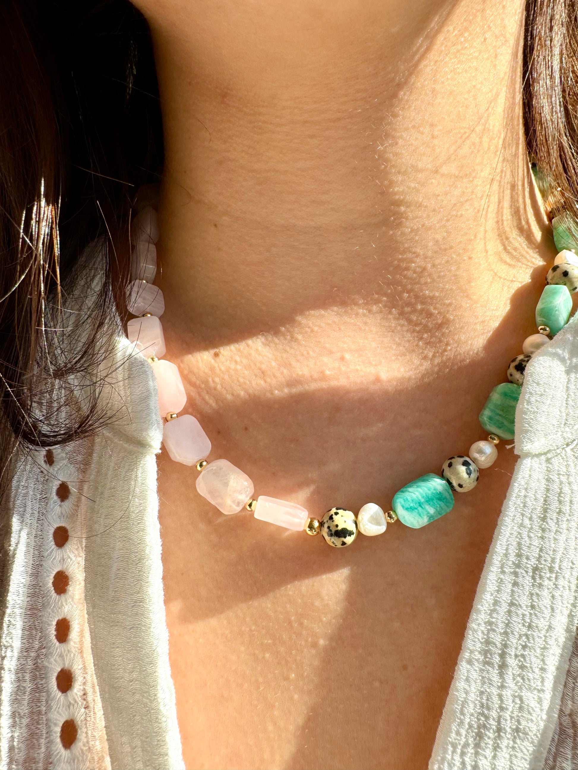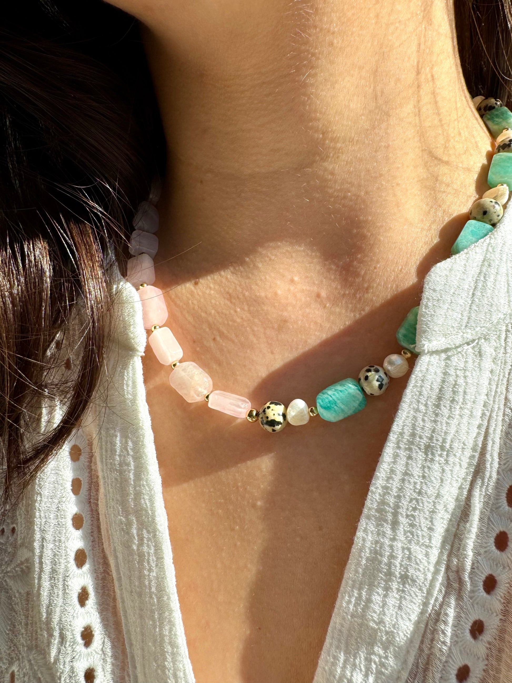Eine harmonische Komposition aus sanftem Rosenquarz, mintfarbenem Amazonit, markantem Dalmatinerstein und schimmernden Süßwasserperlen. Die Halskette verbindet warme und kühle Naturtöne zu einem modernen und gleichzeitig eleganten Schmuckstück. Perfekt, um jedes Outfit – ob casual oder chic – stilvoll zu ergänzen.