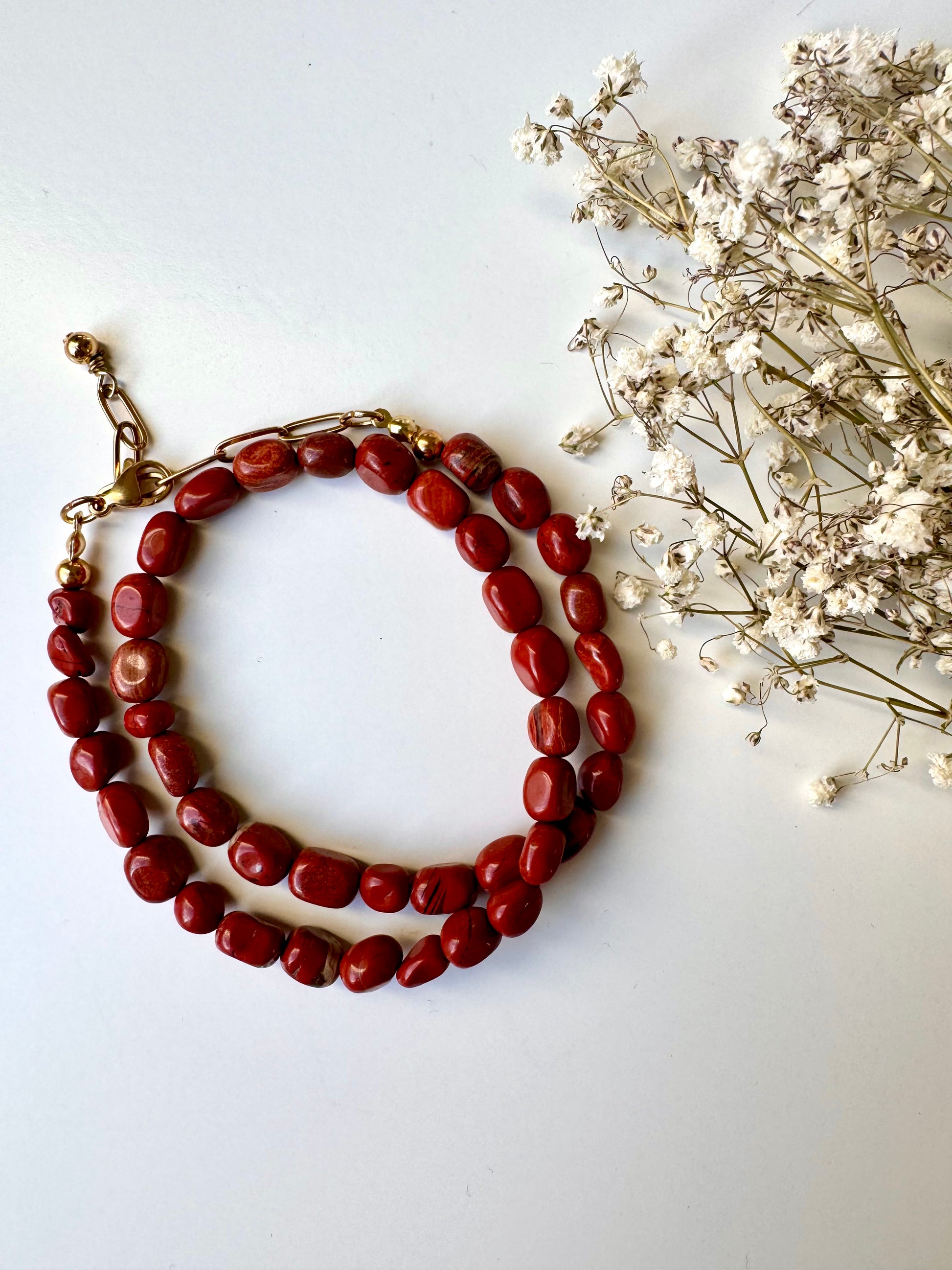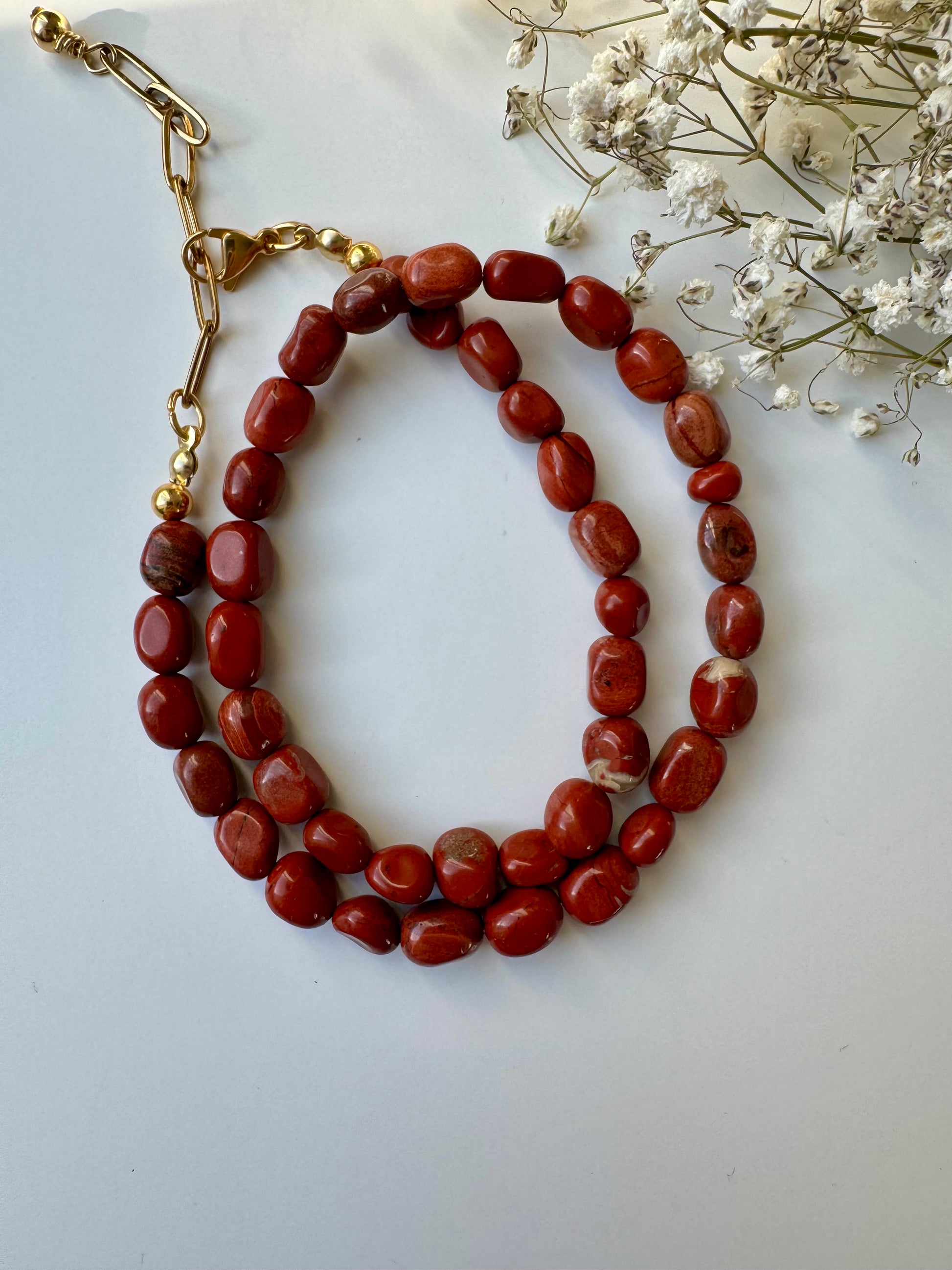 Halskette mit roten Jaspis-Steinen & vergoldeten Details – handgefertigt
