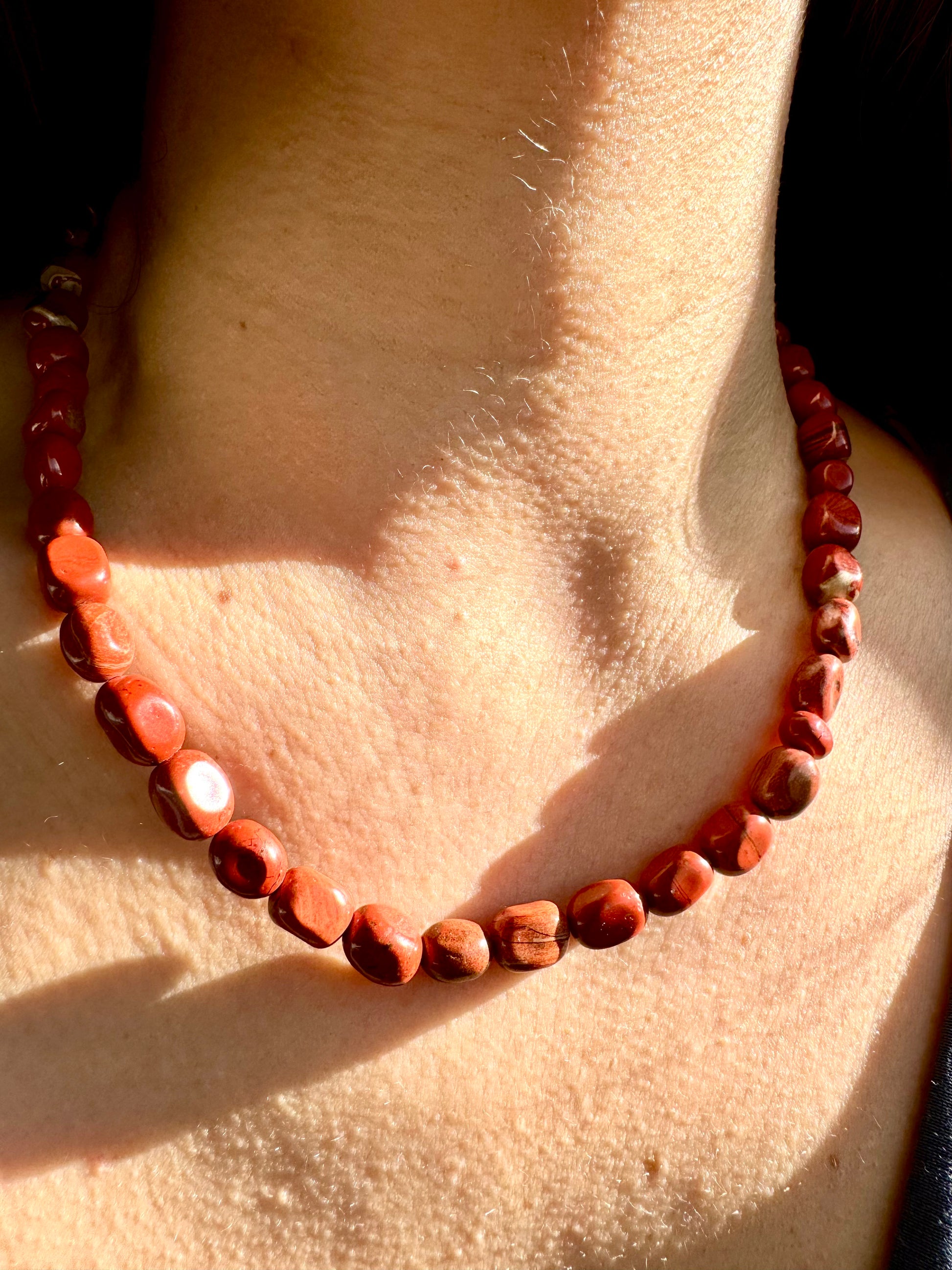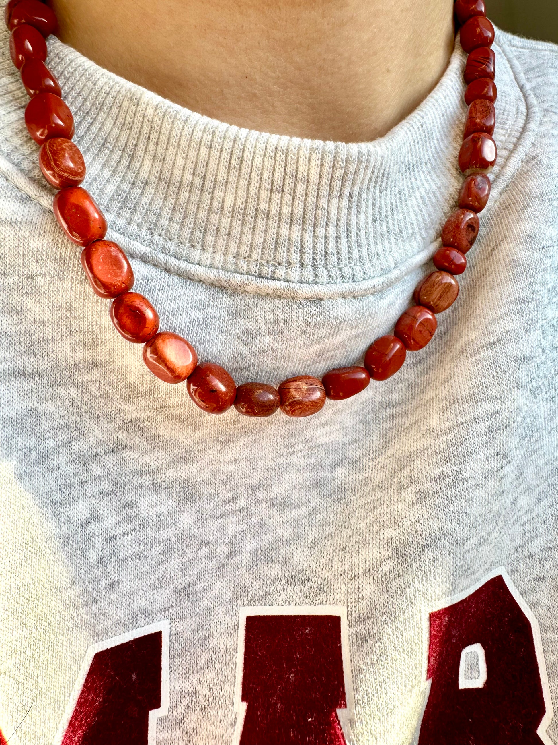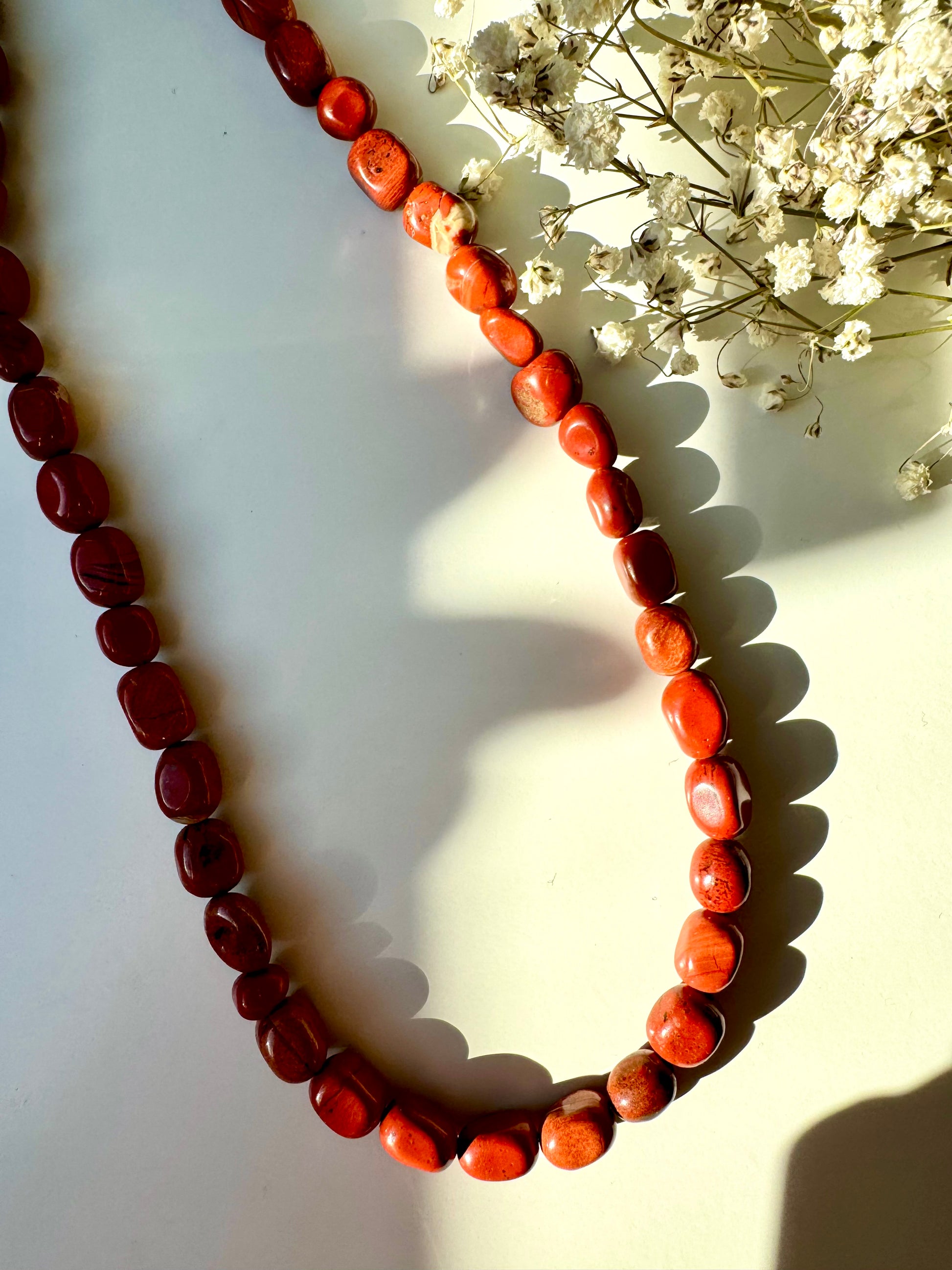 Diese Halskette strahlt Stärke und Eleganz aus. Die intensiv roten Jaspis-Steine verleihen ihr eine erdige, natürliche Tiefe, während die vergoldeten Elemente einen edlen Kontrast setzen. Ein besonderes Schmuckstück für alle, die warme Farbtöne und natürliche Materialien lieben – klassisch, charaktervoll und zeitlos schön.