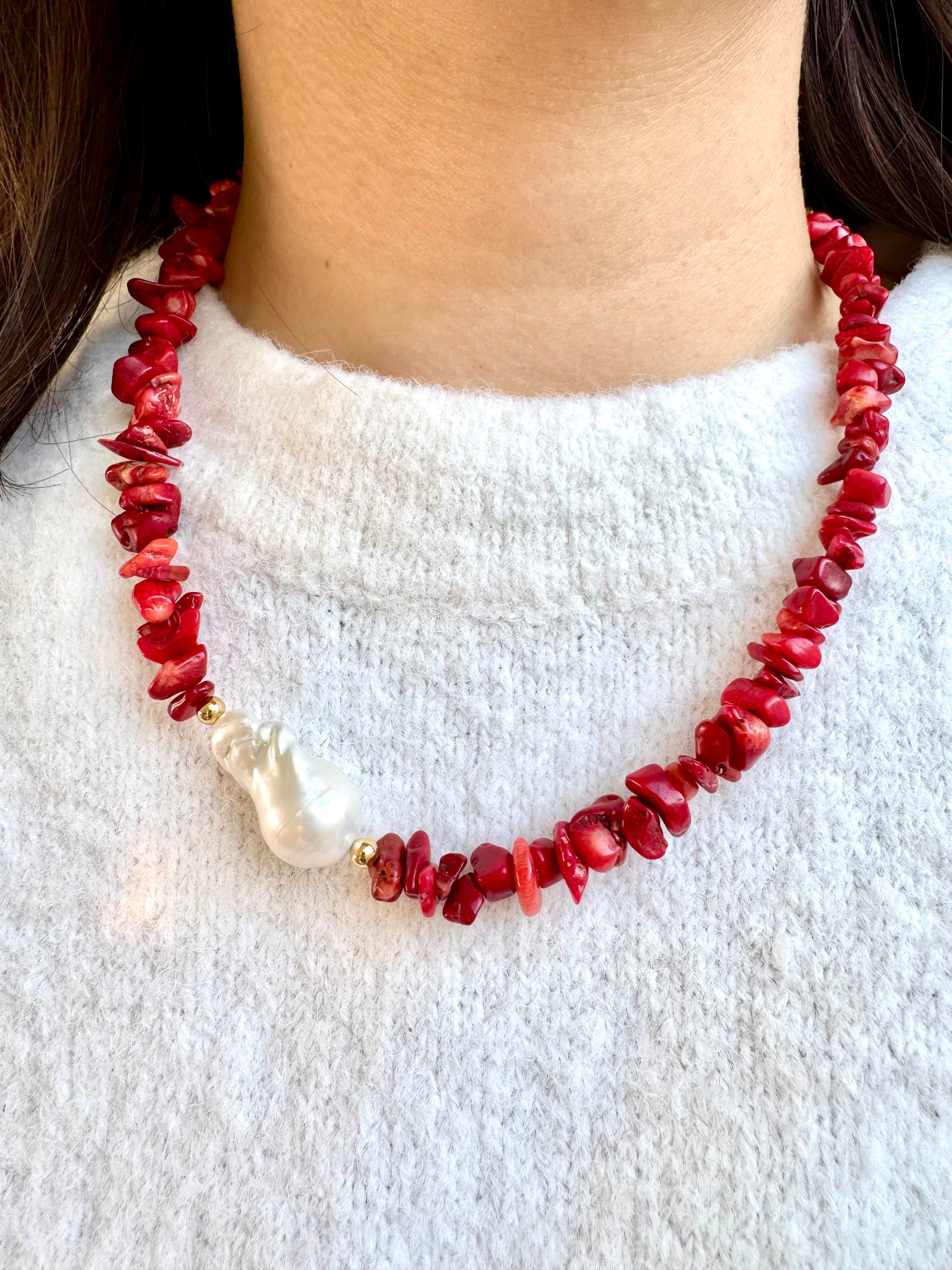 Diese markante Halskette vereint leuchtend rote Korallenstücke mit einer großen, weißen Barockperle als zentrales Highlight. Das intensive Farbspiel in Kombination mit der natürlichen Form der Perle verleiht dem Schmuckstück eine edle, zugleich kraftvolle Ausstrahlung – ideal für stilvolle Akzente im Alltag oder besondere Anlässe.