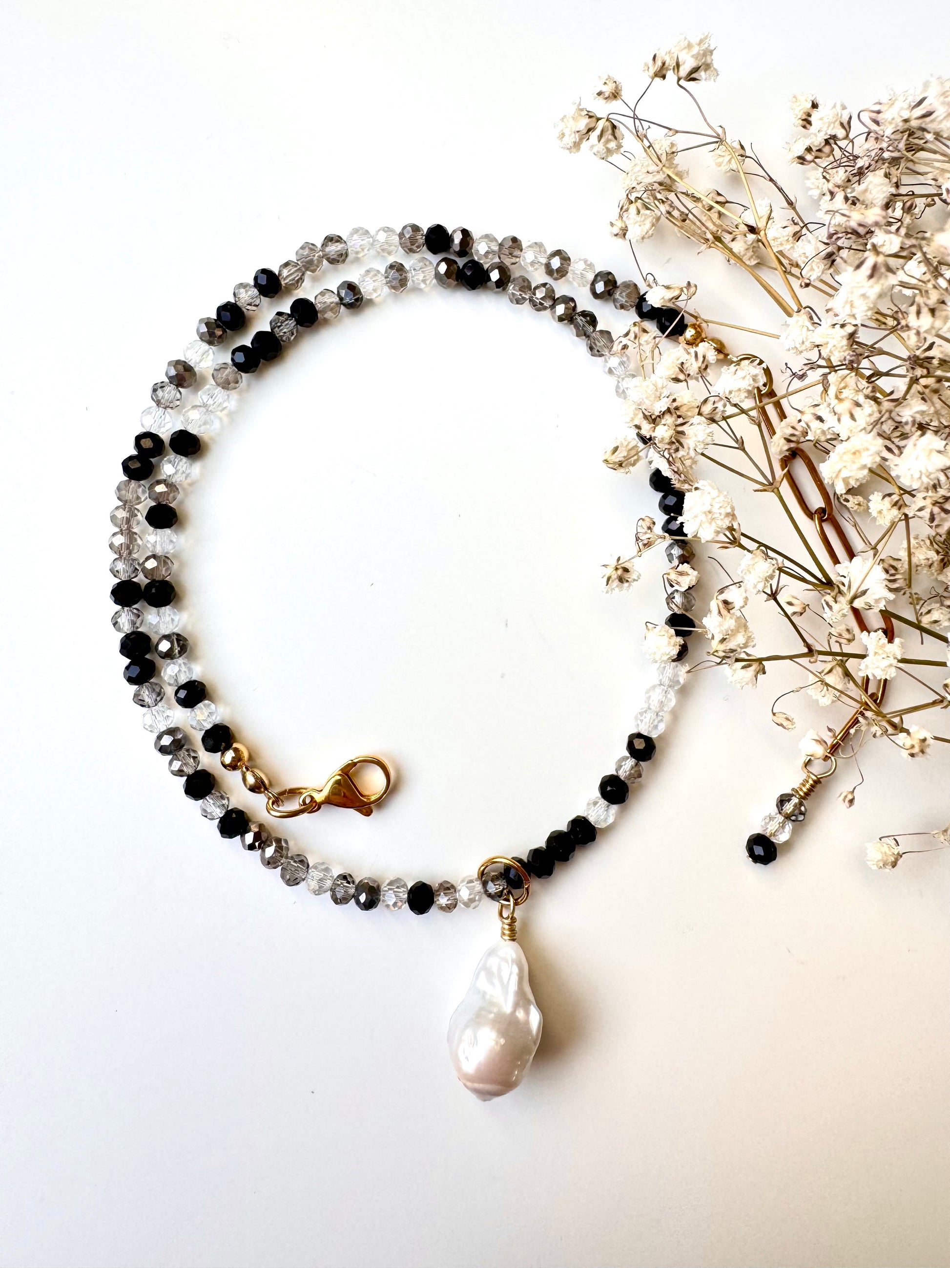 Diese edle Halskette kombiniert facettierte Edelsteinperlen in Schwarz und Transparent mit einer großen weißen Barockperle als Anhänger. Der monochrome Look wirkt elegant und modern – perfekt für schlichte, aber ausdrucksstarke Outfits.