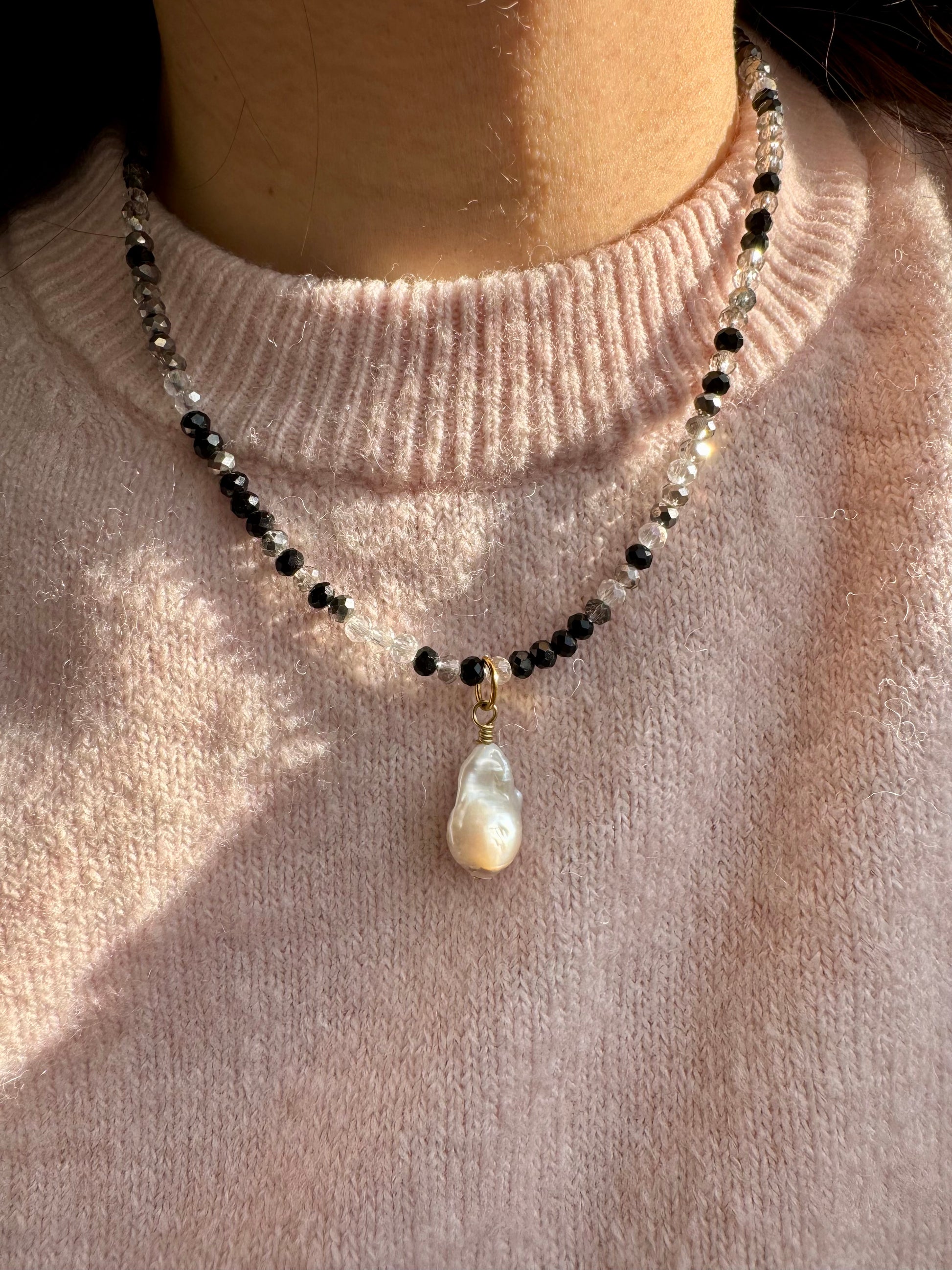 Halskette mit schwarzen & transparenten Edelsteinperlen und Barockperle