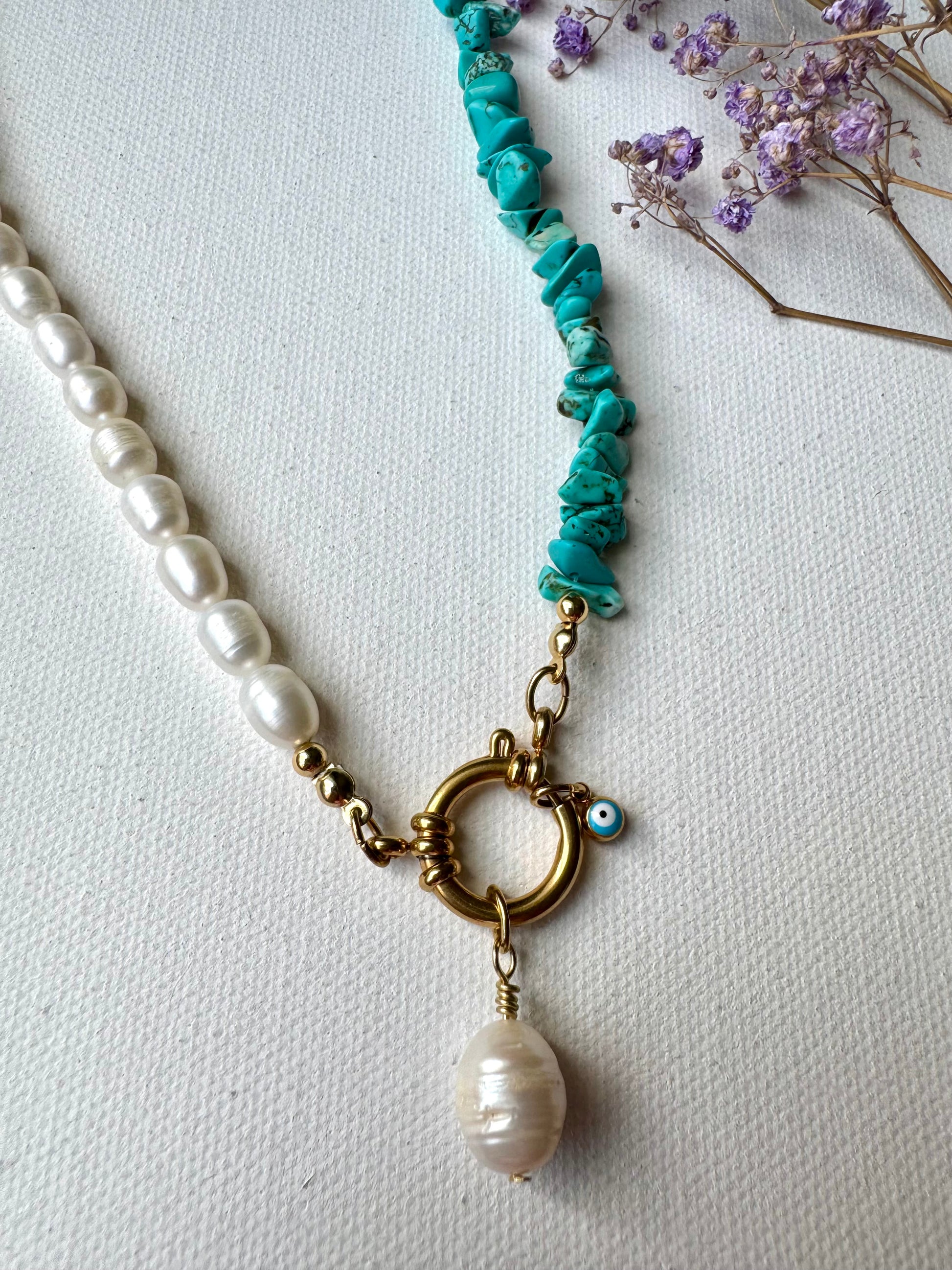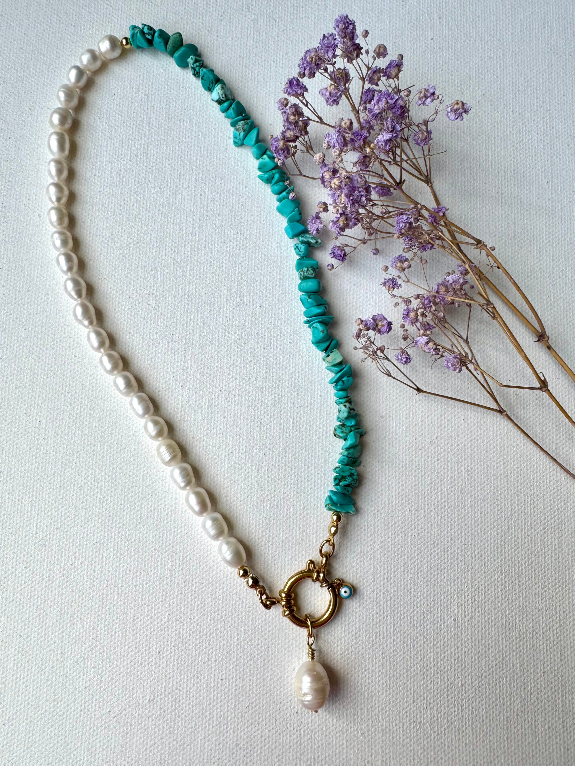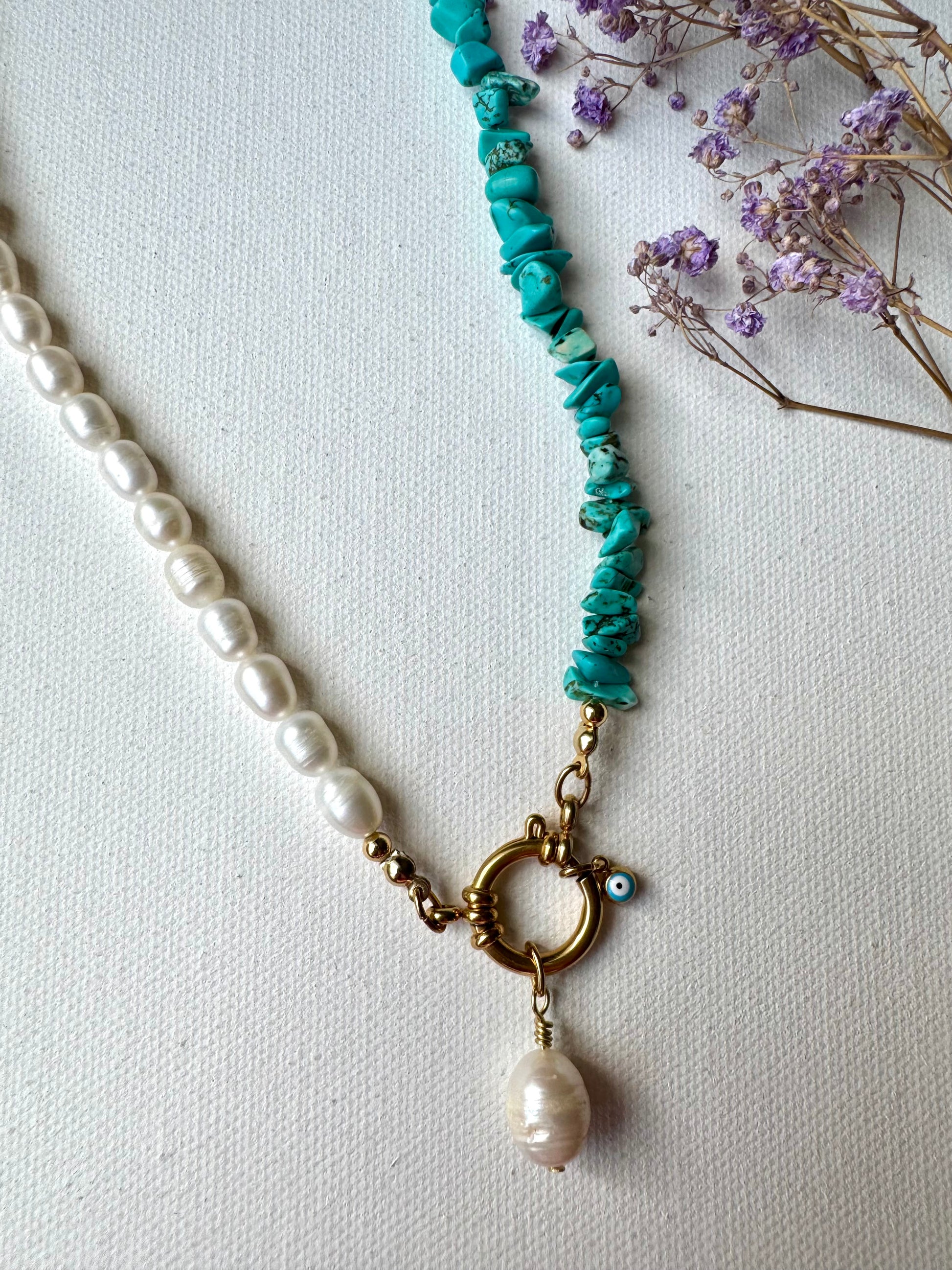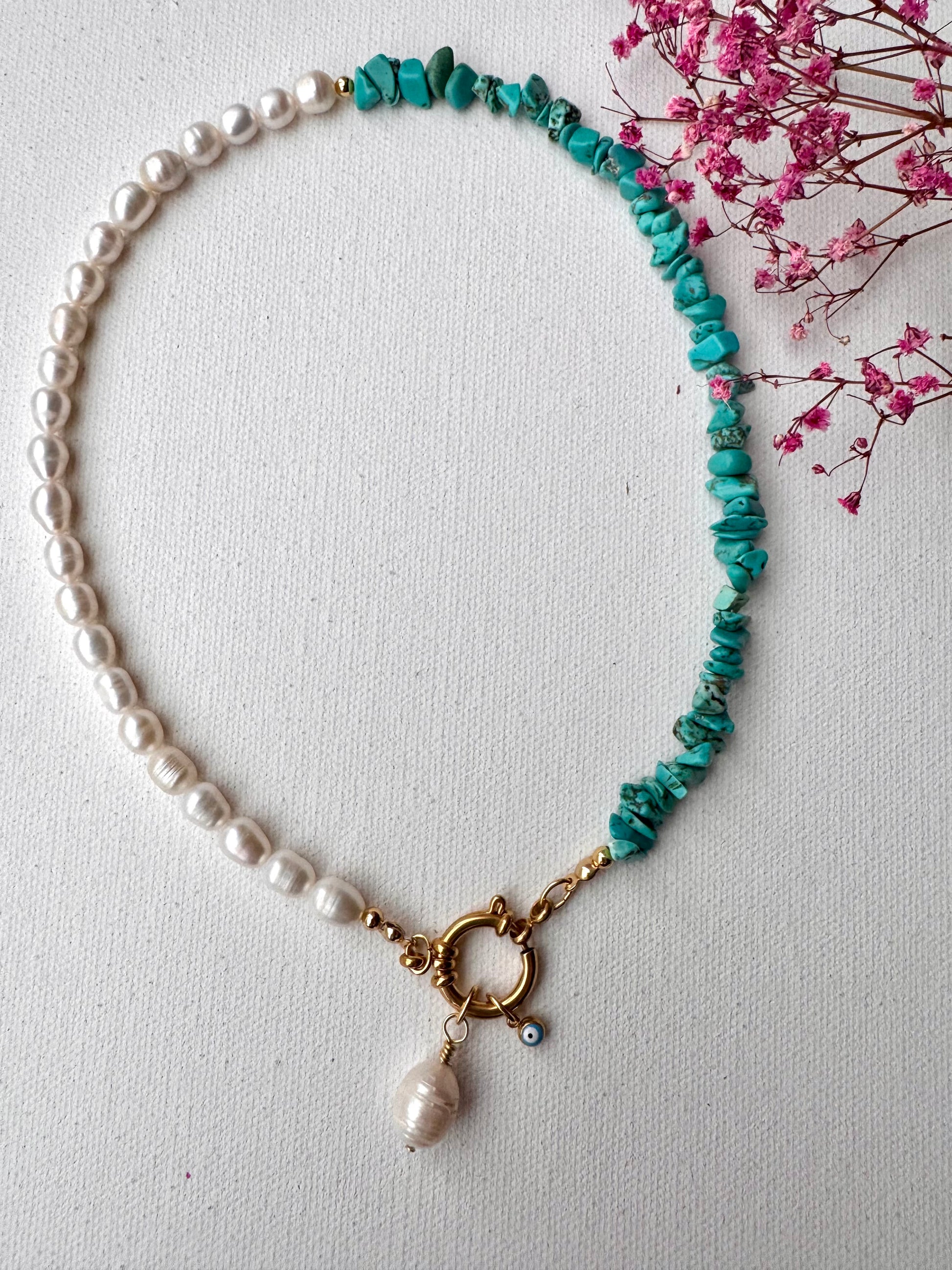Süßwasserperlen-Kette mit Türkis-Splittern & Barock & Nazar-Anhänger