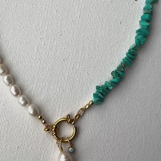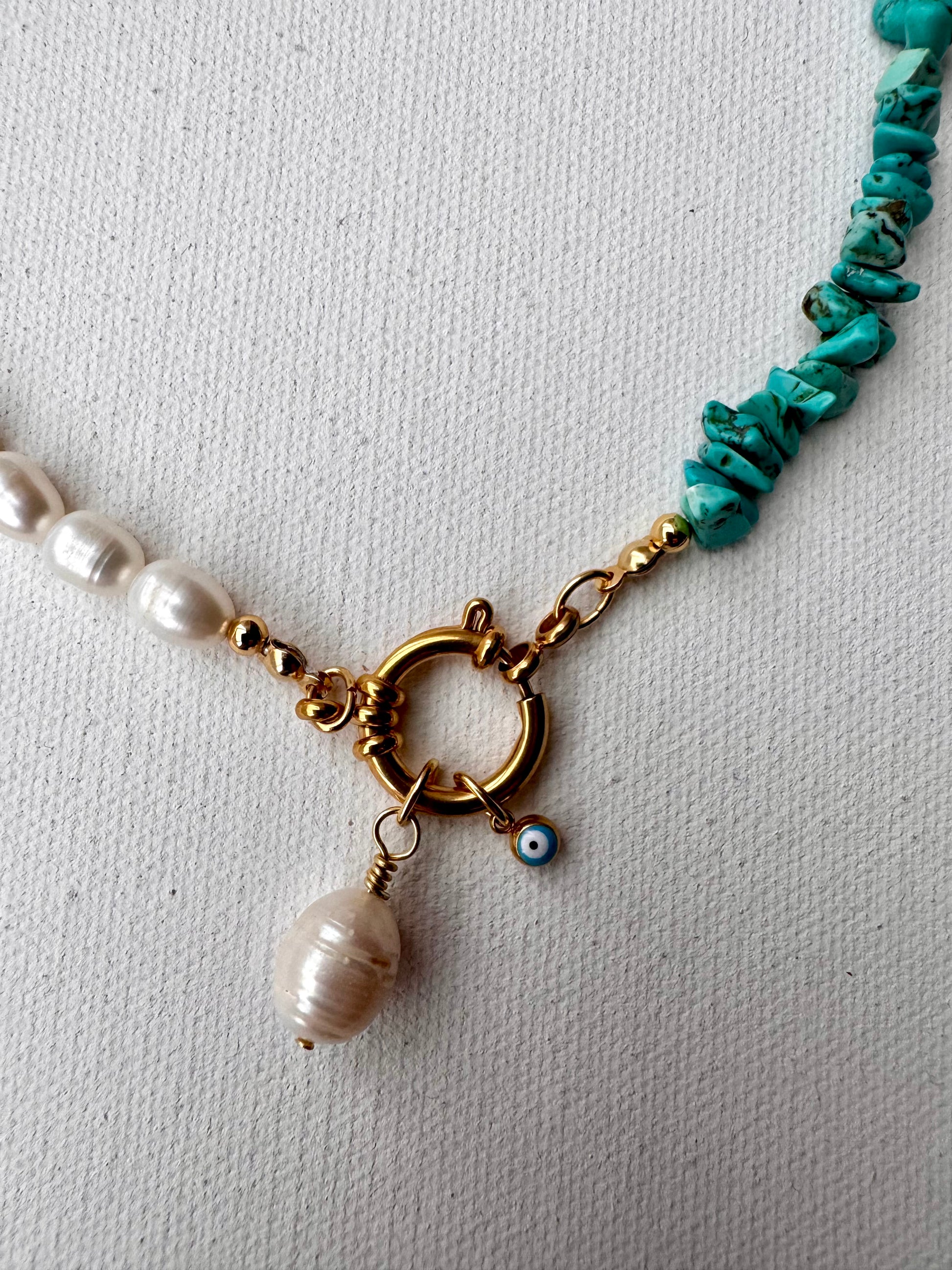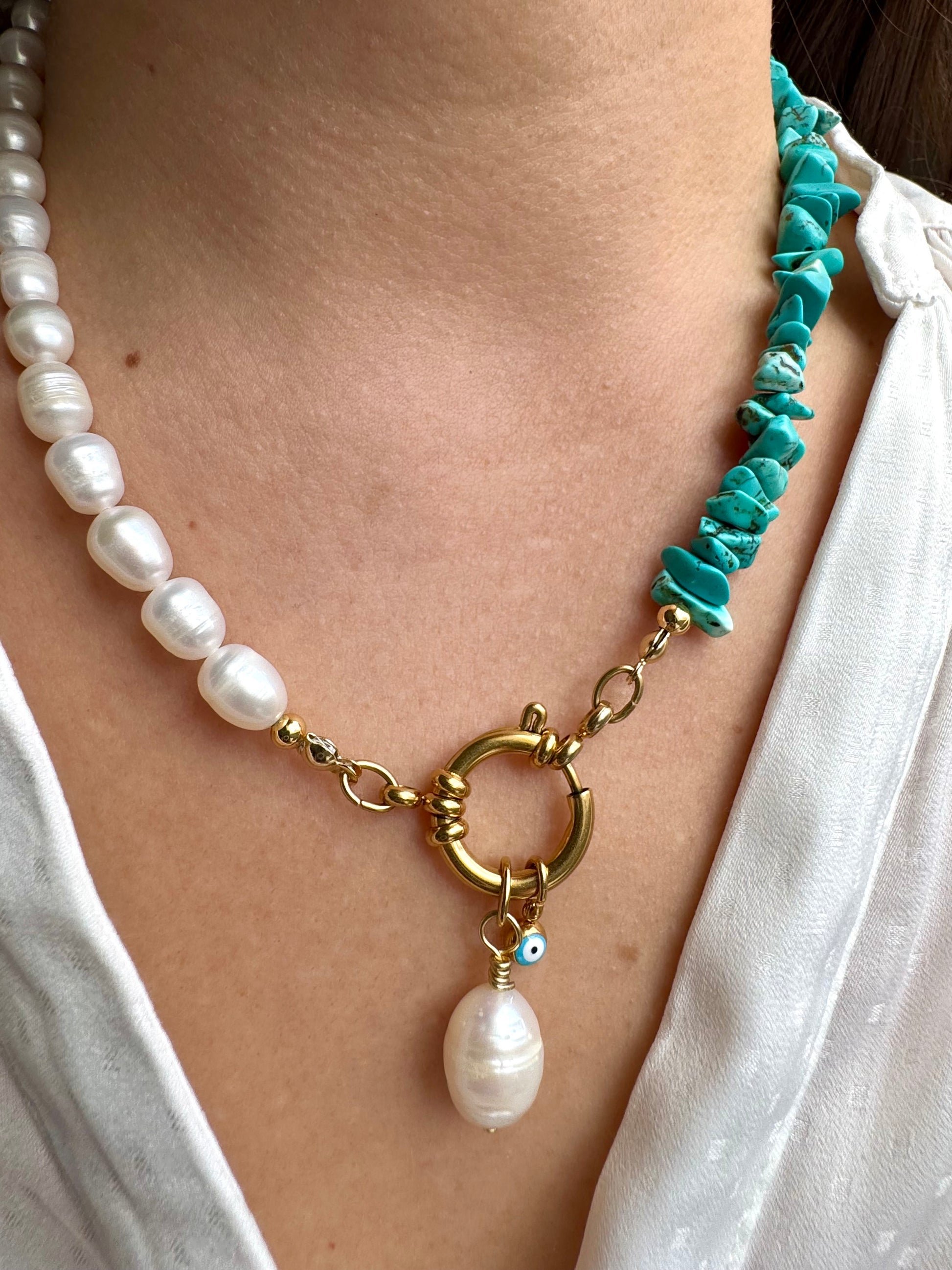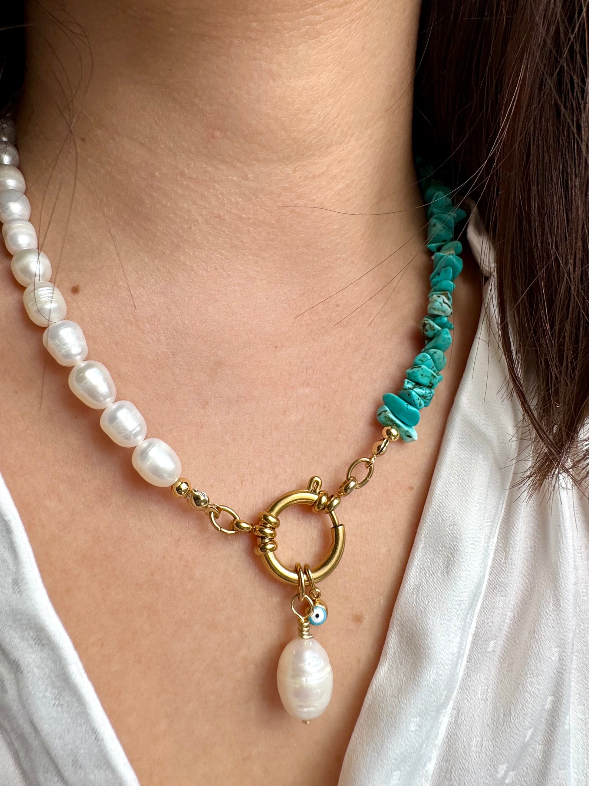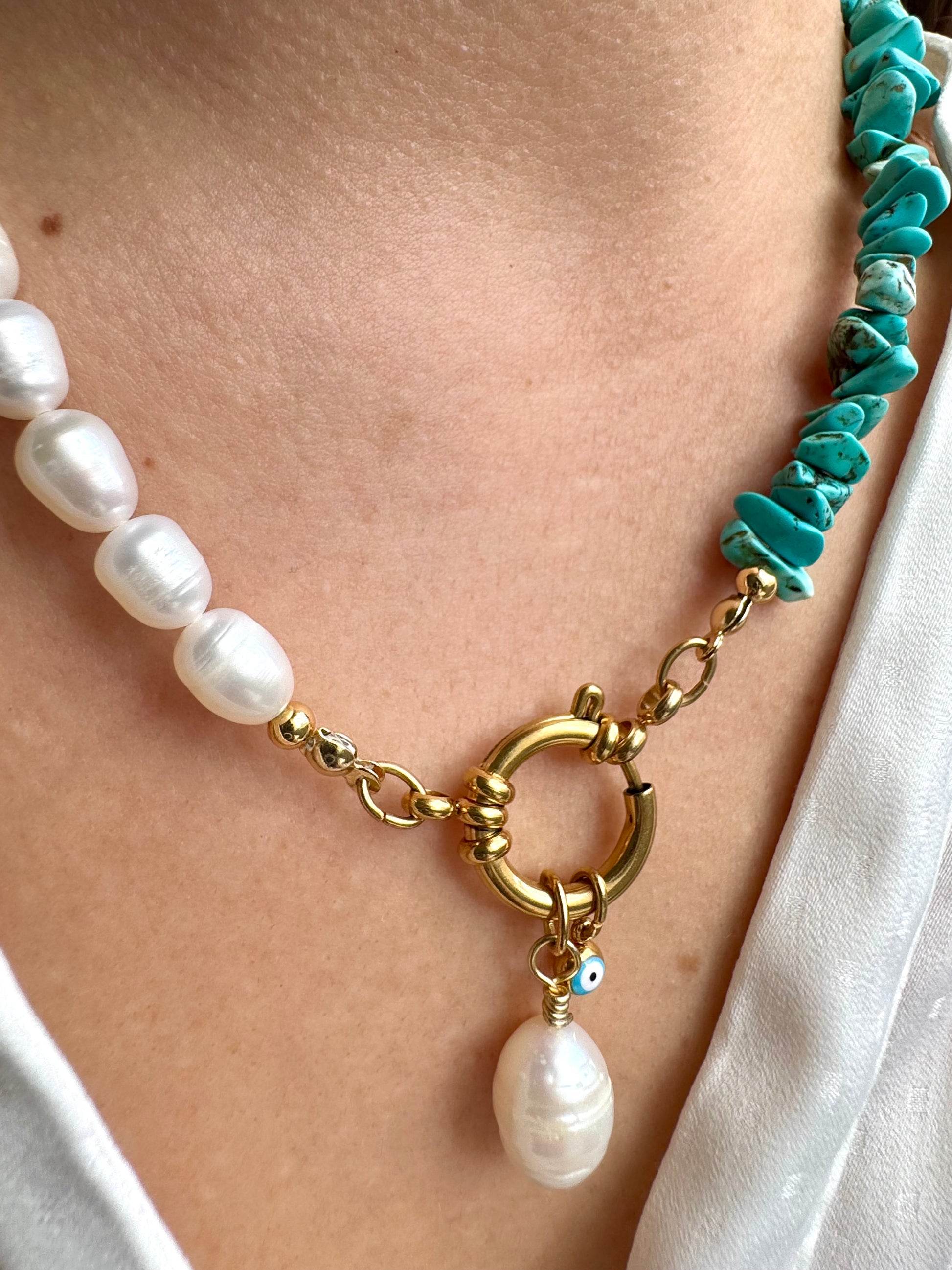 Süßwasserperlen-Kette mit Türkis-Splittern & Barock & Nazar-Anhänger