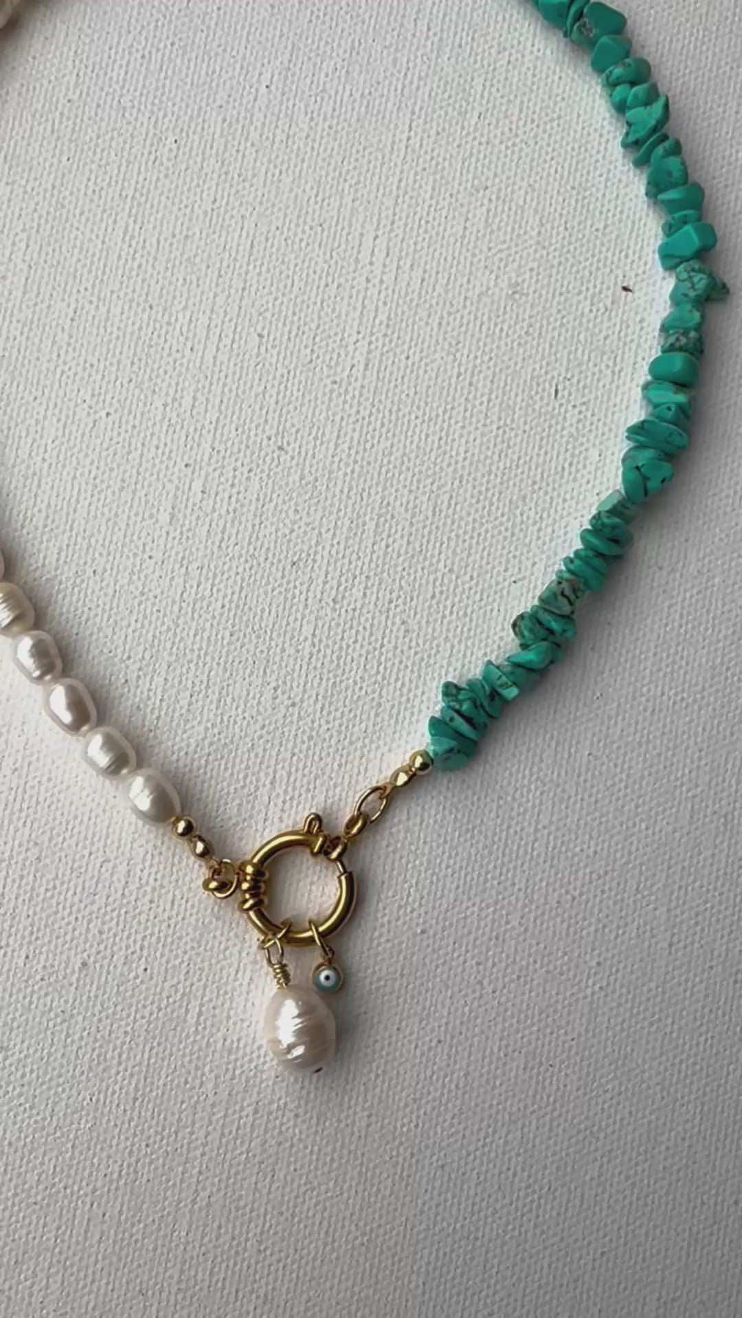 Diese besondere Halskette vereint edle Süßwasserperlen mit lebendigen Türkis-Splittern zu einem einzigartigen Design. Der goldene Ringverschluss mit Nazar-Anhänger und Barockperle sorgt für einen modernen Akzent mit symbolischer Bedeutung. Ein ausdrucksstarkes Schmuckstück – perfekt für Layering oder solo getragen.