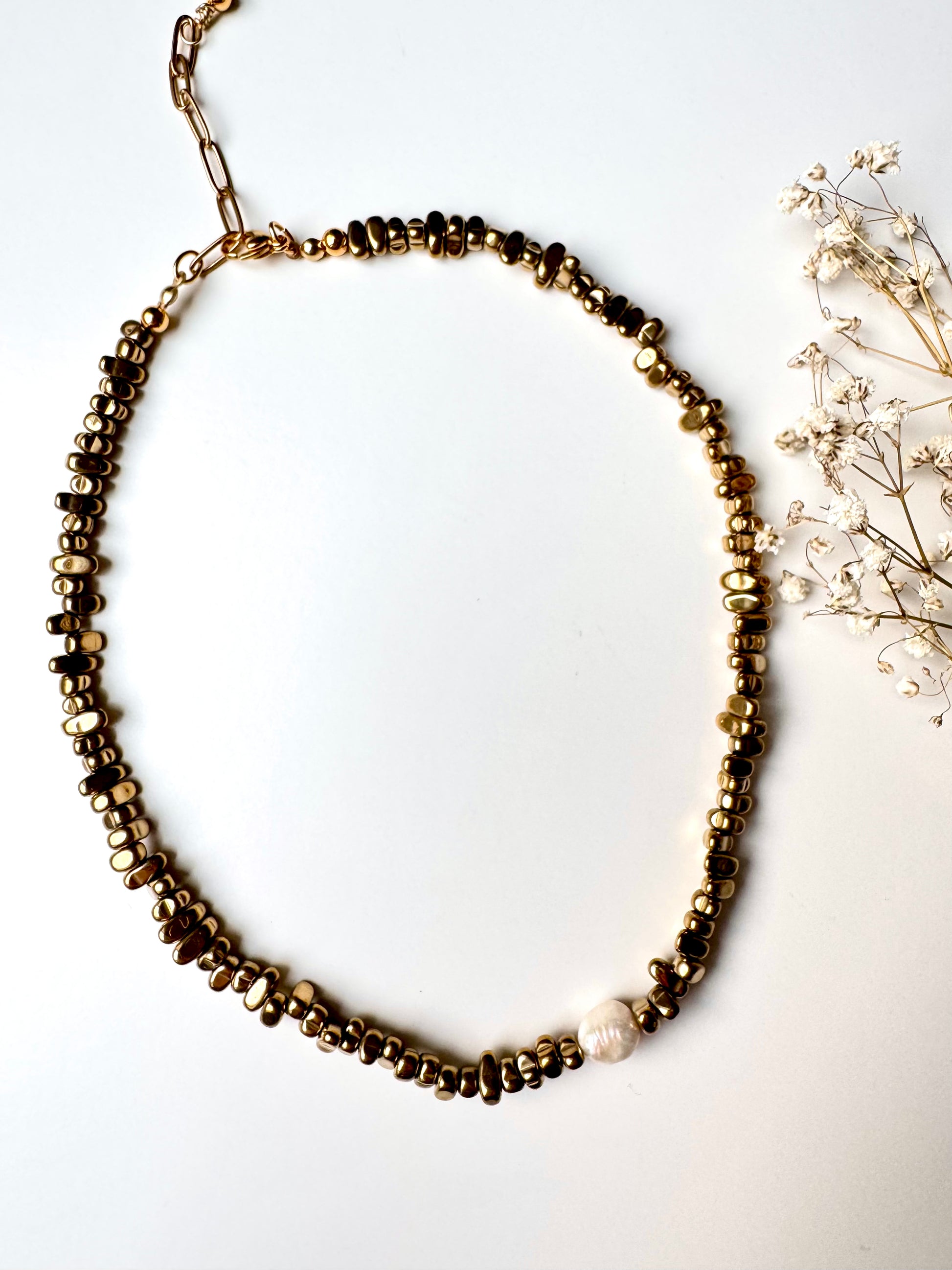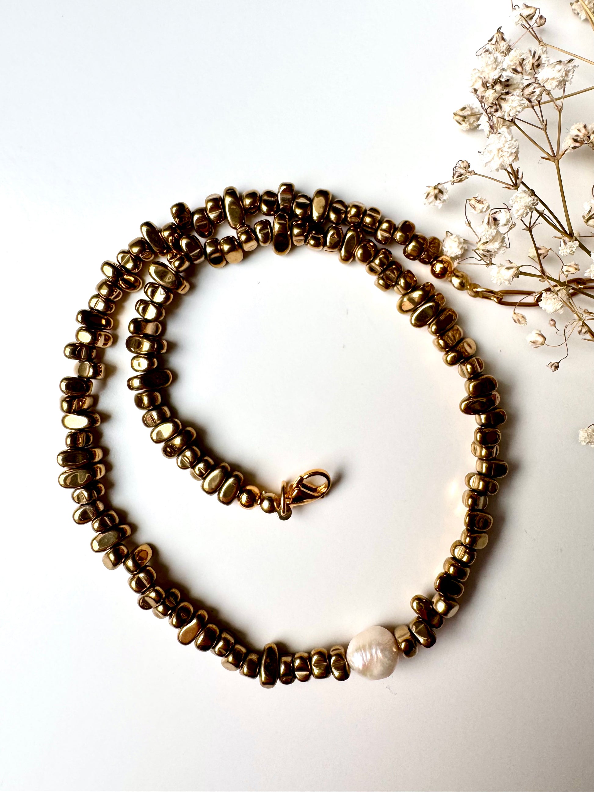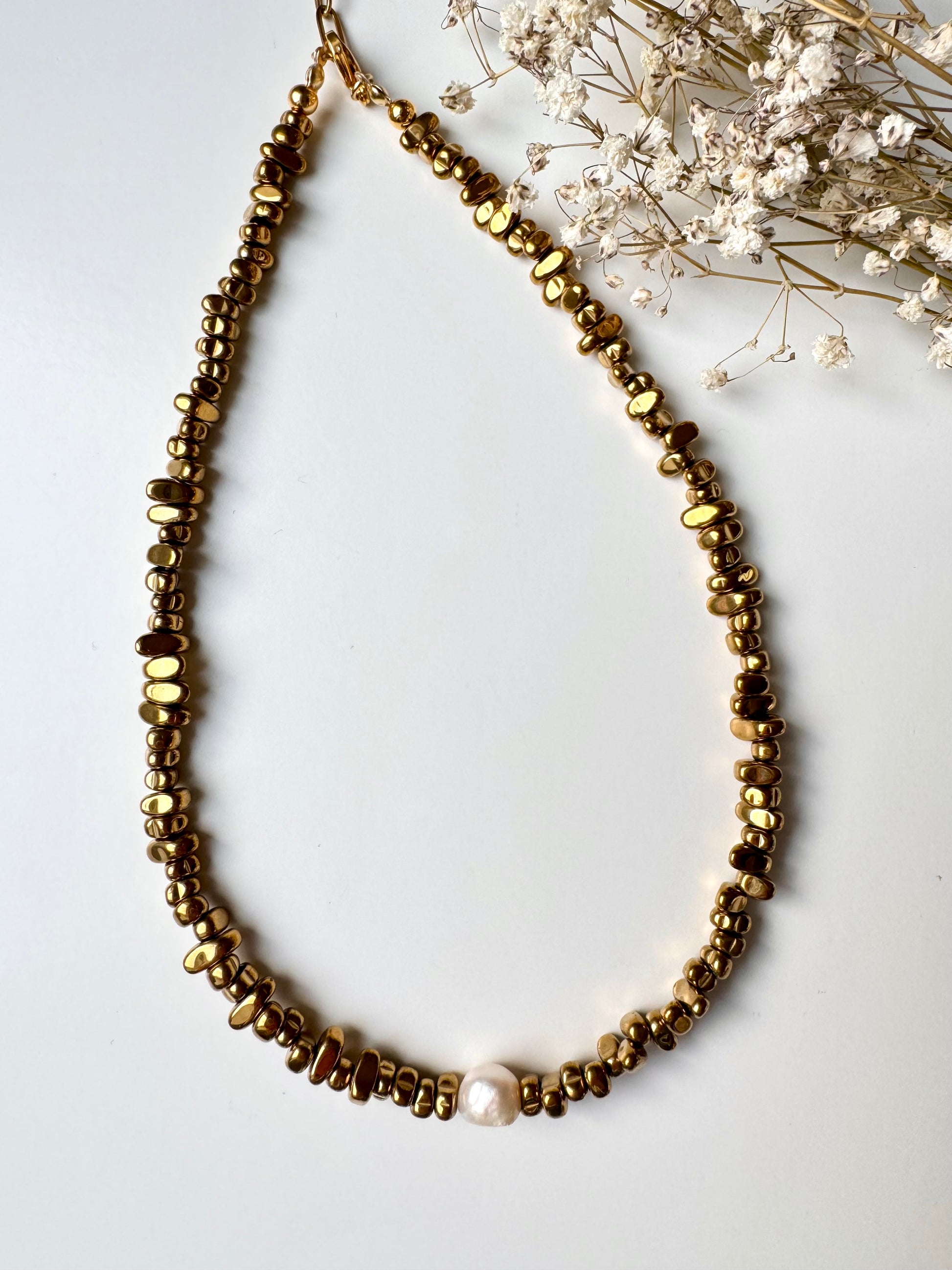 Hematite Glow – Halskette aus goldglänzendem Hämatit mit Süßwasserperle – handgefertigt