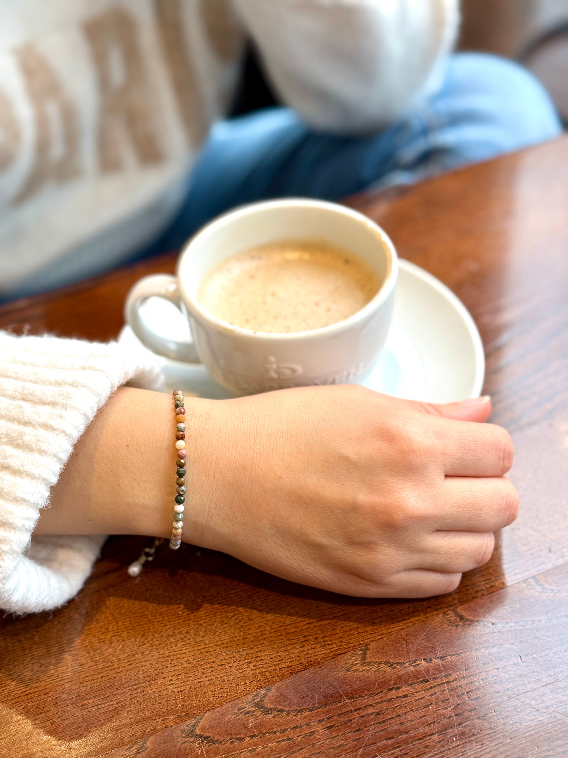 Ein feines Armband aus echten Jaspis-Steinen in warmen Naturtönen – von zartem Beige bis hin zu sanftem Rot-Braun. Die facettierten 3 mm Edelsteinperlen schimmern dezent im Licht und verleihen jedem Look eine elegante, natürliche Note. 18k vergoldete Details setzen einen modernen Akzent und runden das Design harmonisch ab.