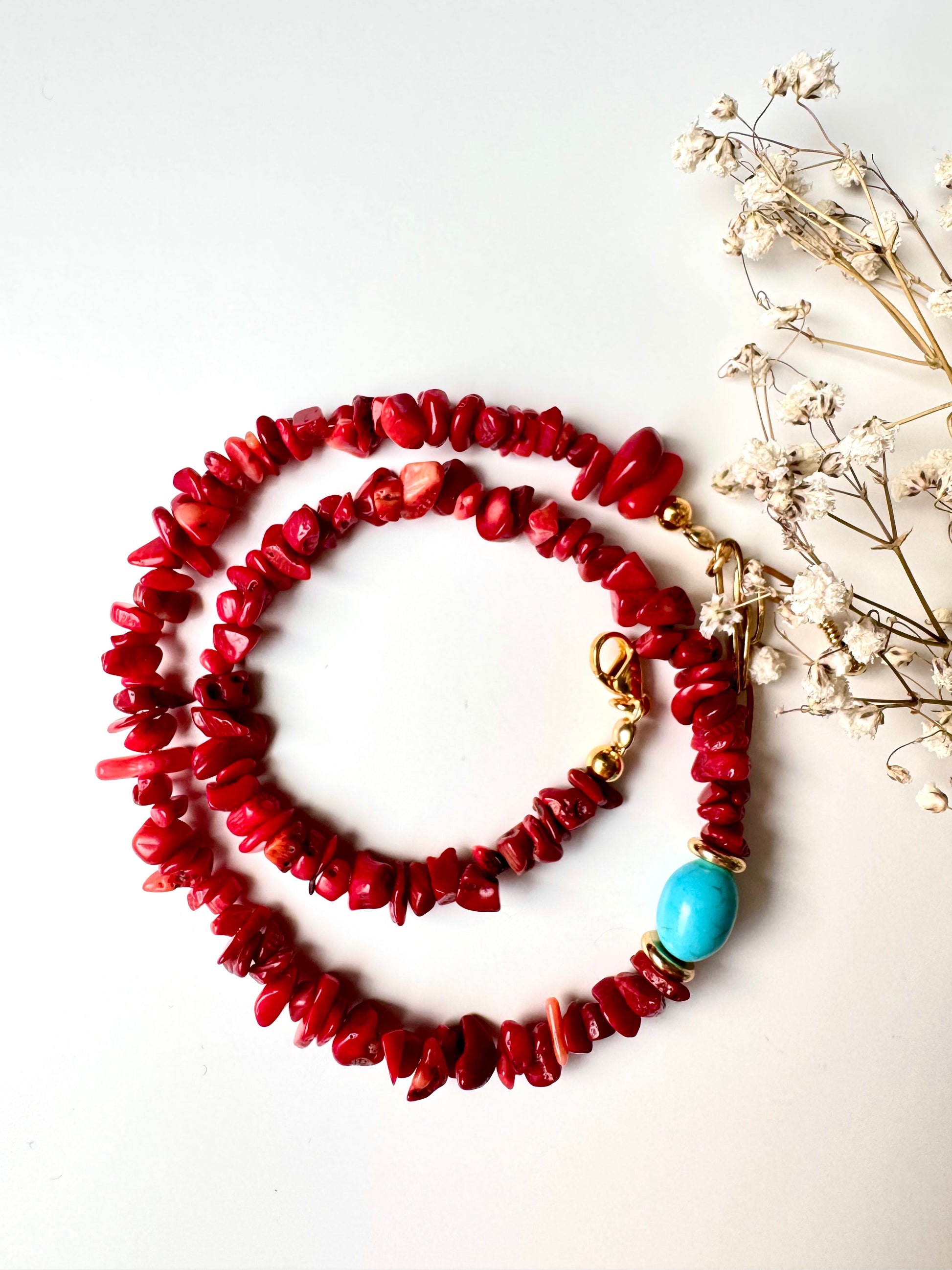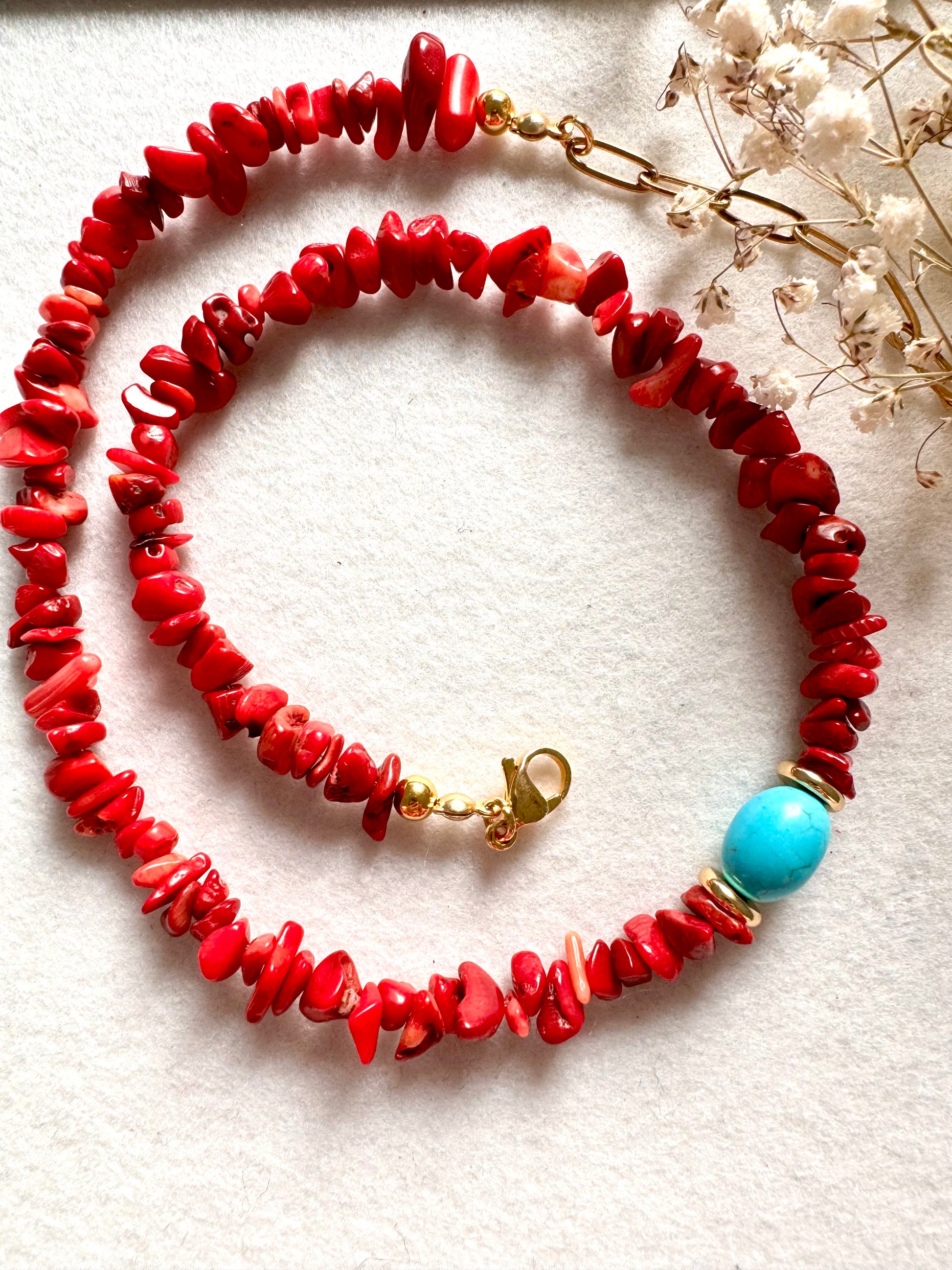 Korallen-Halskette mit türkisfarbener Perle & goldenen Details – handgefertigt