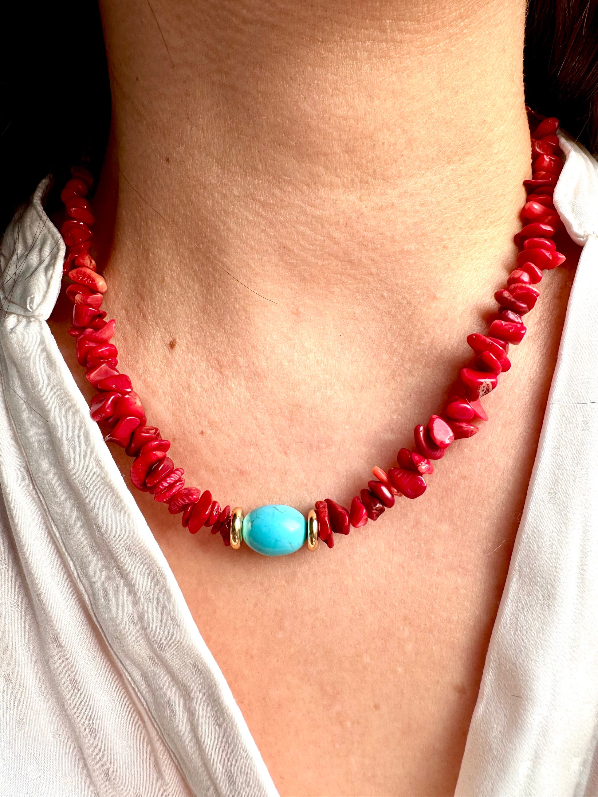 Diese auffällige Halskette kombiniert leuchtend rote Korallenstücke mit einer türkisfarbenen Perle als Blickfang. Die intensive Mischung aus Rot und Türkis schafft einen warmen, mediterranen Look, der jedes Outfit sofort lebendiger wirken lässt. Goldene Details runden das Design elegant ab und machen die Halskette zu einem besonderen Statement-Piece für Alltag und besondere Anlässe.